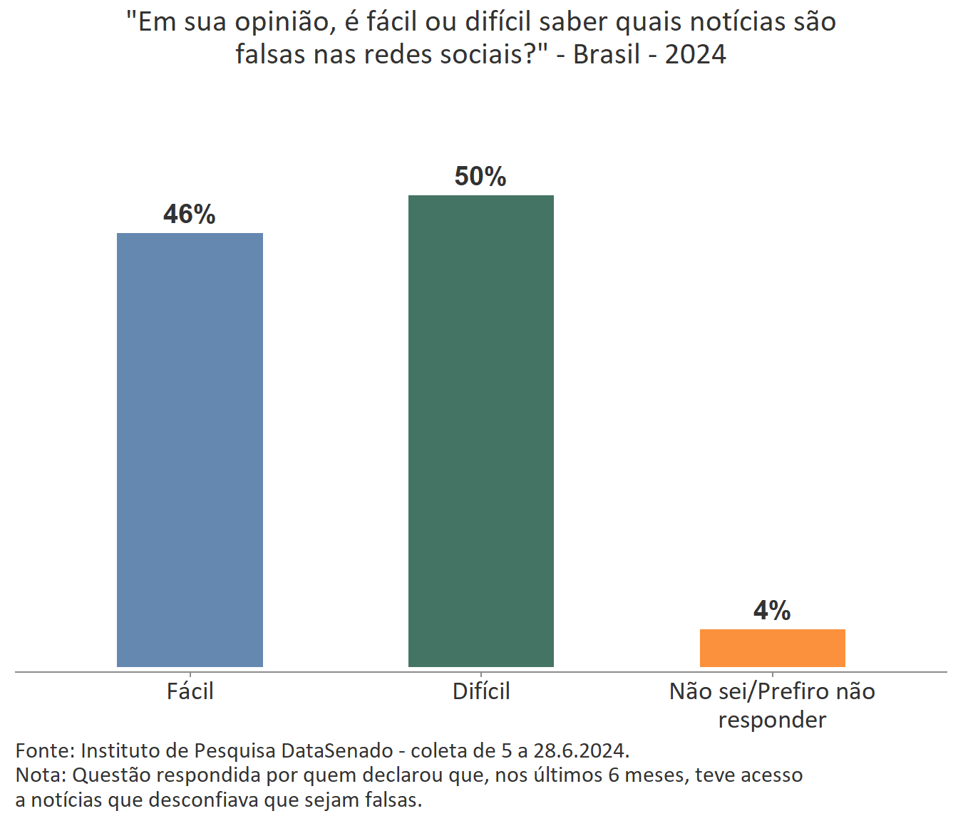 Quando questionados se acham fácil ou difícil saber quais notícias são falsas nas redes sociais, metade dos brasileiros que acessaram notícias falsas (50% ou 56.274.612 pessoas) considera ser difícil avaliar se uma notícia é falsa ou verdadeira, enquanto outros 46% (52.301.136) consideram fácil realizar esta verificação.