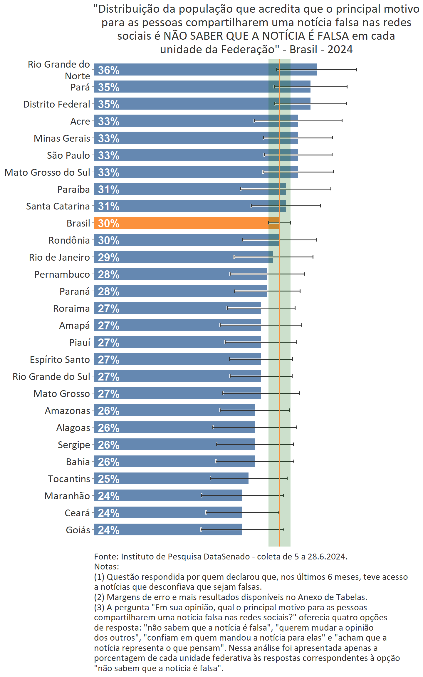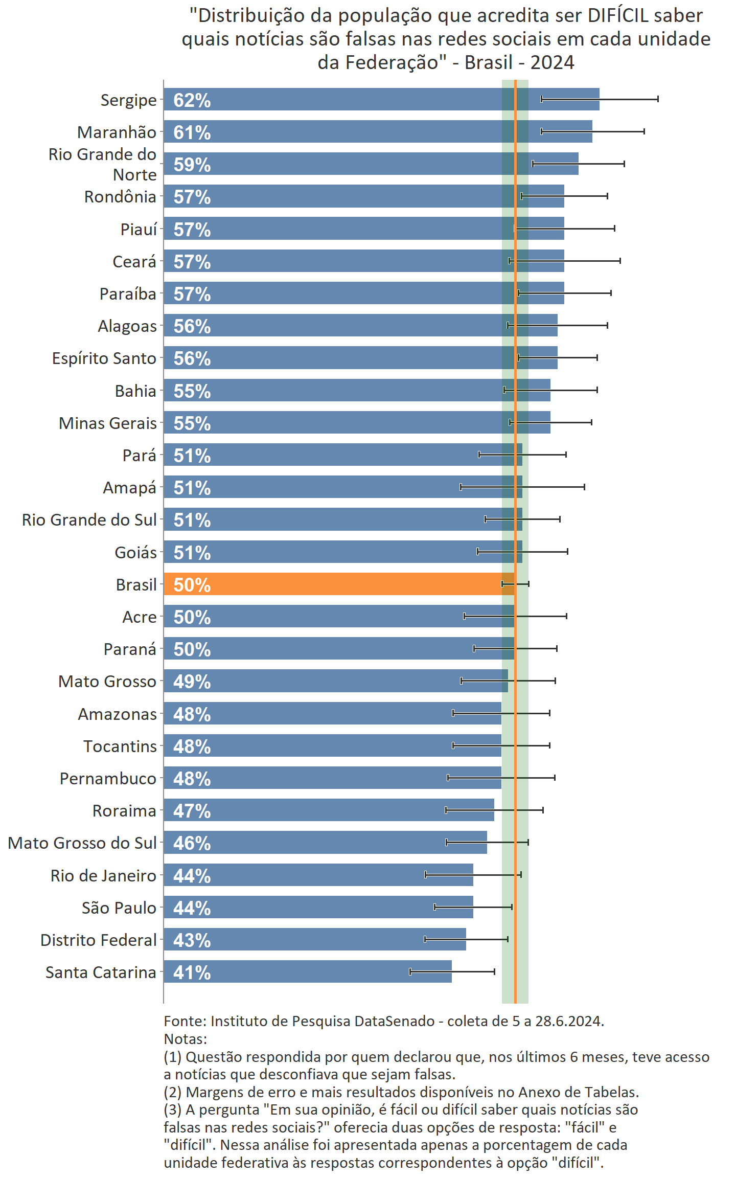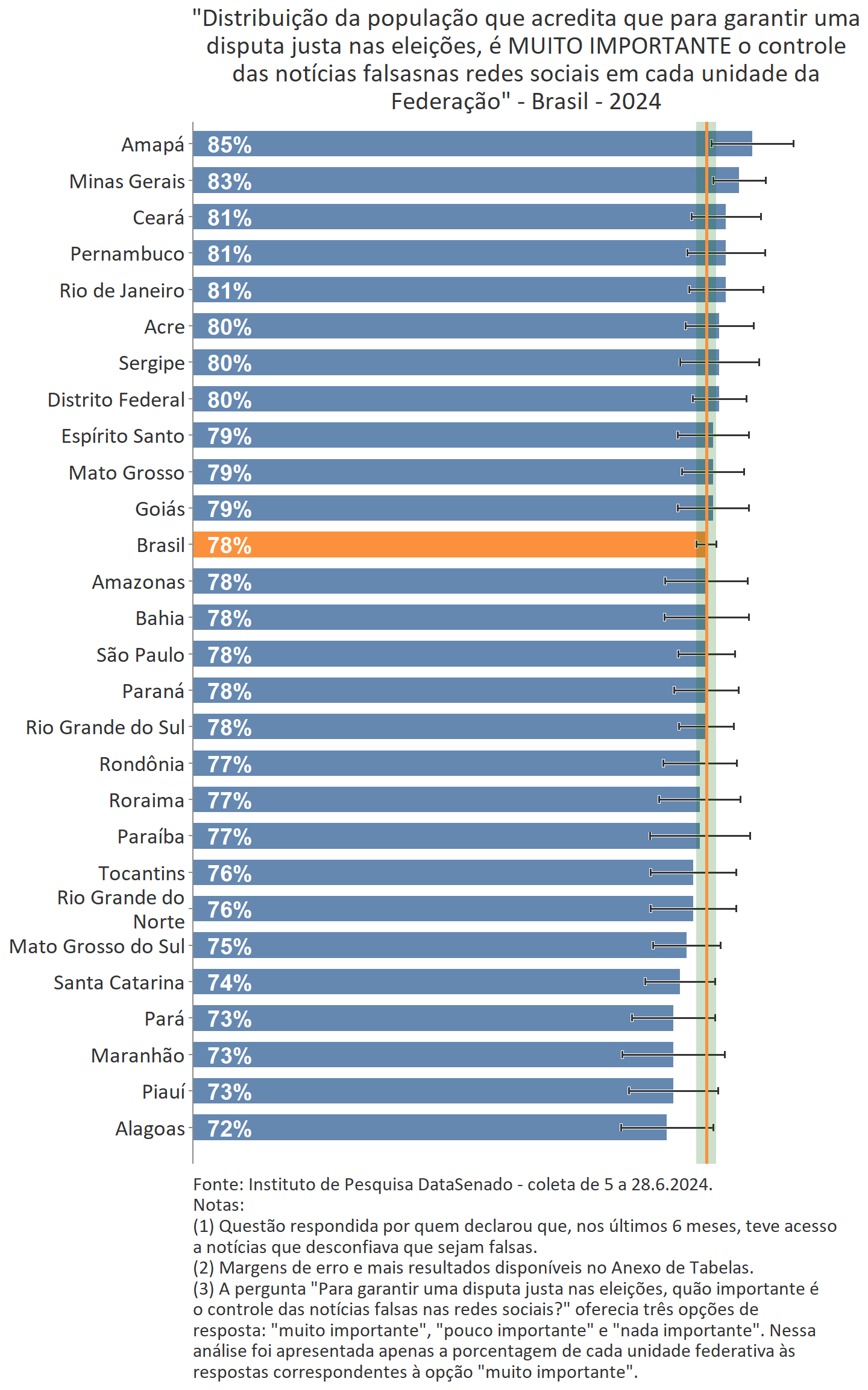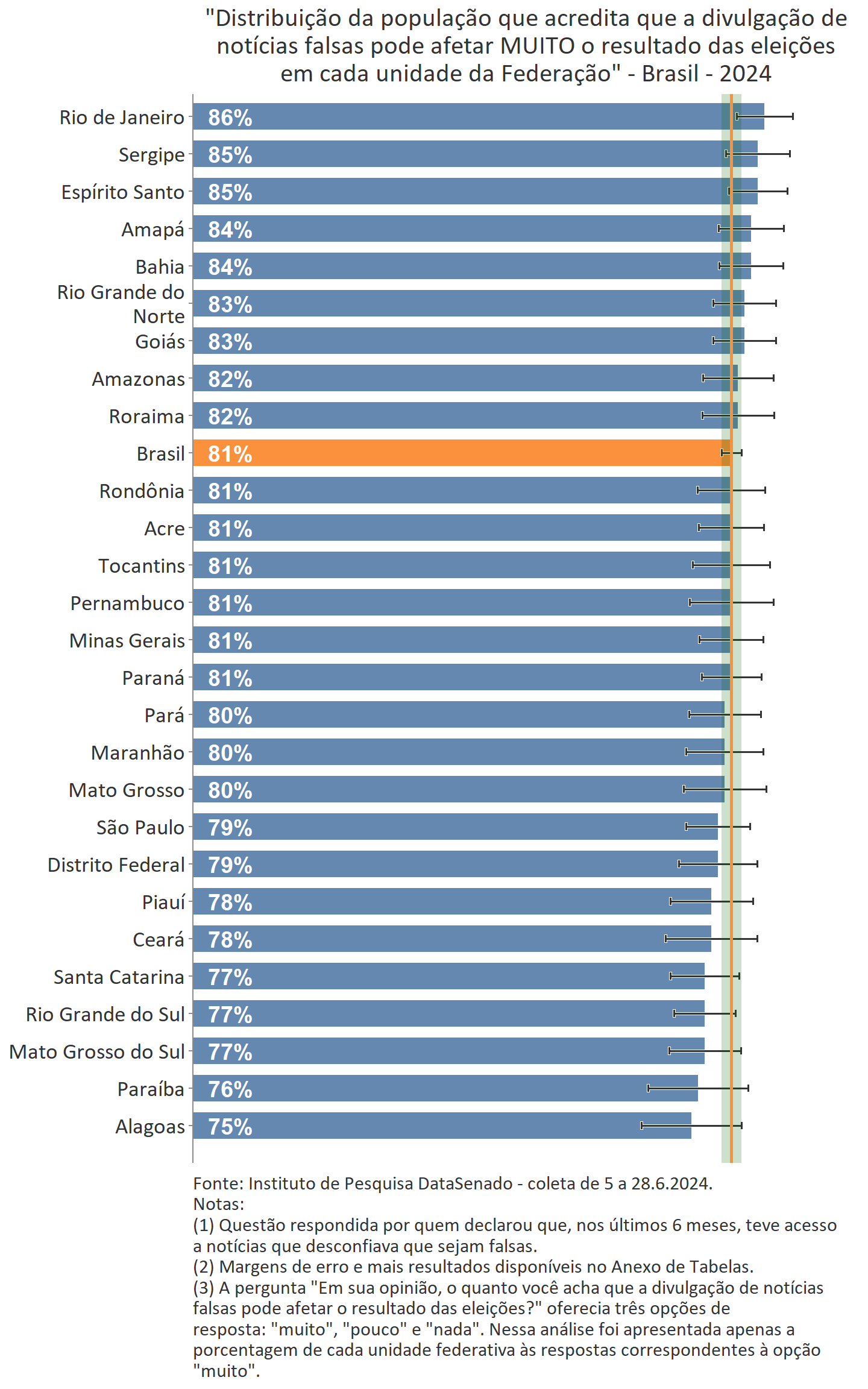 A ampla percepção do forte impacto das notícias falsas no resultado de eleições é transversal pelo país e equivalente, consideradas as margens de erro, entre todos os estados e o distrito federal.