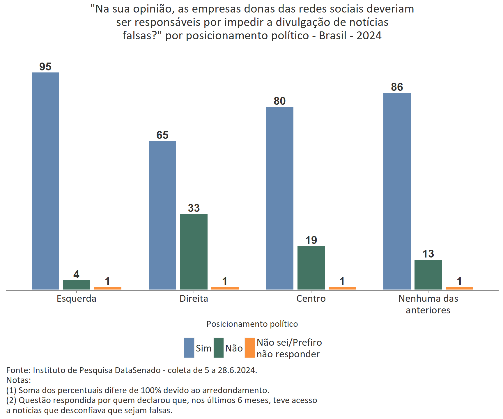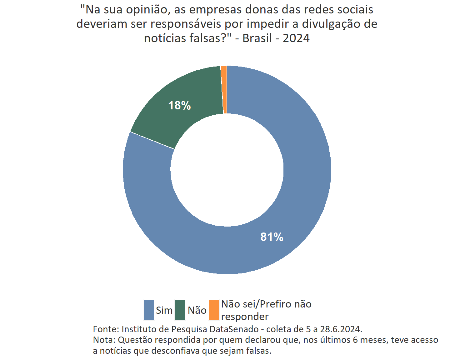 Para a ampla maioria dos brasileiros (81% ou 91.943.650 pessoas) que teve acesso a notícias falsas nos últimos 6 meses, as plataformas de redes sociais deveriam ser responsáveis por impedir sua divulgação, enquanto 18% (20.146.445) acreditam que não deveriam ser responsáveis por isto.