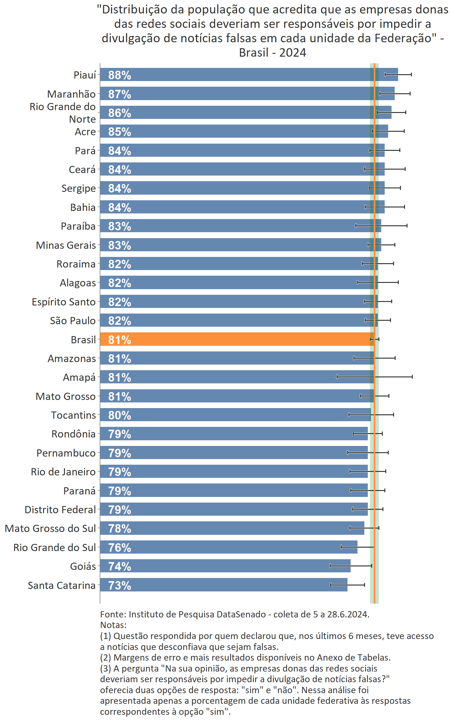 Santa Catarina é o único ente federado onde a concordância (73%) com a responsabilização das plataformas de redes sociais na contenção de notícias falsas é menor do que esta média nacional, consideradas as margens de erro.
