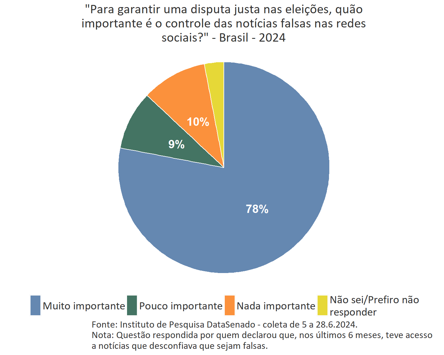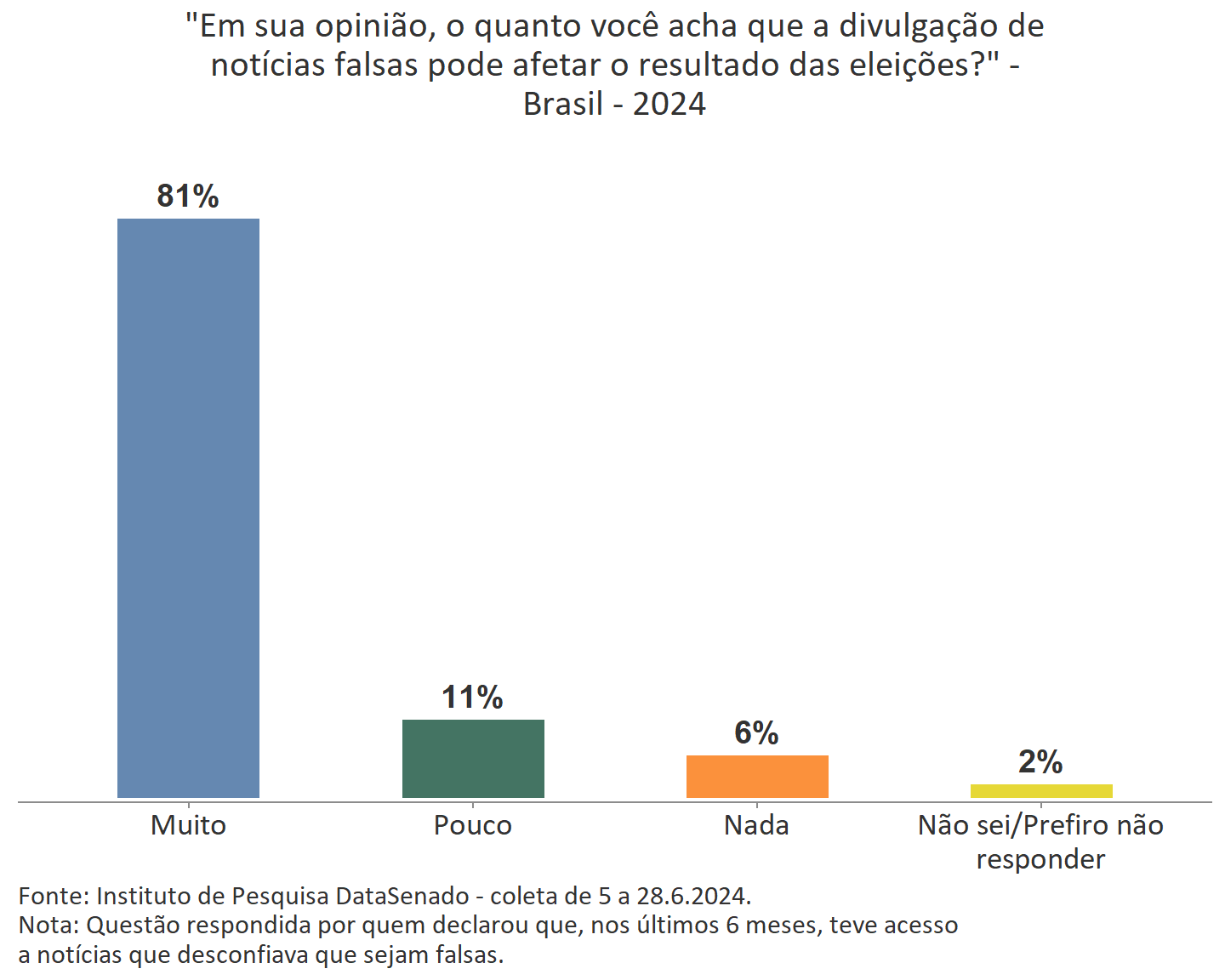 Em conclusão, a pesquisa do DataSenado evidencia a crescente preocupação dos brasileiros com a disseminação de notícias falsas e a percepção dos impactos na democracia. Esclarece também o respaldo da opinião pública na cobrança de responsabilidade das plataformas de redes sociais em sua contenção e o apoio para uma regulamentação eficaz no contexto eleitoral.
