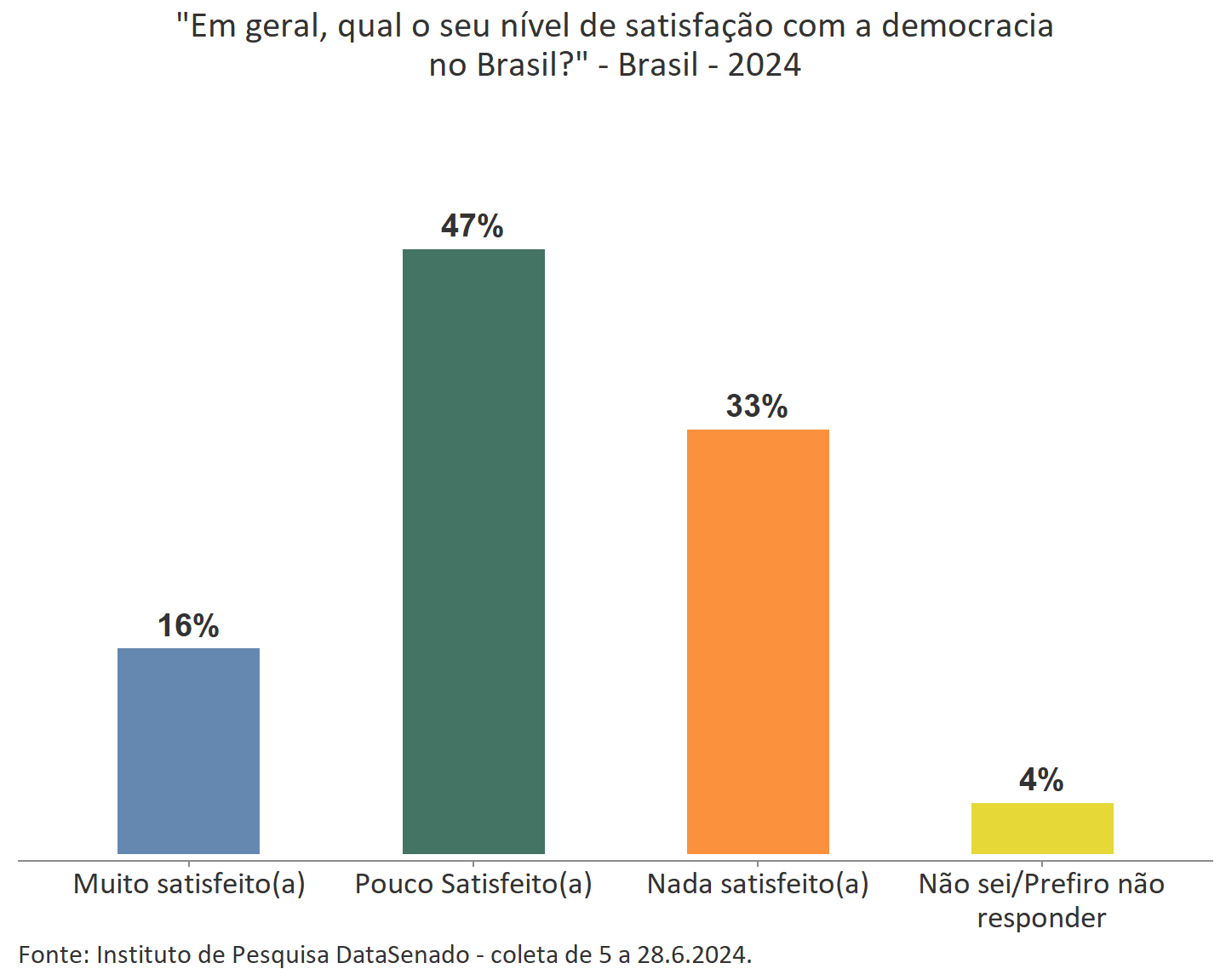 Quando questionados sobre “qual o seu nível de satisfação com a democracia no Brasil”, um terço (33% ou 55.566.137 pessoas) diz estar “Nada satisfeito” enquanto 47% (79.135.892 pessoas) se consideram “Pouco satisfeitos” e 16% (27.534.287) “Muito satisfeitos”.