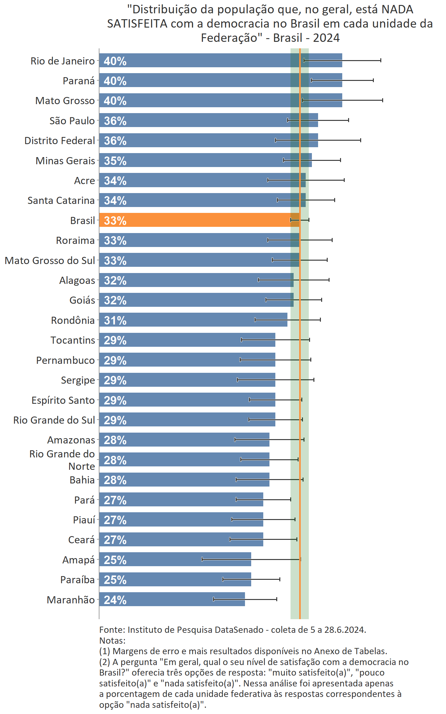 Apenas os resultados do Paraná têm proporção de insatisfação (40%) com a democracia acima da média nacional, consideradas as margens de erro.