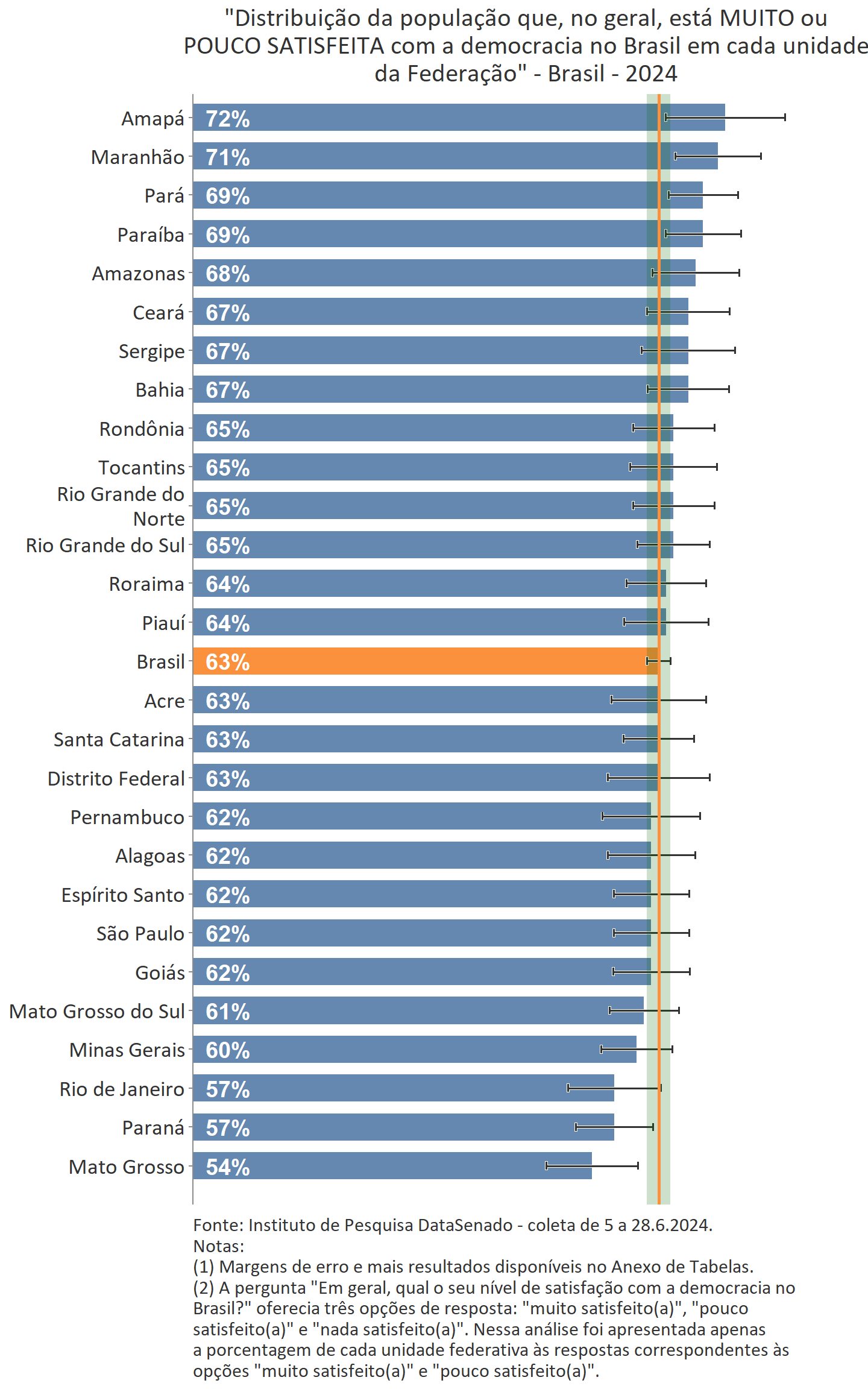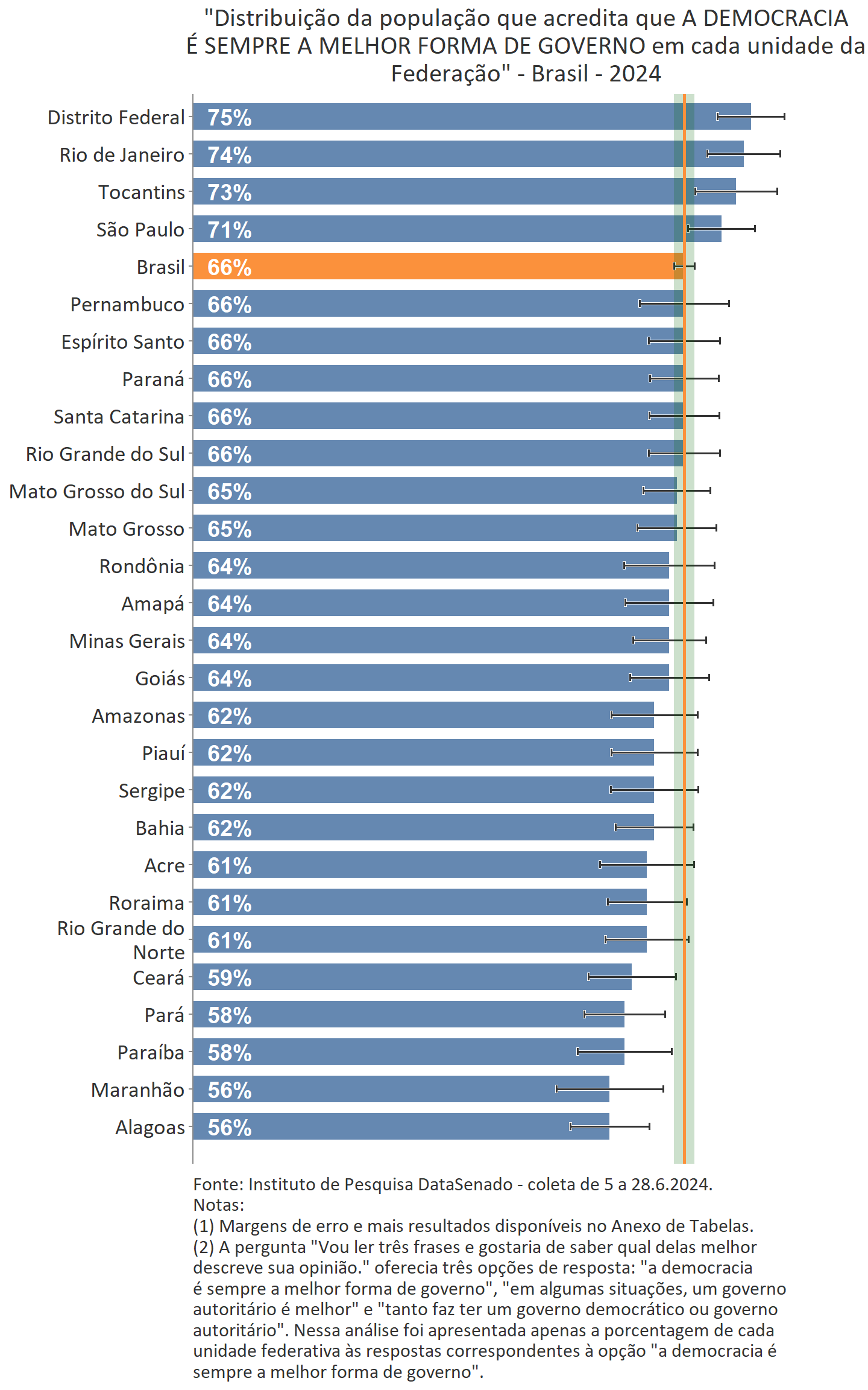 O Distrito Federal (75%), Rio de Janeiro (74%) e Tocantins (73%) apresentam os maiores níveis de apoio à democracia, acima da média nacional (66%), consideradas as margens de erro.