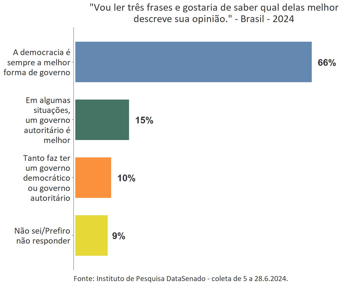 Quando solicitados a avaliar “qual frase melhor descreve a sua opinião”, entre frases que revelam a preferência por governos democráticos ou autoritários, dois terços da população brasileira (66% ou 111.825.939 pessoas) acreditam que “A democracia é sempre a melhor forma de governo”, enquanto 15% (25.762.104 pessoas) escolhem a opção mais autoritária, “Em algumas situações, um governo autoritário é melhor”, e apenas 10% (16.517.157) mostram alguma indiferença, optando por “Tanto faz ter um governo democrático ou governo autoritário”.