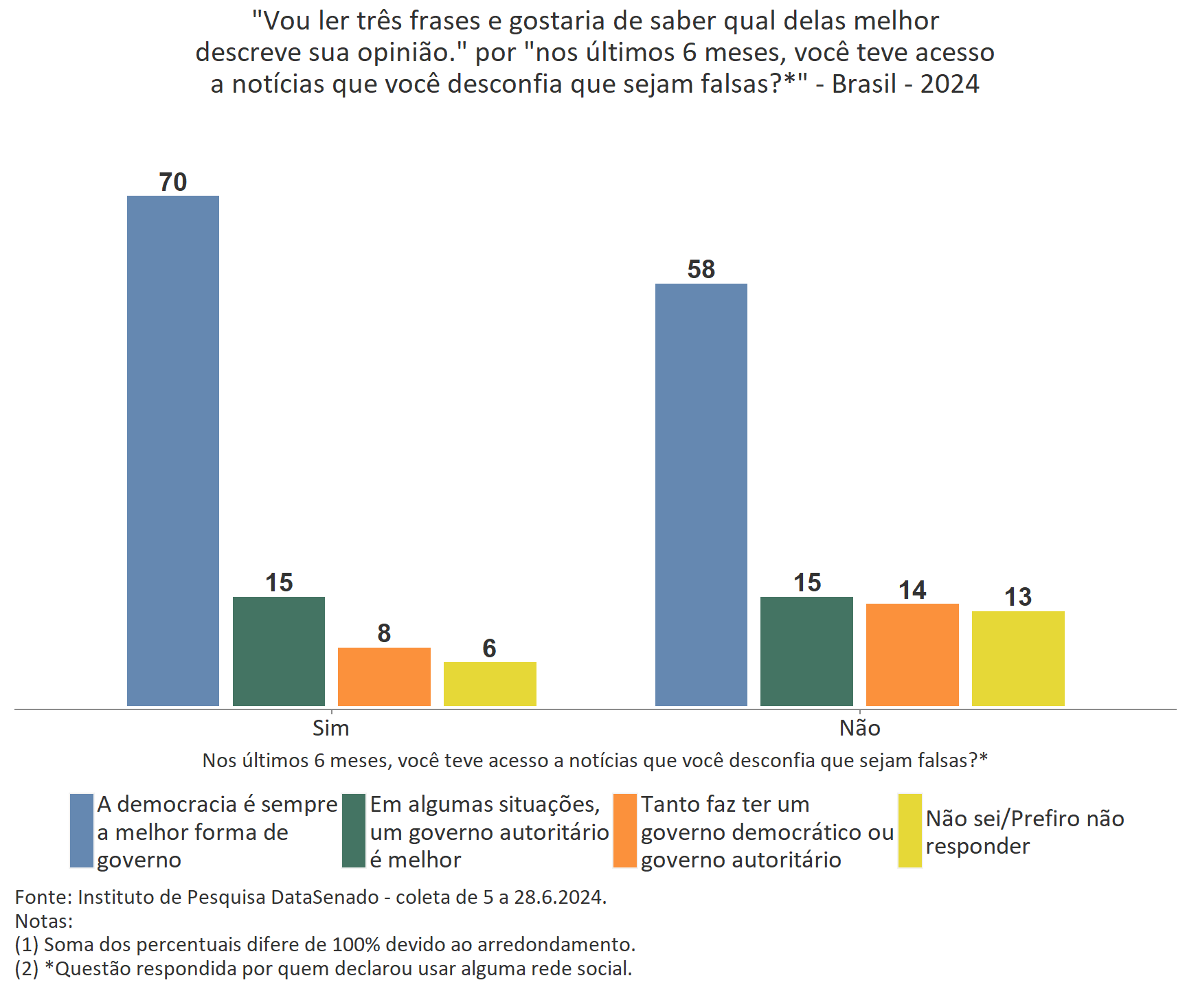 Explorando a associação entre o apoio à democracia e a percepção de exposição a notícias falsas, nota-se que, entre aqueles que disseram ter tido acesso a notícias que desconfiam ser falsas nos últimos 6 meses, 70% acreditam que a “A democracia é a melhor forma de governo” contra 58% entre aqueles que dizem não ter tido acesso a estas notícias.