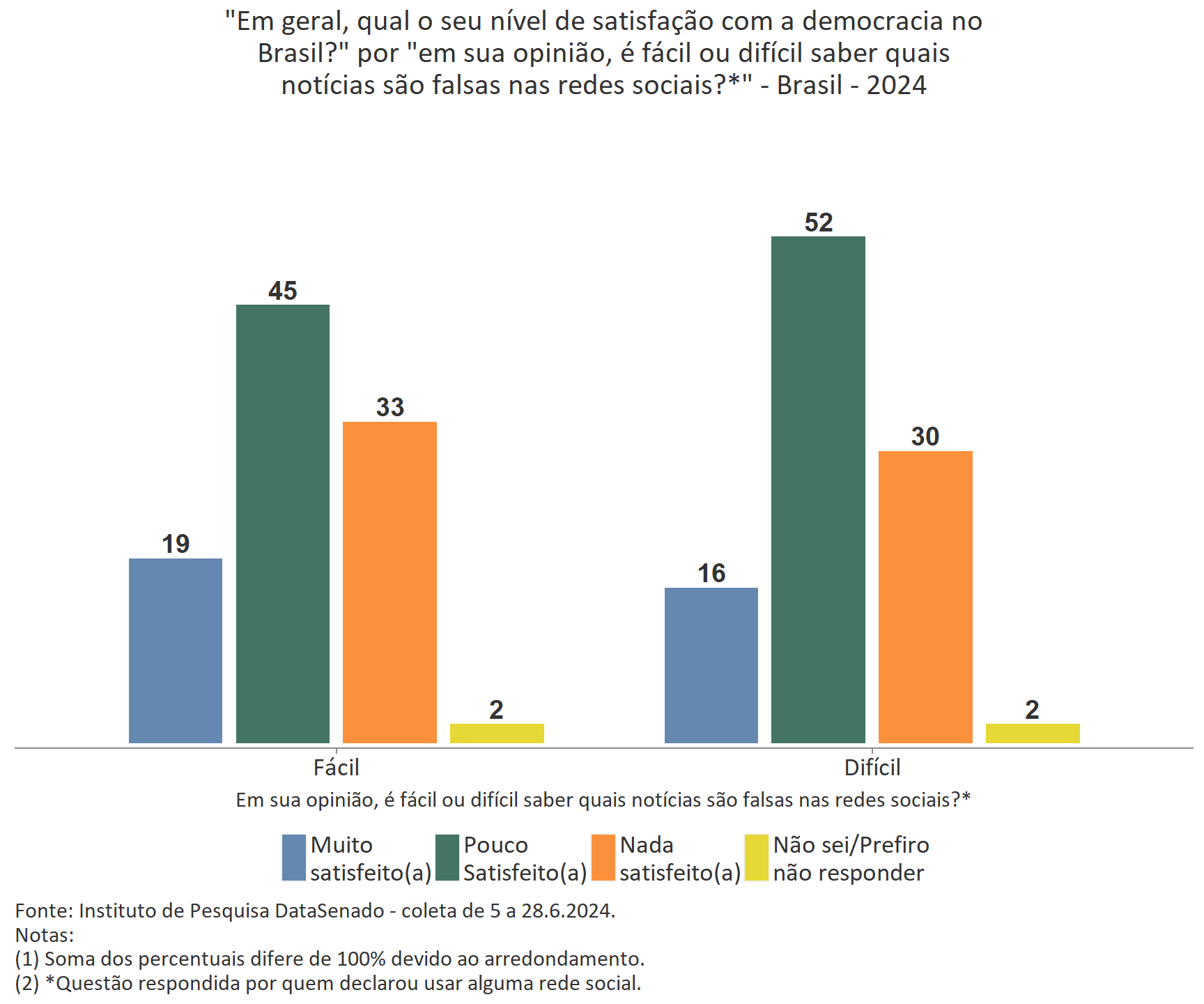 Em relação a satisfação com a democracia, há aumento dos poucos satisfeitos, de 45% para 52%, entre os que consideram “Difícil” saber quais notícias são falsas nas redes, embora não se note diferença significativa nos demais níveis de satisfação.