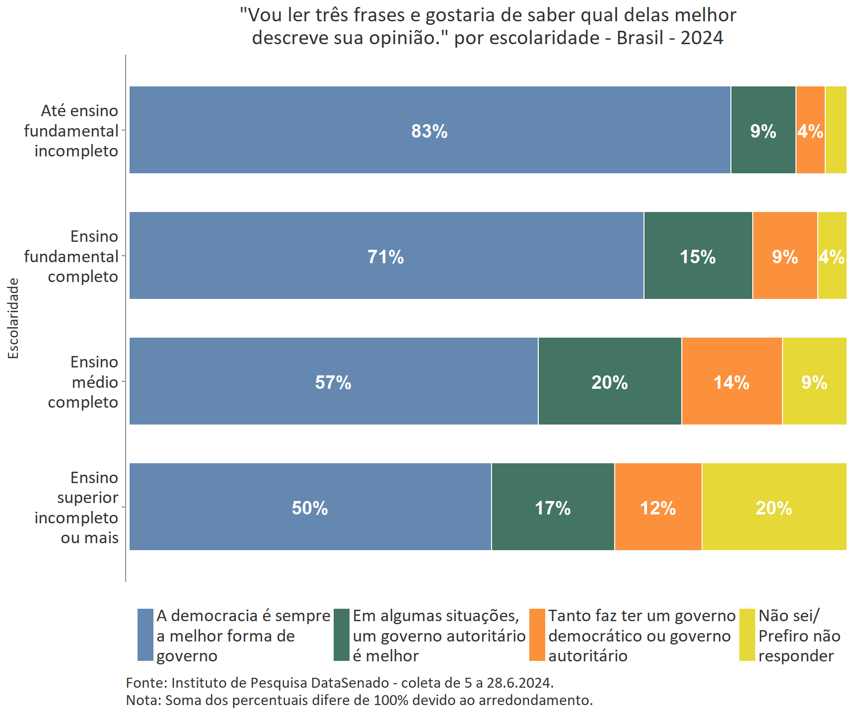 Entre os entrevistados que possuem ensino superior completo o apoio à democracia como melhor forma de governo atinge 83%, enquanto apenas 9% consideram que em algumas situações um governo autoritário é melhor.