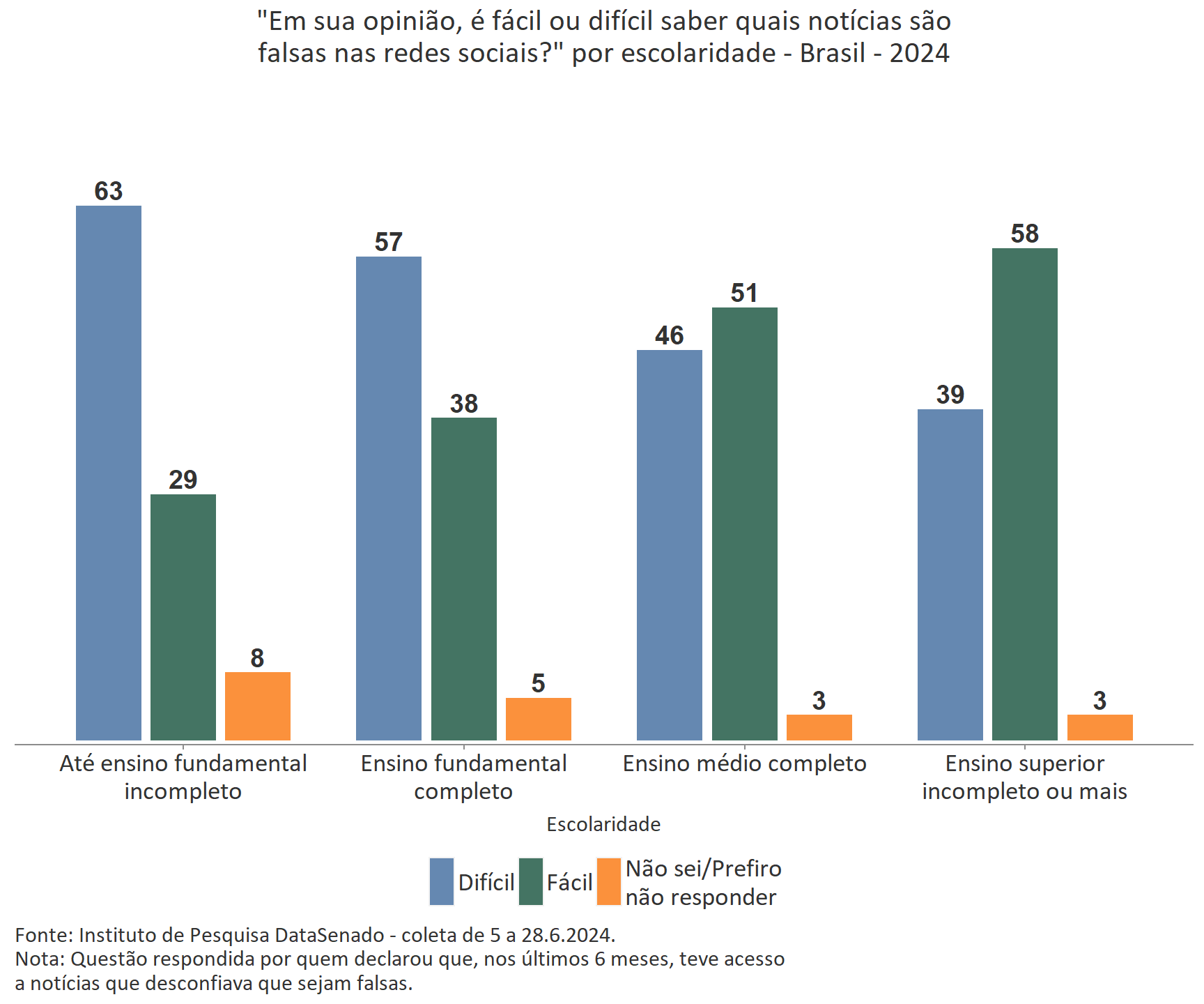 Um menor nível de escolaridade torna mais difícil se identificar notícias falsas nas redes sociais, visto que 63% daqueles com escolaridade até o fundamental incompleto consideram difícil saber quais notícias são falsas nas redes sociais, enquanto 39% informam esta dificuldade entre os que possuem ensino superior completo.