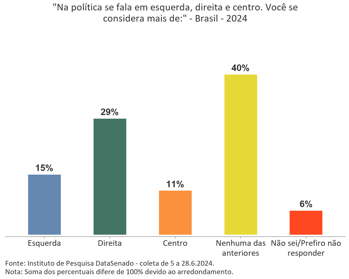 Ao investigar o posicionamento político dos brasileiros entre “Centro”, “Direita”, “Esquerda” ou “Nenhuma das anteriores”, 40% (68.189.446 pessoas) se declaram como “Nenhuma das anteriores”, 29% (48.869.676) como de “Direita”, 15% (24.633.022) de “Esquerda” e 11% (18.244.885) de “Centro”, mostrando que a polarização política, embora exista, não atinge a maioria dos brasileiros.