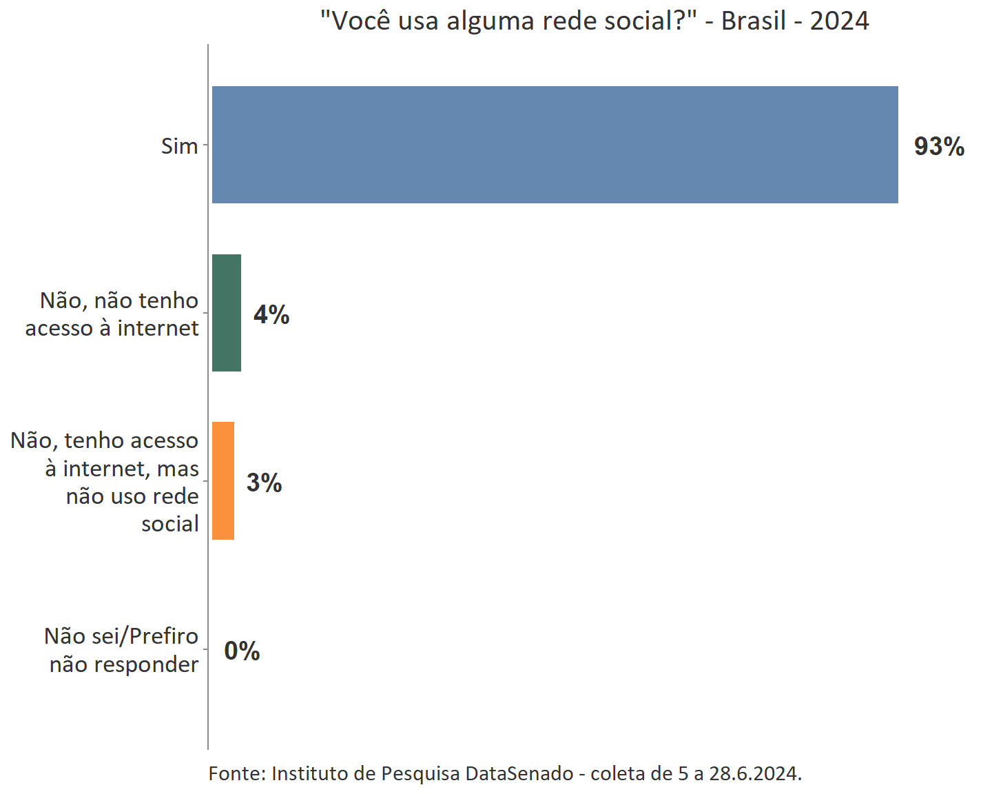 O primeiro passo desta investigação foi descobrir qual proporção da população brasileira usa alguma rede social, incluindo aplicativos de mensagens como Whatsapp ou Telegram, correspondendo a 93% (158.190.615 pessoas), a ampla maioria.