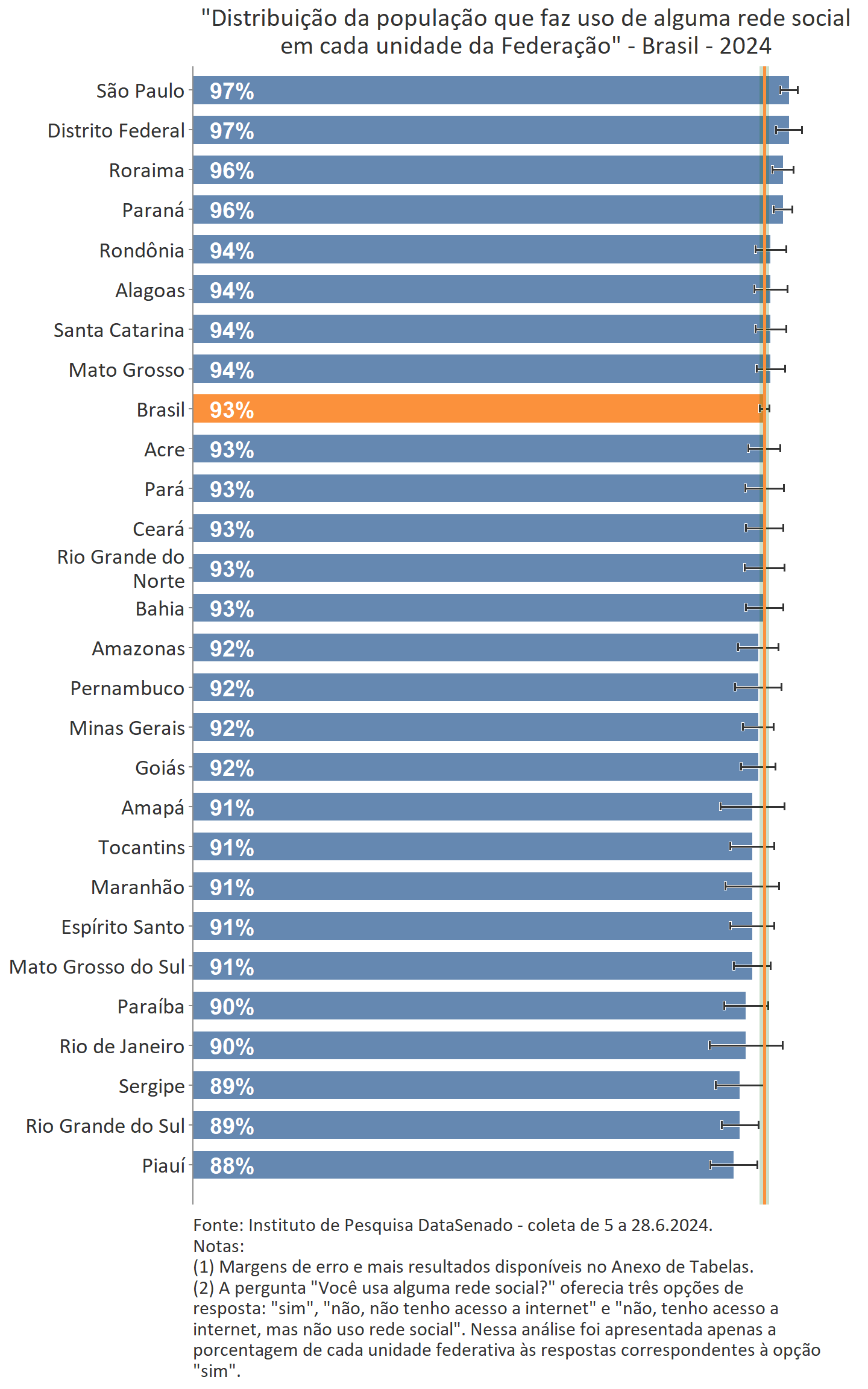 Enquanto São Paulo, Distrito Federal, Roraima e Paraná têm proporções de pessoas que fazem uso das redes sociais superiores à média nacional, consideradas as margens de erro, apenas Rio Grande do Sul e Piauí têm proporções inferiores a este patamar.