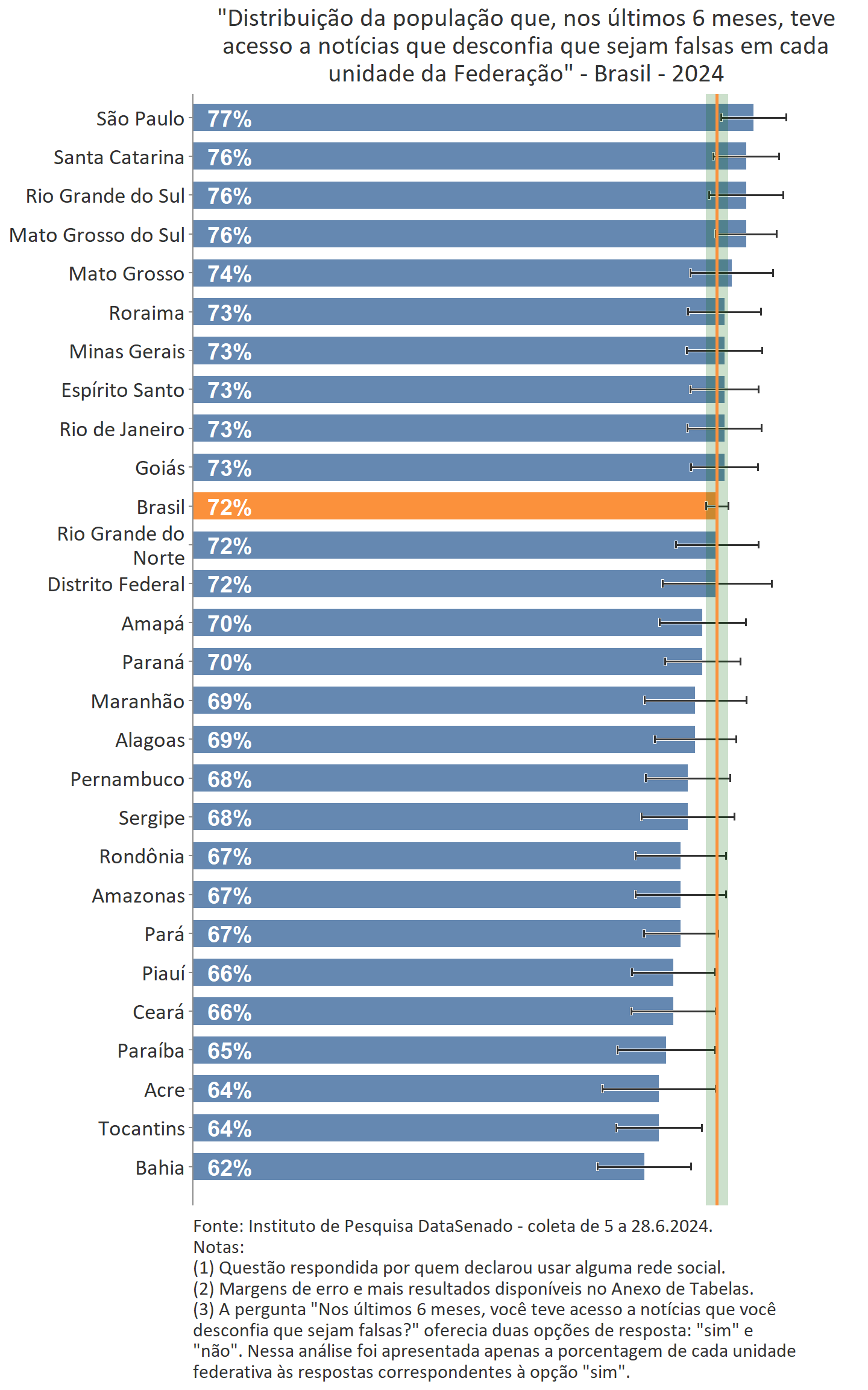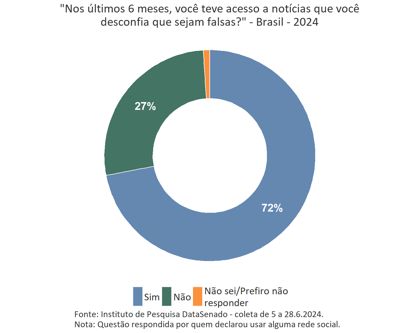 Entre os usuários de redes sociais, mais de sete em cada dez (72% ou 113.436.649 pessoas) afirmam ter tido acesso a notícias que desconfiam ser falsas nos últimos 6 meses, enquanto 27% (43.487.423 pessoas) não identificaram este tipo de notícia em suas redes.