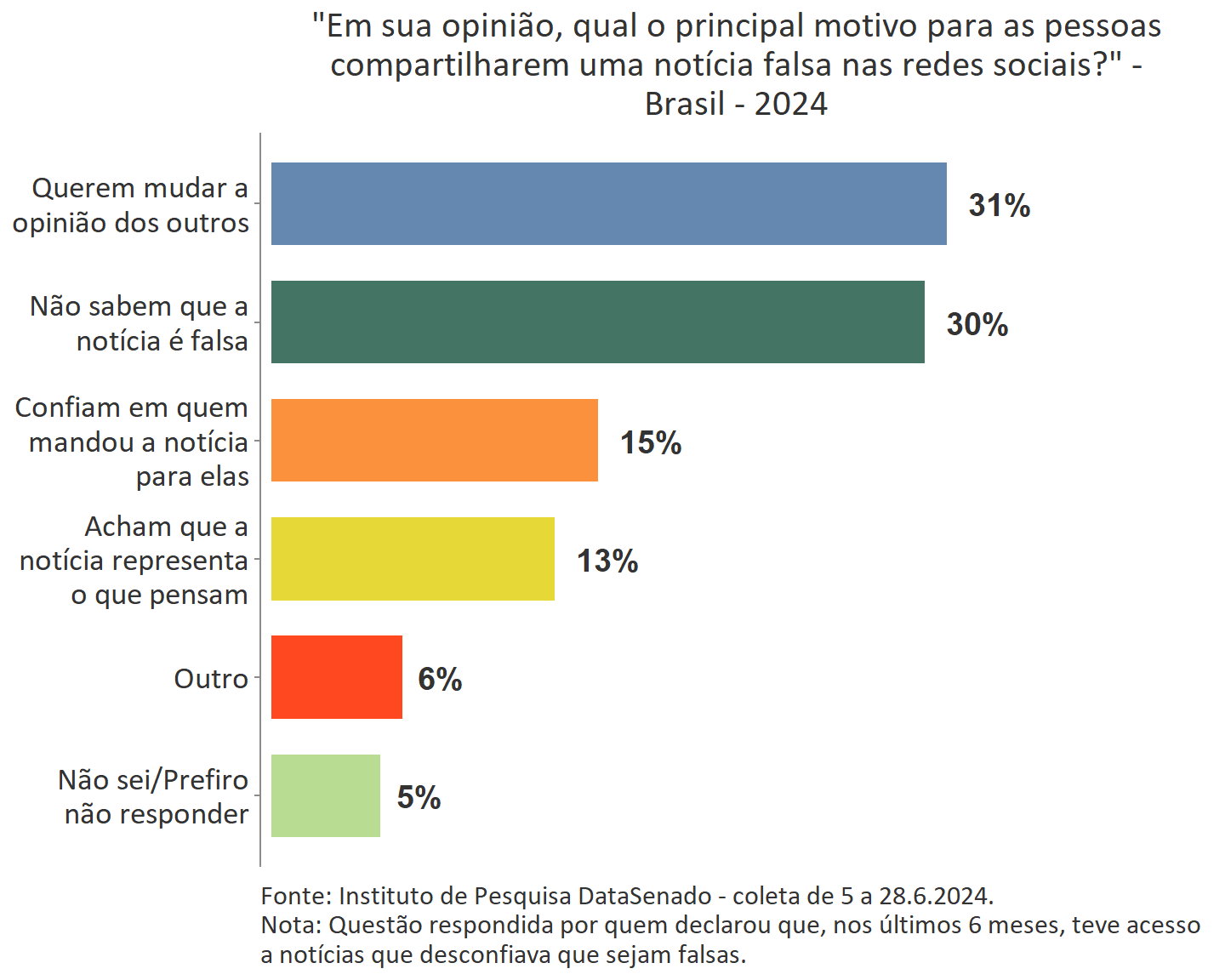 Na opinião dos brasileiros que tiveram acesso a notícias que desconfiam que sejam falsas, quase um terço (31% ou 34.960.274 pessoas) acredita que “as pessoas querem mudar a opinião dos outros” ao compartilharem uma notícia falsa nas redes sociais, patamar semelhante, considerada a margem de erro, aqueles que acreditam que as pessoas compartilham estas notícias por não saberem que a notícia é falsa (30% ou 33.994.970).