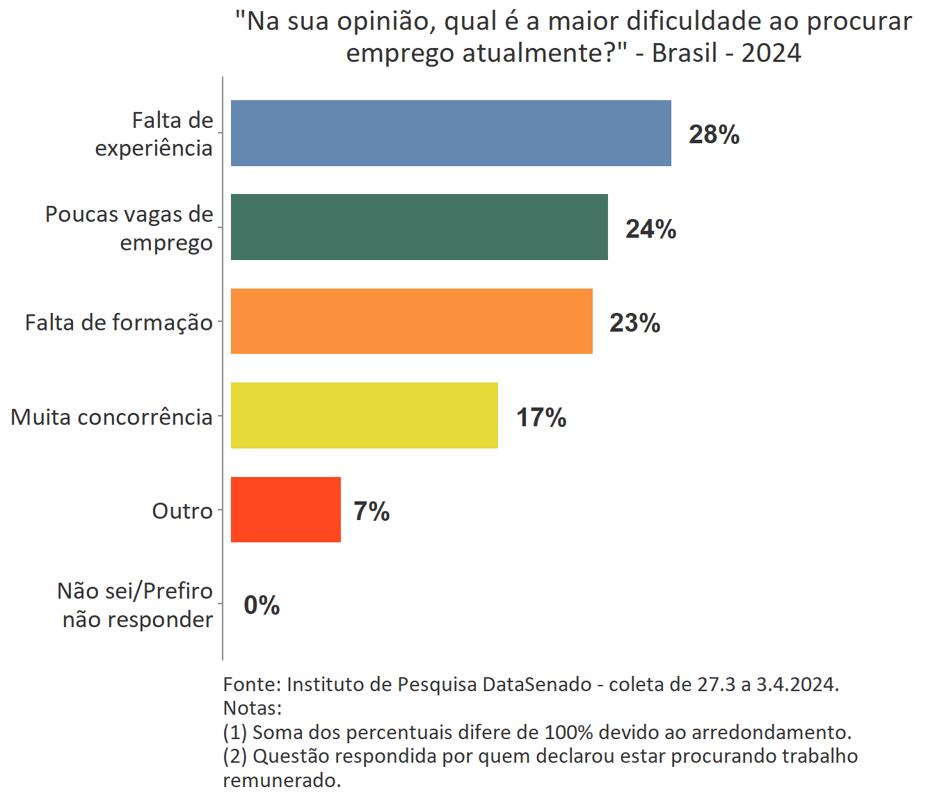 Quando perguntados sobre a maior dificuldade ao procurar emprego atualmente, 28% (5,9 milhões de brasileiros) apontam a falta de experiência; 24% (5,1 milhões de brasileiros), poucas vagas de emprego; 23% (4,9 milhões de brasileiros), falta de formação; e 17% (3,6 milhões de brasileiros), muita concorrência.