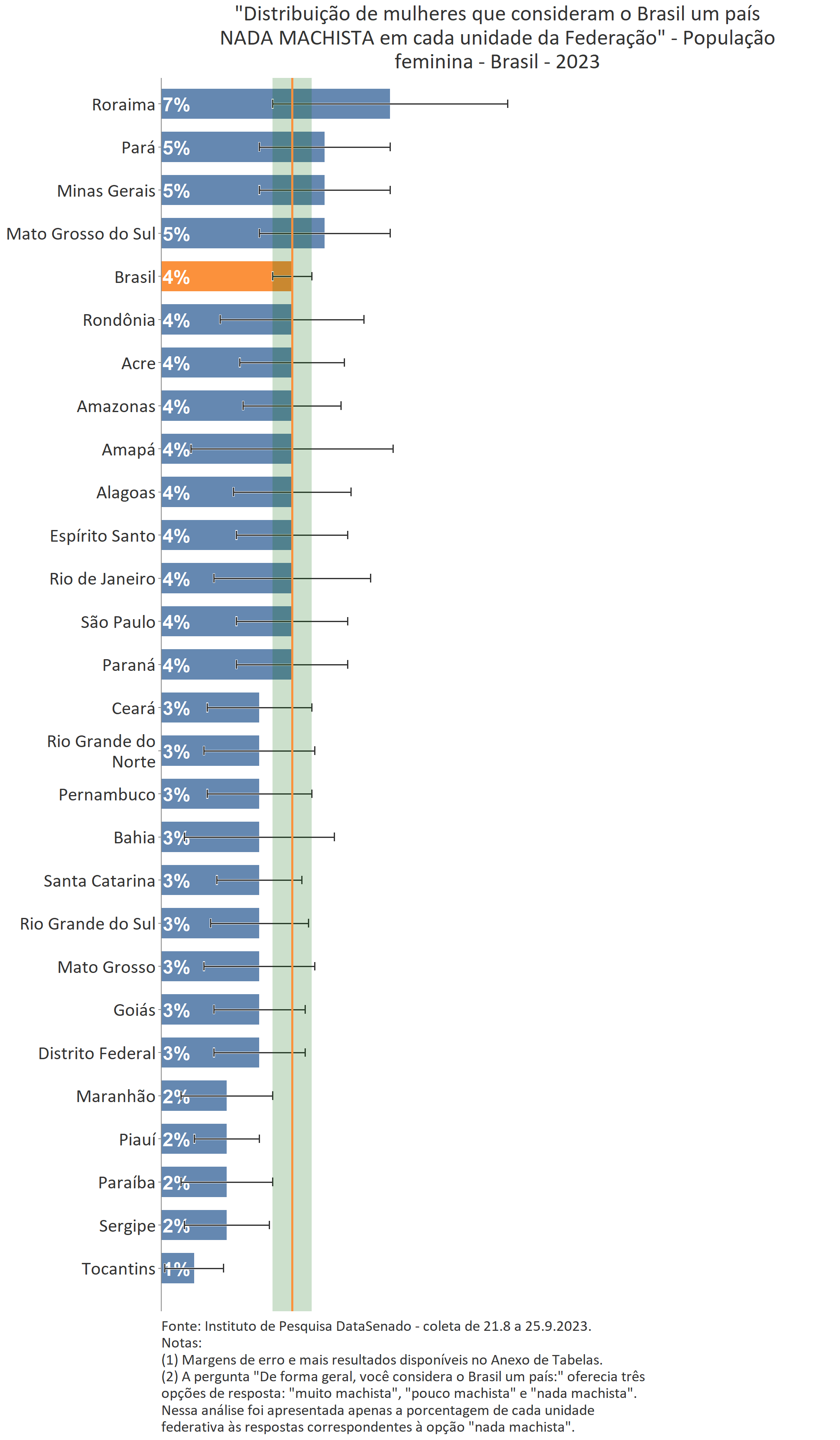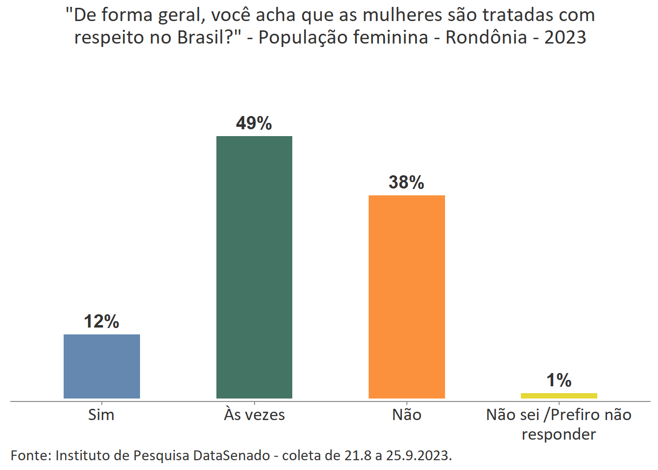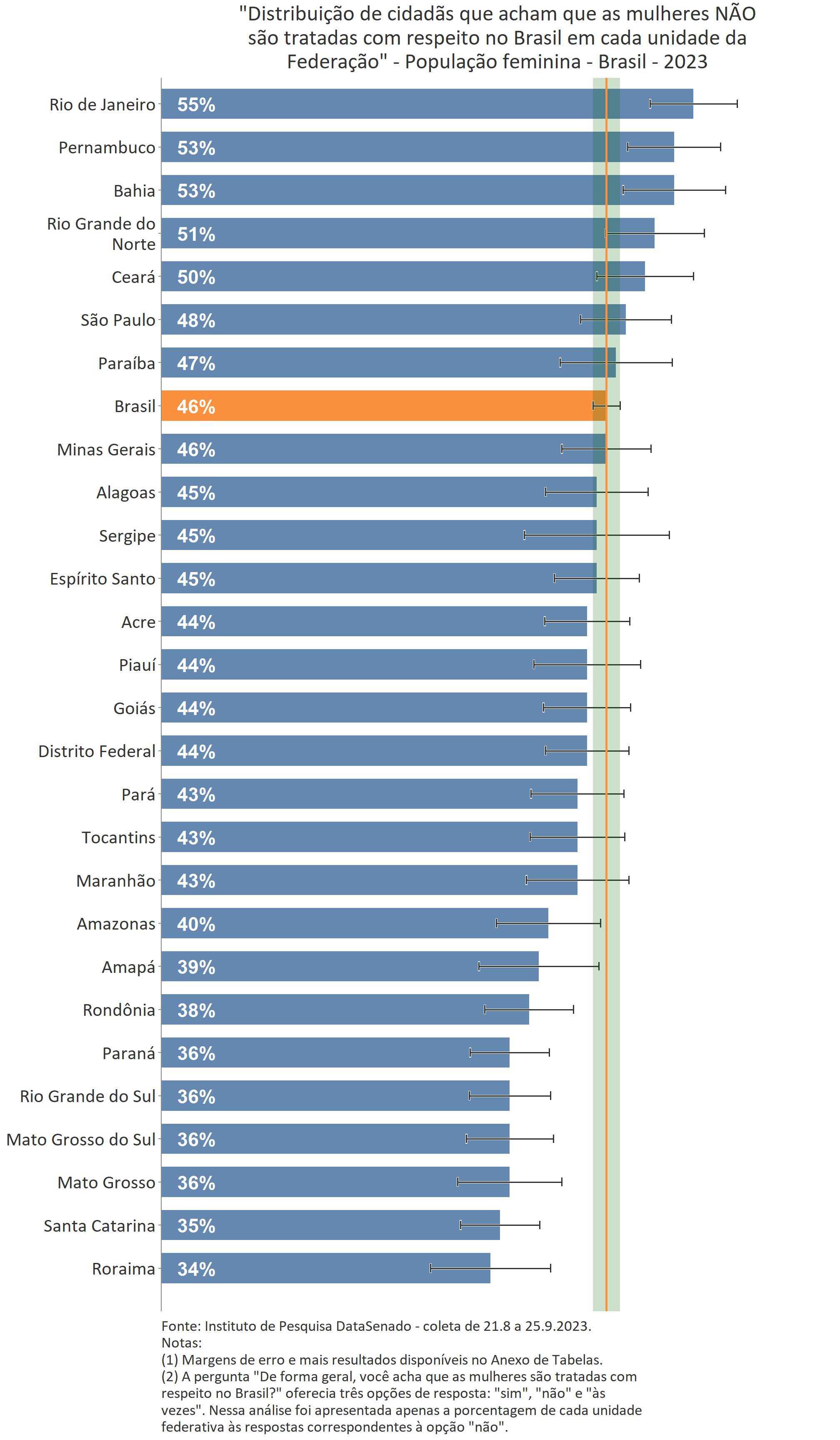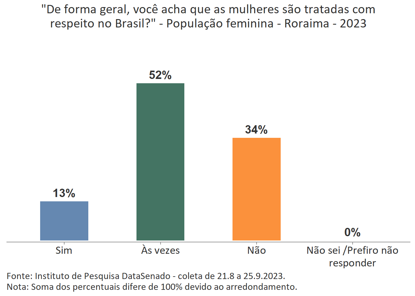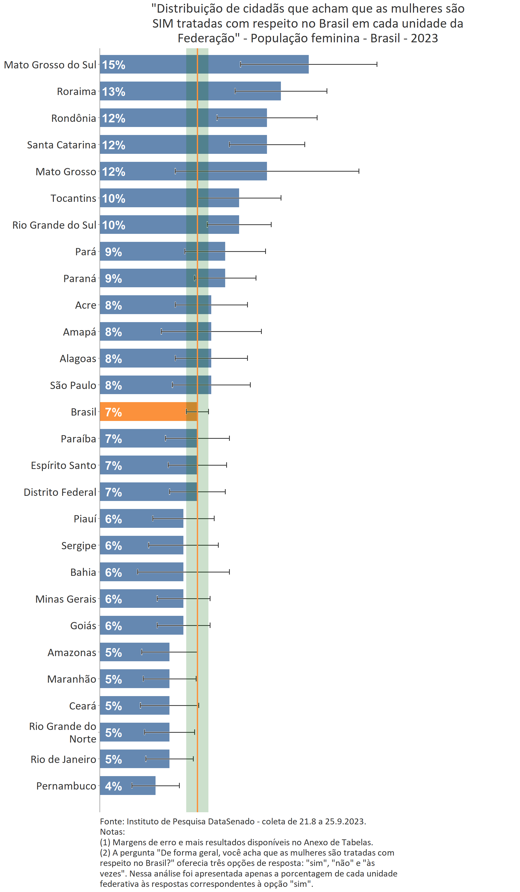 Ainda que a menor parte das cidadãs acredite que as mulheres são tratadas com respeito no Brasil, é interessante notar que nos estados de Mato Grosso do Sul, Roraima, Rondônia e Santa Catarina há uma parcela um pouco maior de cidadãs que percebem o Brasil como um país que respeita as mulheres. Nesses estados, o índice sobe de 7% (patamar nacional) para 15% (Mato Grosso do Sul), 13% (Roraima) e 12% (Rondônia e Santa Catarina)1.