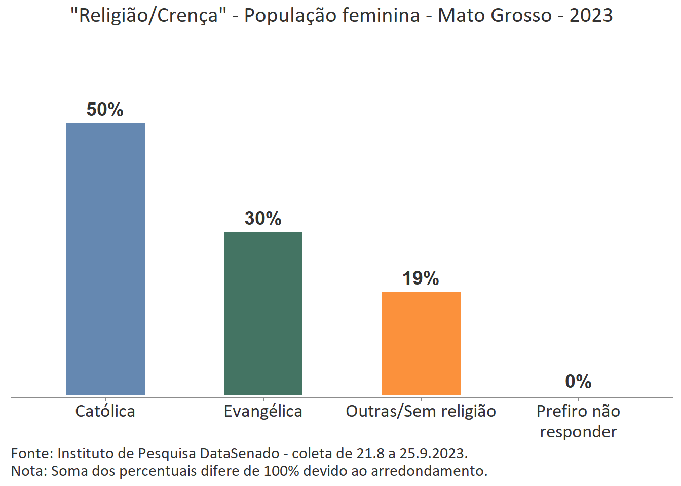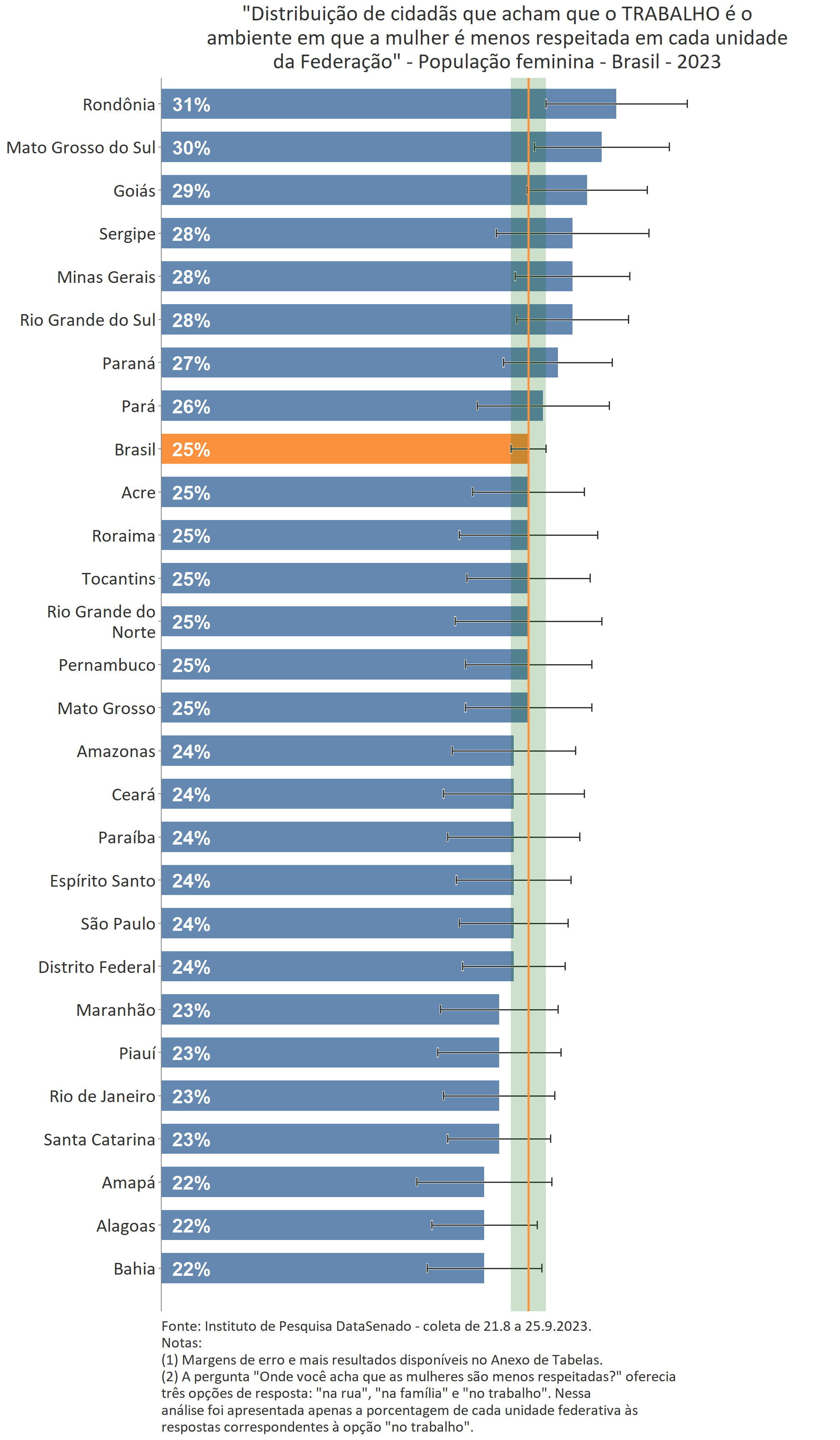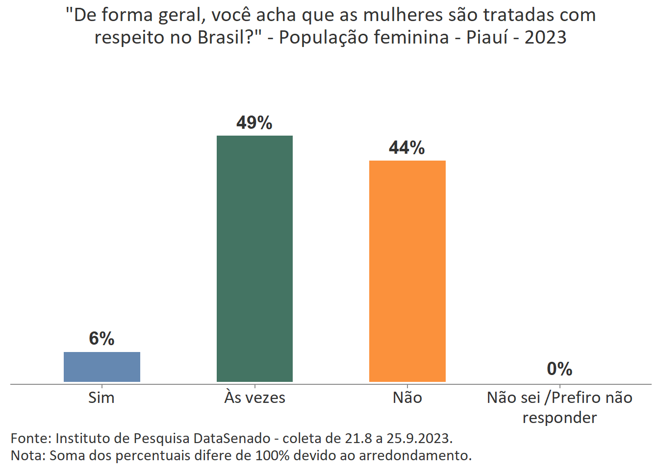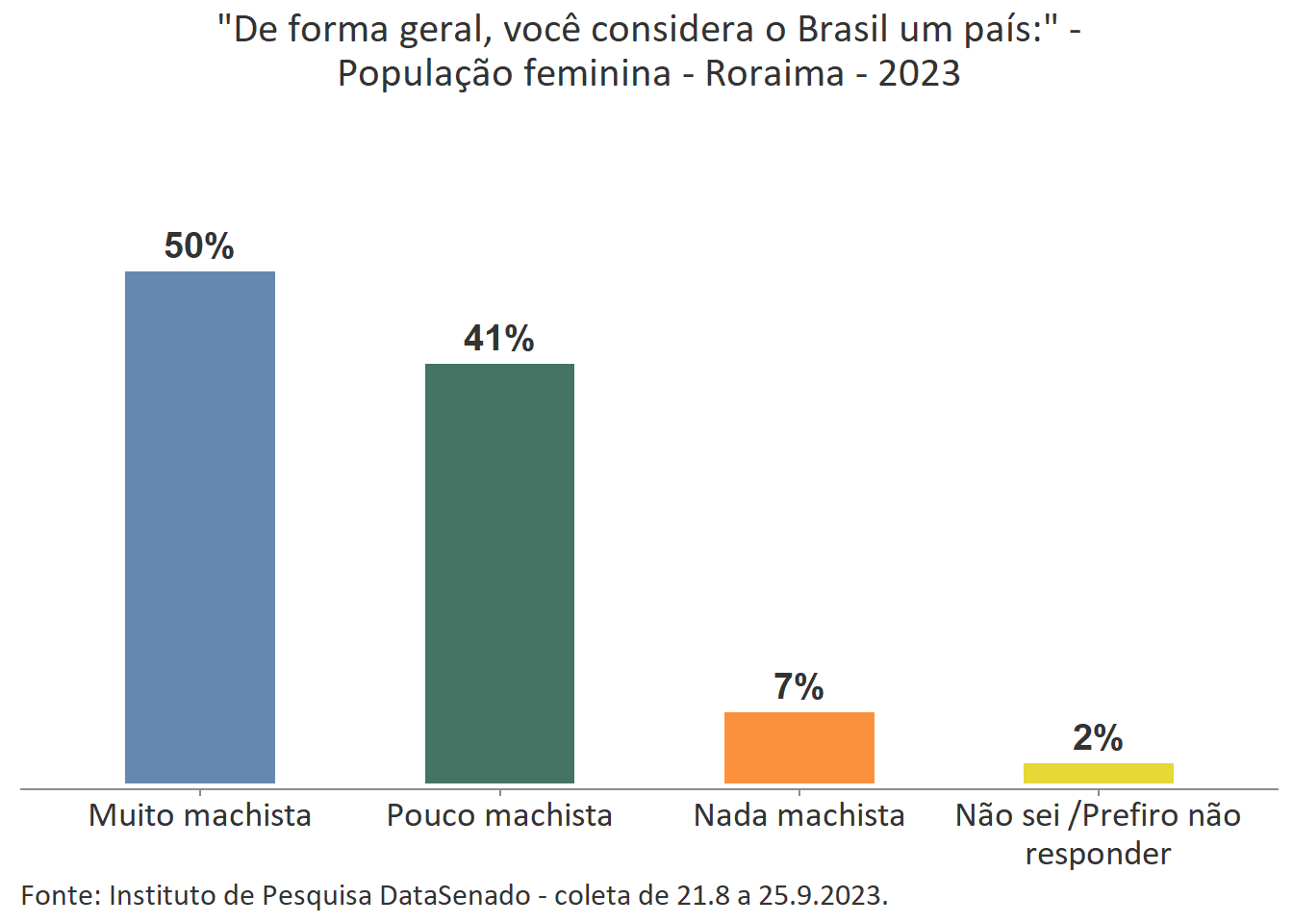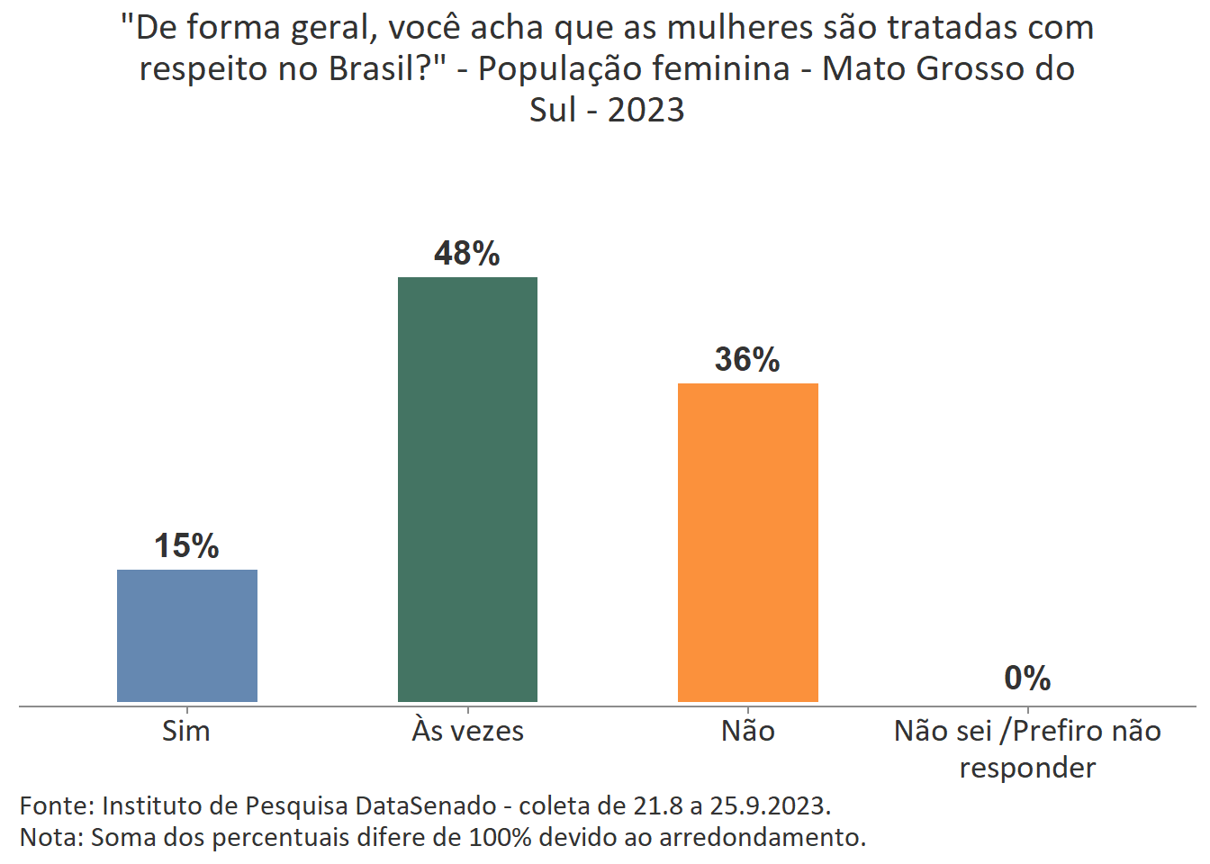 Ainda que a menor parte das cidadãs acredite que as mulheres são tratadas com respeito no Brasil, é interessante notar que nos estados de Mato Grosso do Sul, Roraima, Rondônia e Santa Catarina há uma parcela um pouco maior de cidadãs que percebem o Brasil como um país que respeita as mulheres. Nesses estados, o índice sobe de 7% (patamar nacional) para 15% (Mato Grosso do Sul), 13% (Roraima) e 12% (Rondônia e Santa Catarina)1.