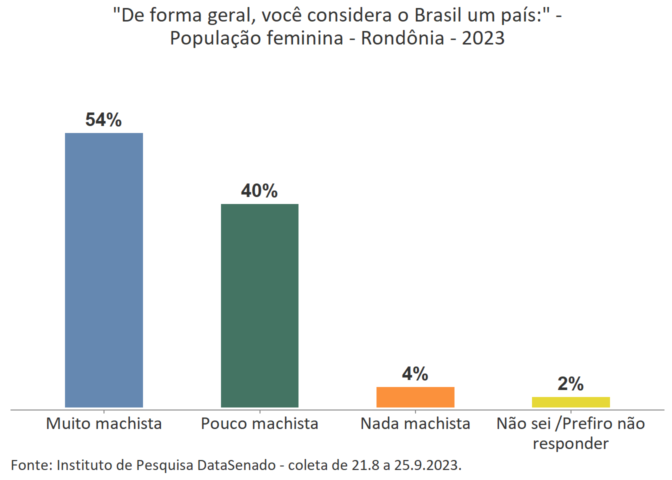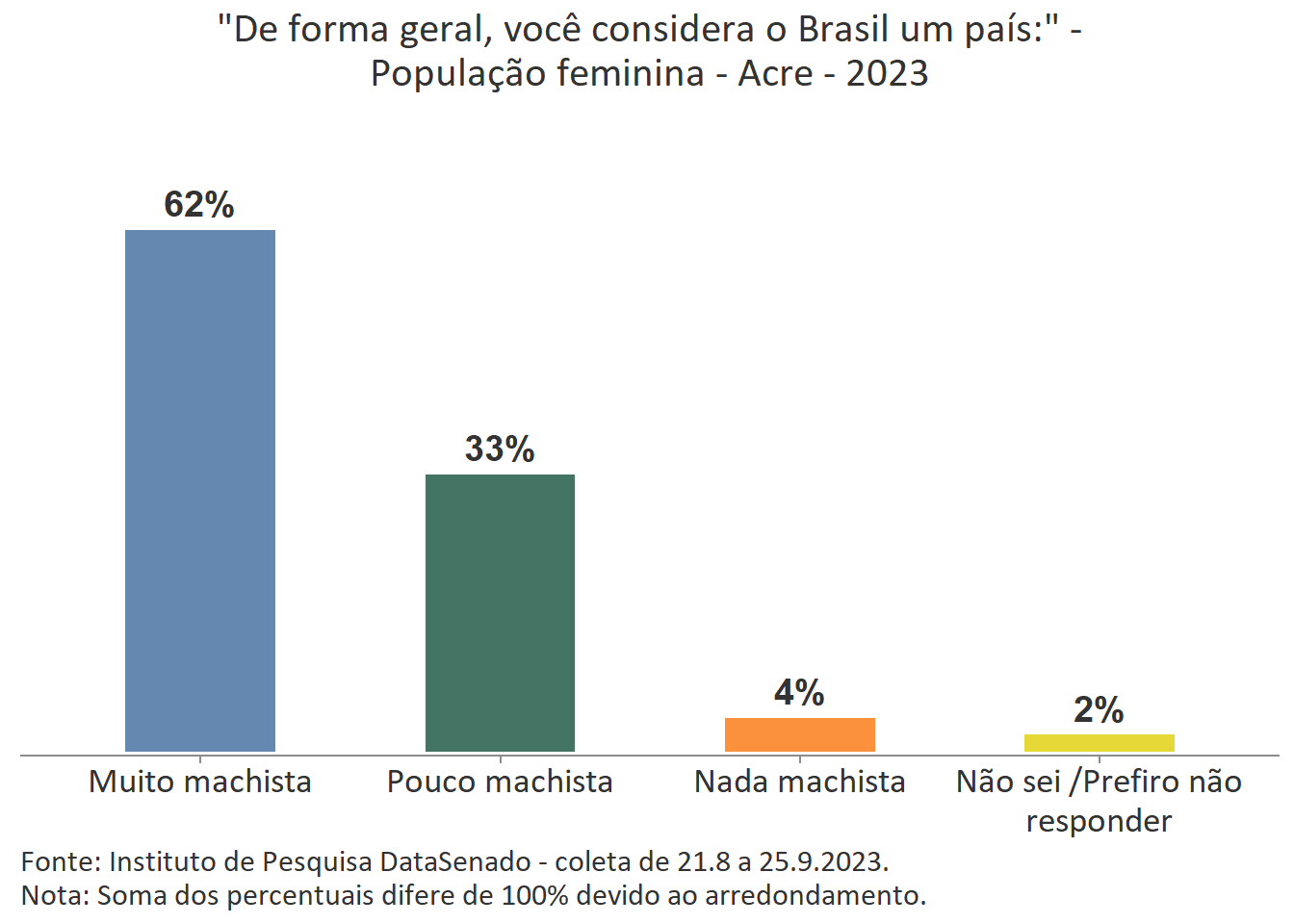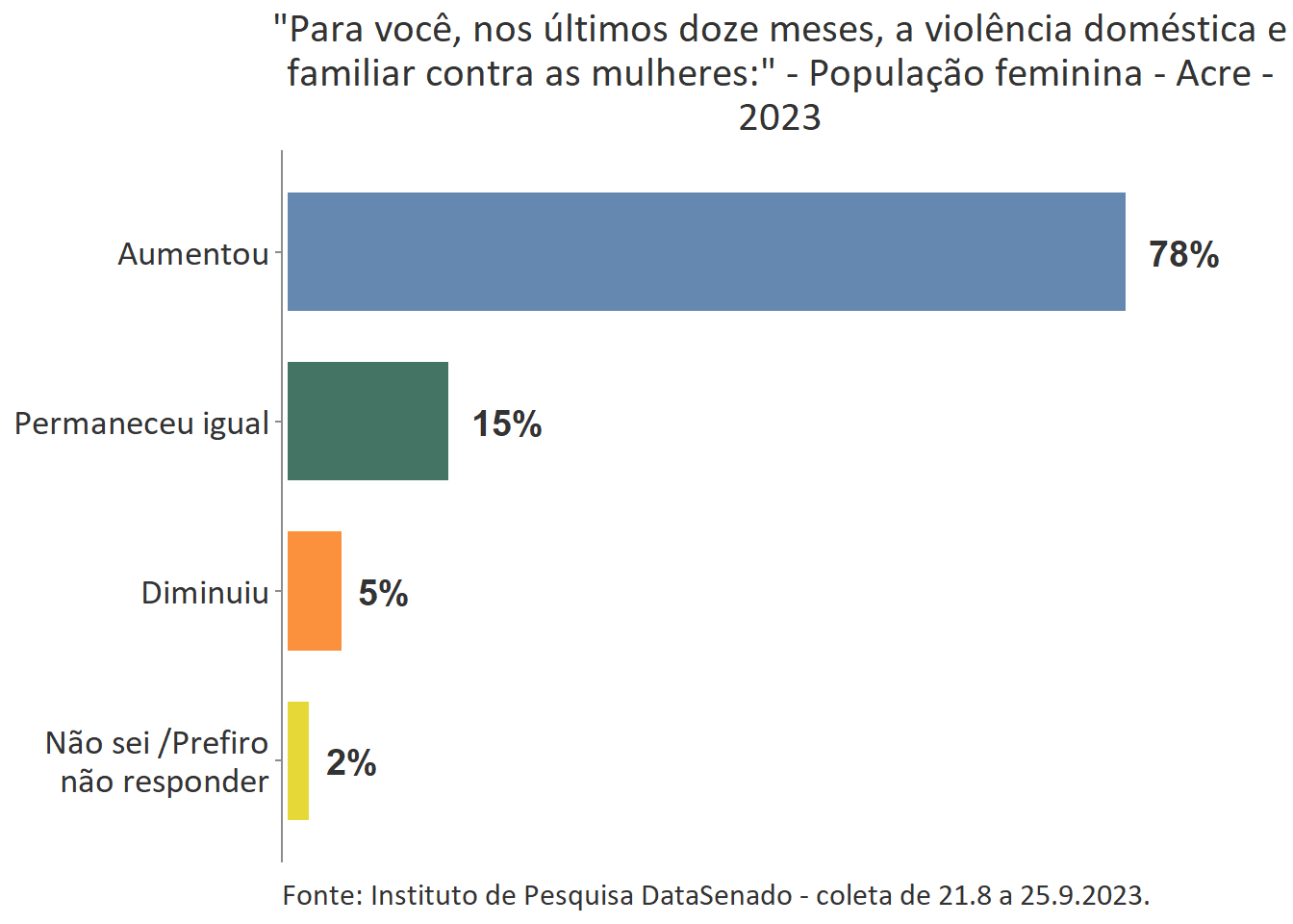 De forma geral, as acreanas consideram o Brasil um país muito machista (62%) e que nos últimos 12 meses a violência doméstica aumentou (78%).