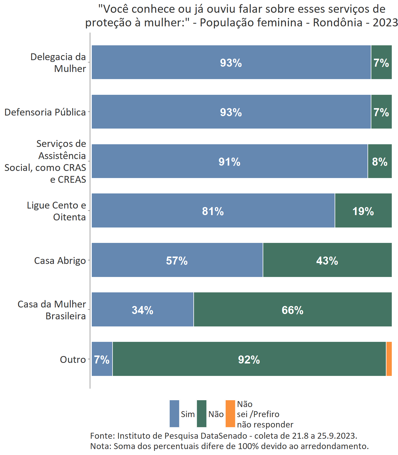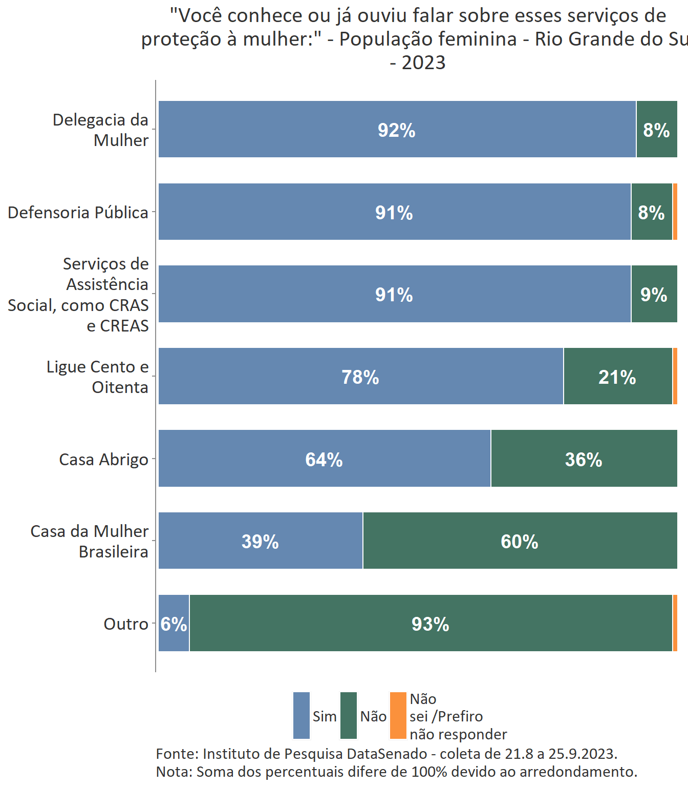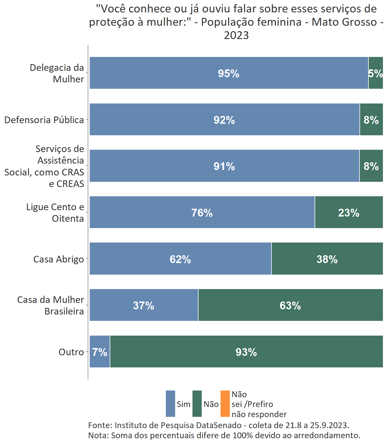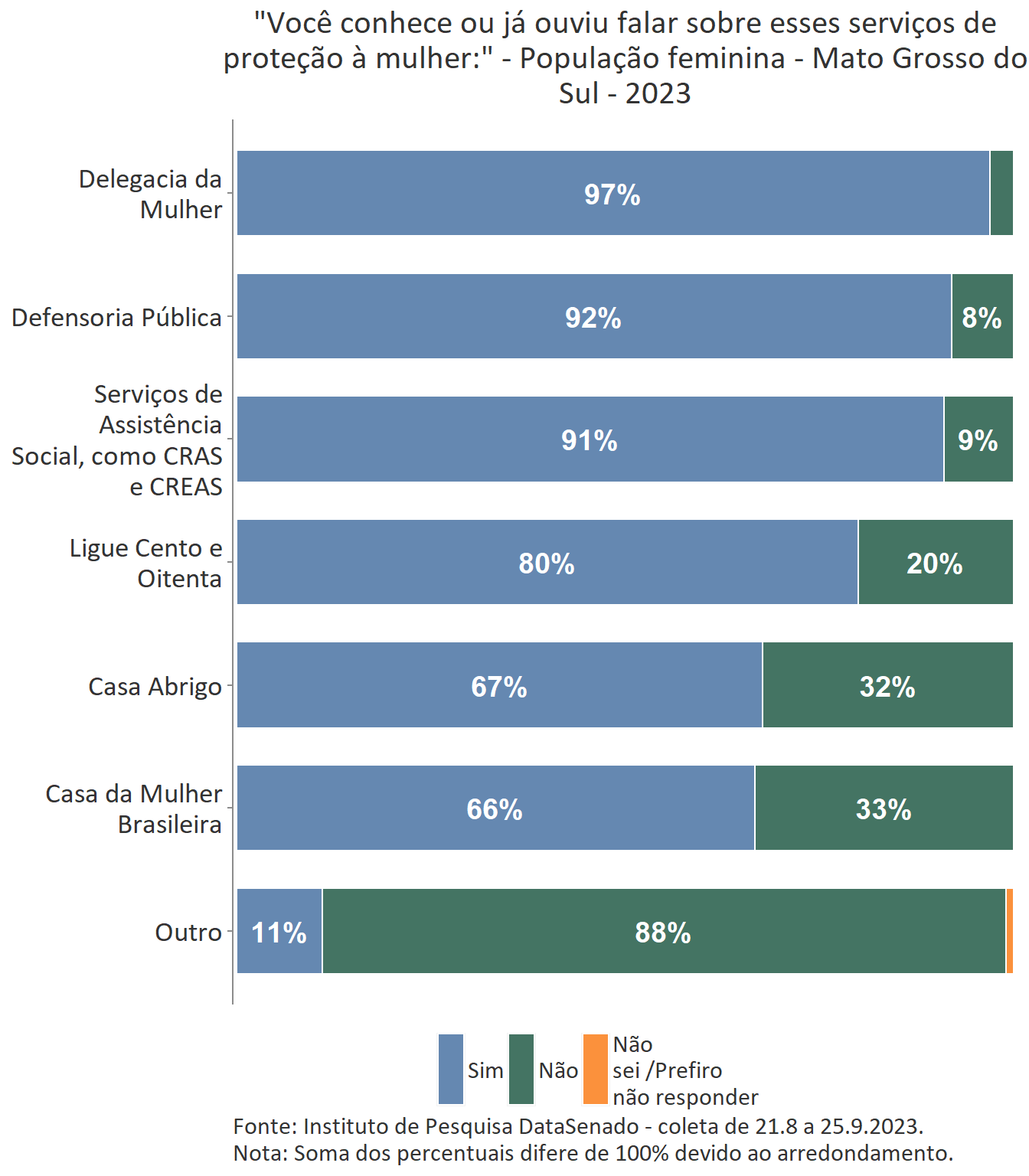 Em relação ao grau de conhecimento sobre os serviços que integram a rede de proteção à mulher, nota-se um equilíbrio entre as unidades federativas brasileiras, com algumas exceções. A delegacia da Mulher é conhecida por 95% das brasileiras, mas no estado do Amapá esse índice cresce para 99%. A Defensoria Pública é conhecida por 87% das brasileiras, mas nos estados do Amapá (95%) e do Tocantins (96%) os índices ultrapassam os resultados nacionais. A Casa da Mulher Brasileira, por sua vez, é conhecida por 38% na pesquisa nacional, mas entre as sul-mato-grossenses, esse patamar sobe para 66%.
