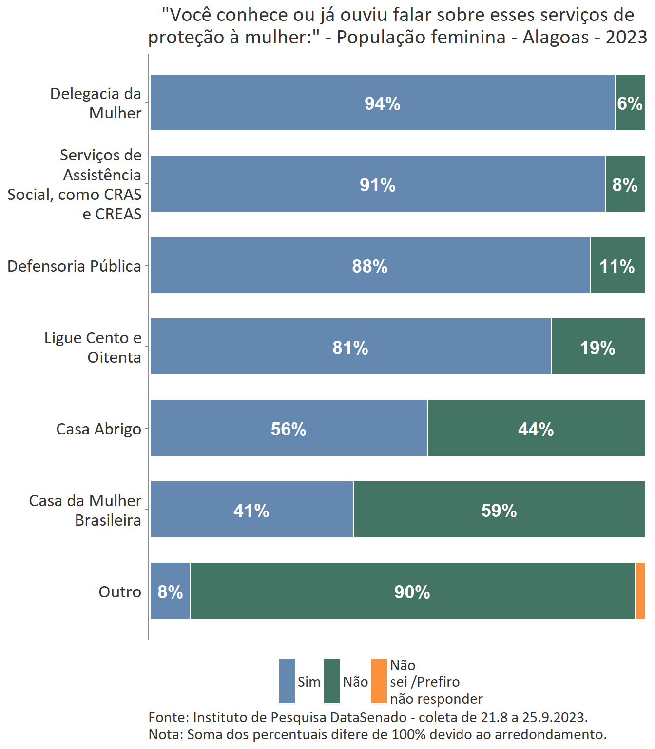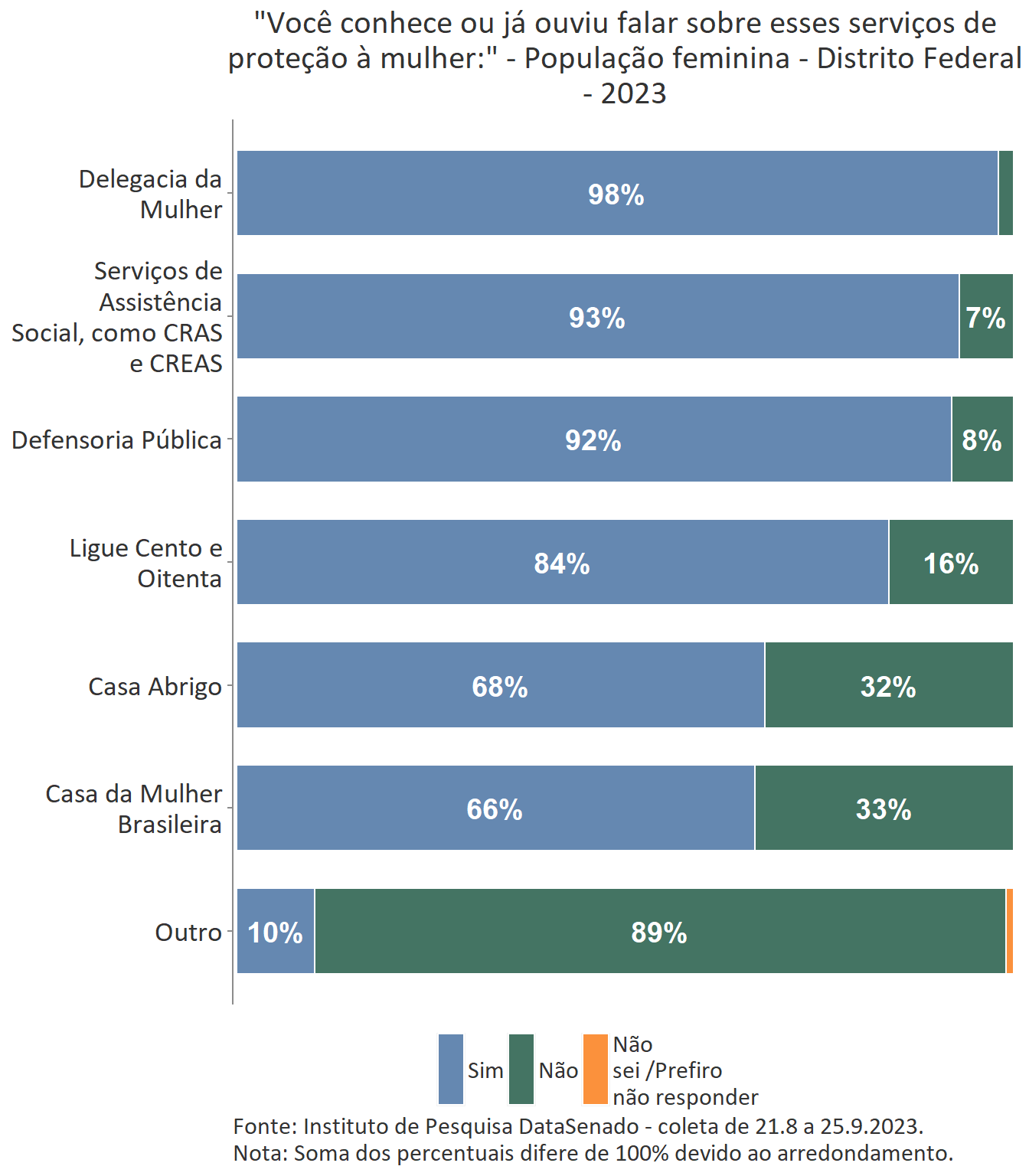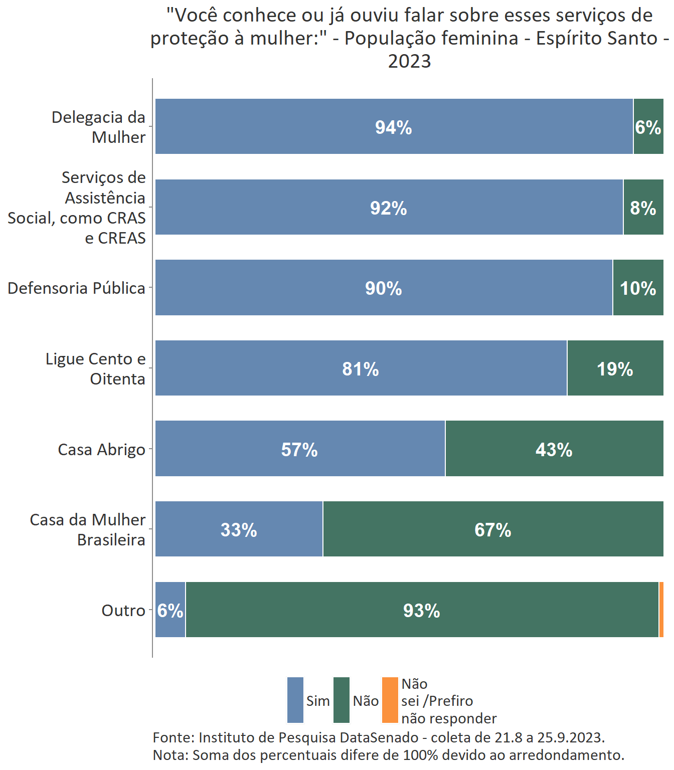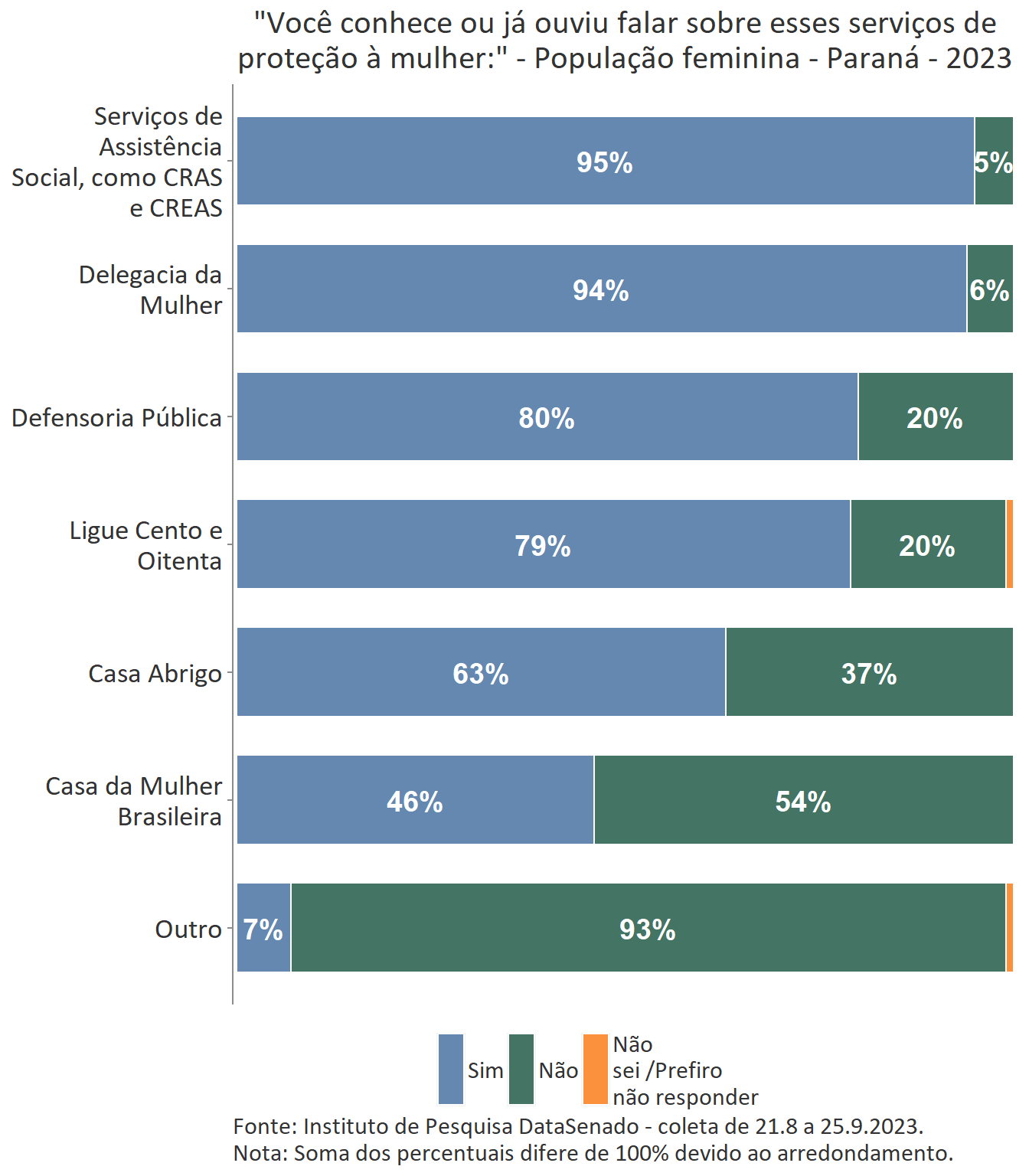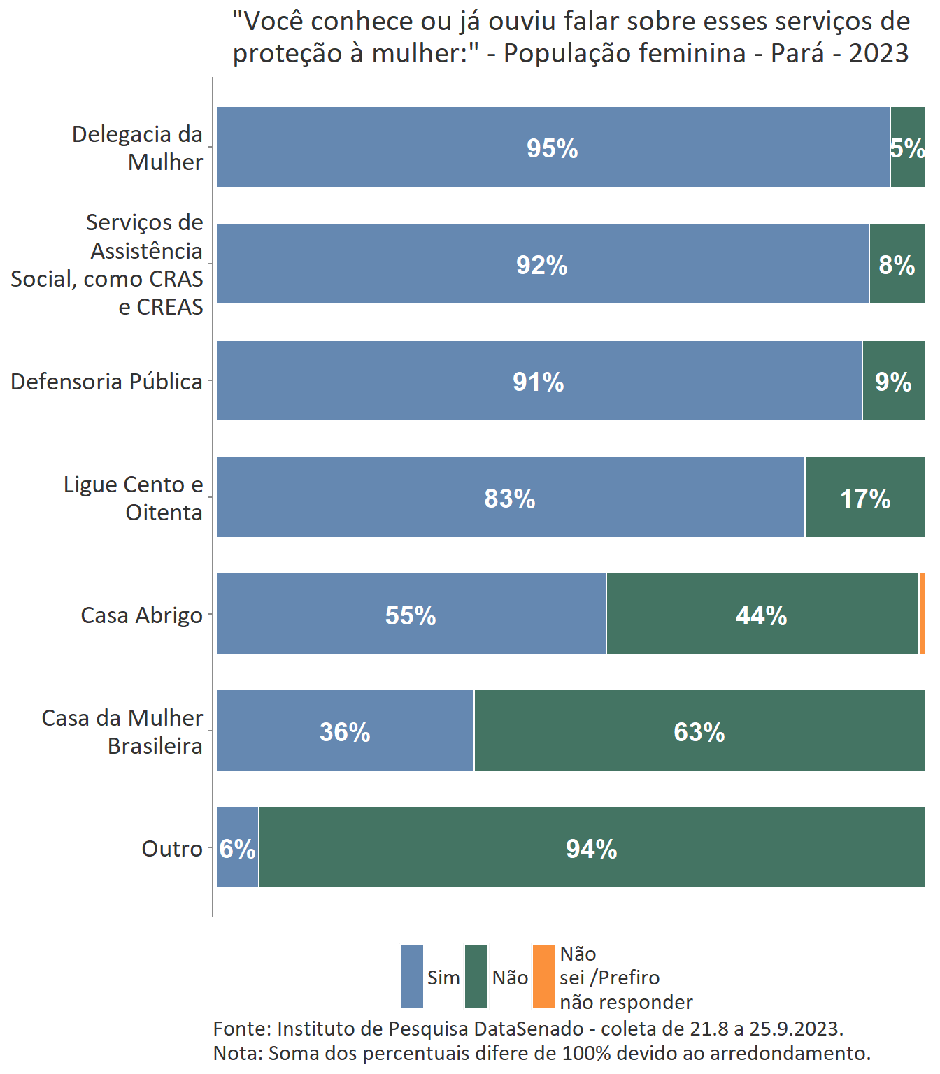 Em relação ao grau de conhecimento sobre os serviços que integram a rede de proteção à mulher, nota-se um equilíbrio entre as unidades federativas brasileiras, com algumas exceções. A delegacia da Mulher é conhecida por 95% das brasileiras, mas no estado do Amapá esse índice cresce para 99%. A Defensoria Pública é conhecida por 87% das brasileiras, mas nos estados do Amapá (95%) e do Tocantins (96%) os índices ultrapassam os resultados nacionais. A Casa da Mulher Brasileira, por sua vez, é conhecida por 38% na pesquisa nacional, mas entre as sul-mato-grossenses, esse patamar sobe para 66%.