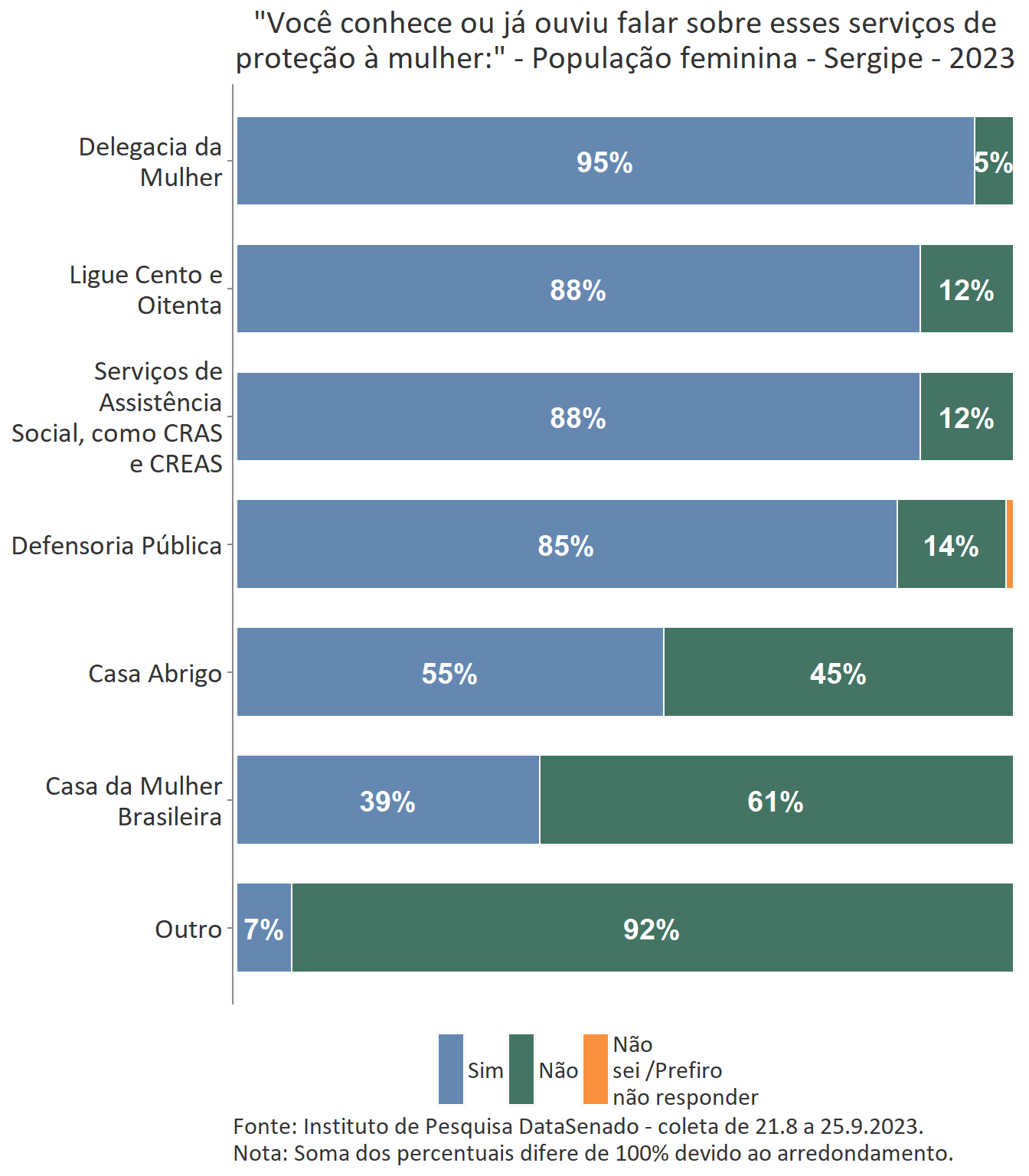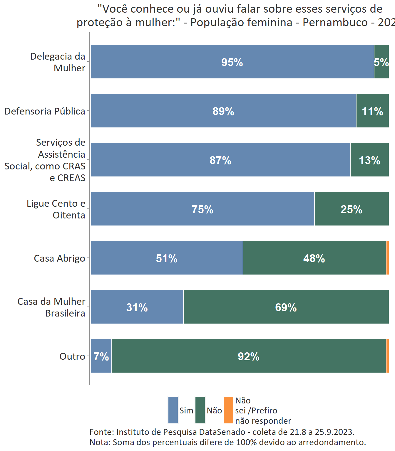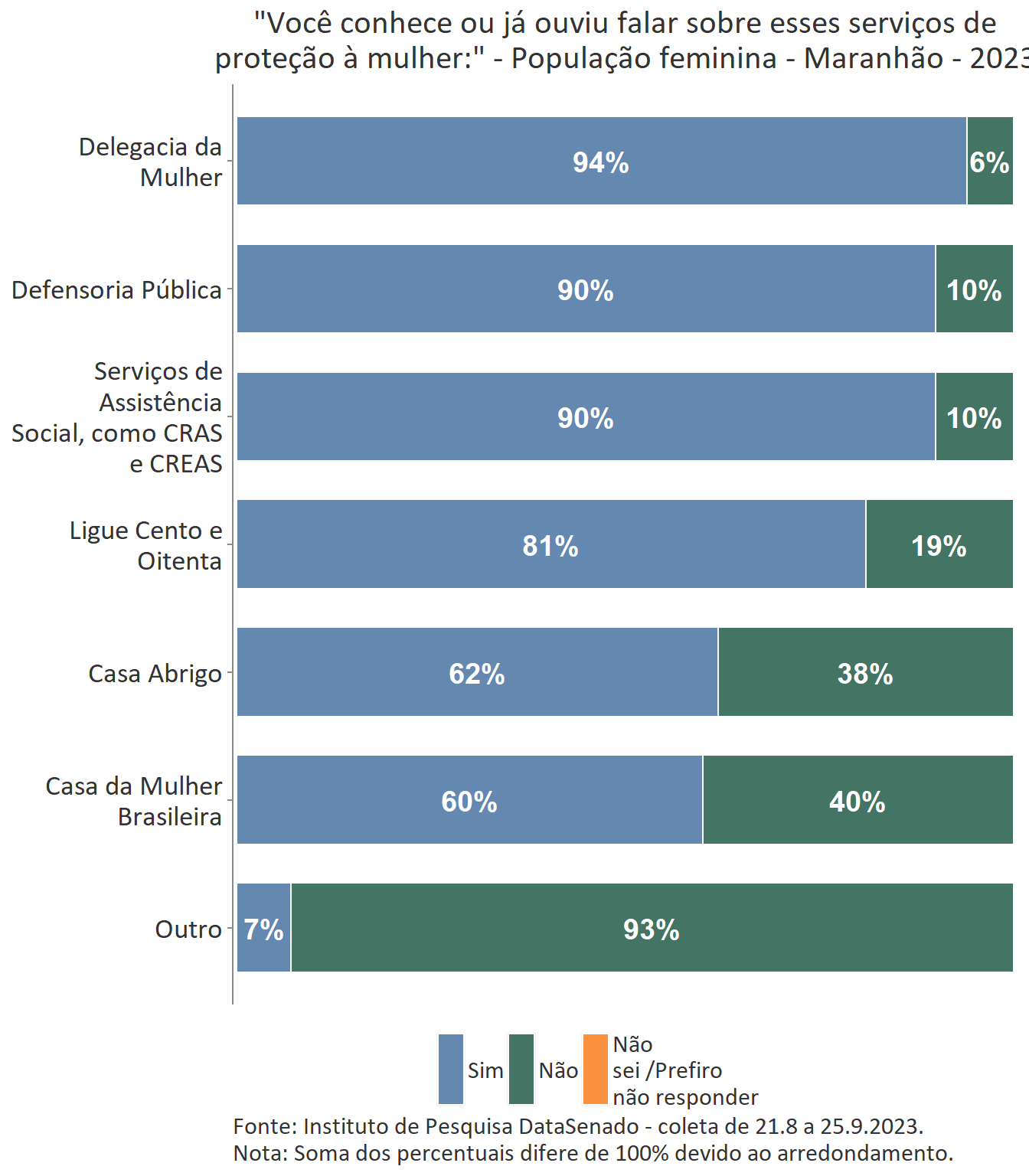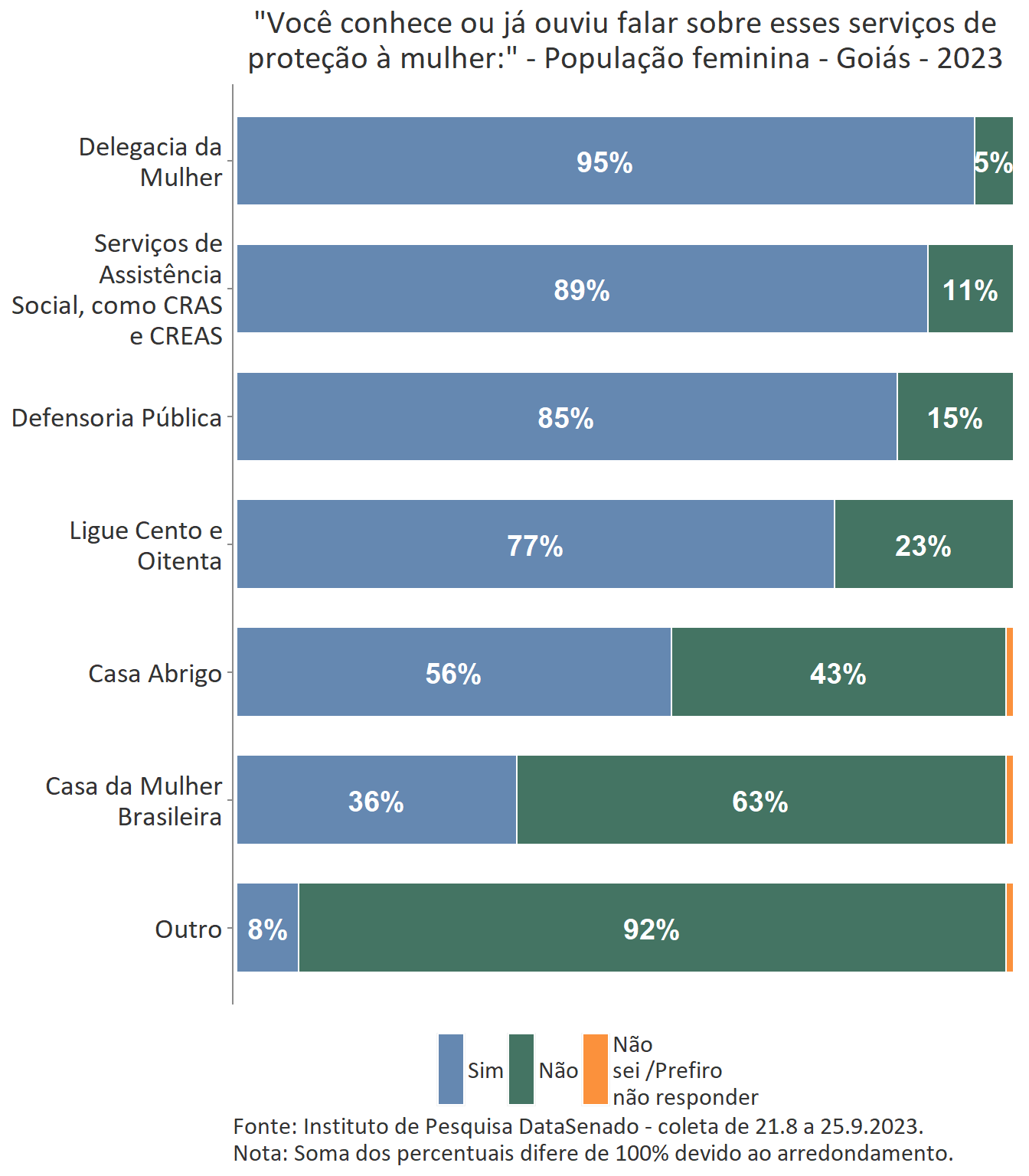 Em relação ao grau de conhecimento sobre os serviços que integram a rede de proteção à mulher, nota-se um equilíbrio entre as unidades federativas brasileiras, com algumas exceções. A delegacia da Mulher é conhecida por 95% das brasileiras, mas no estado do Amapá esse índice cresce para 99%. A Defensoria Pública é conhecida por 87% das brasileiras, mas nos estados do Amapá (95%) e do Tocantins (96%) os índices ultrapassam os resultados nacionais. A Casa da Mulher Brasileira, por sua vez, é conhecida por 38% na pesquisa nacional, mas entre as sul-mato-grossenses, esse patamar sobe para 66%.