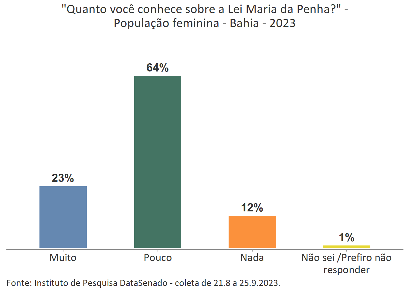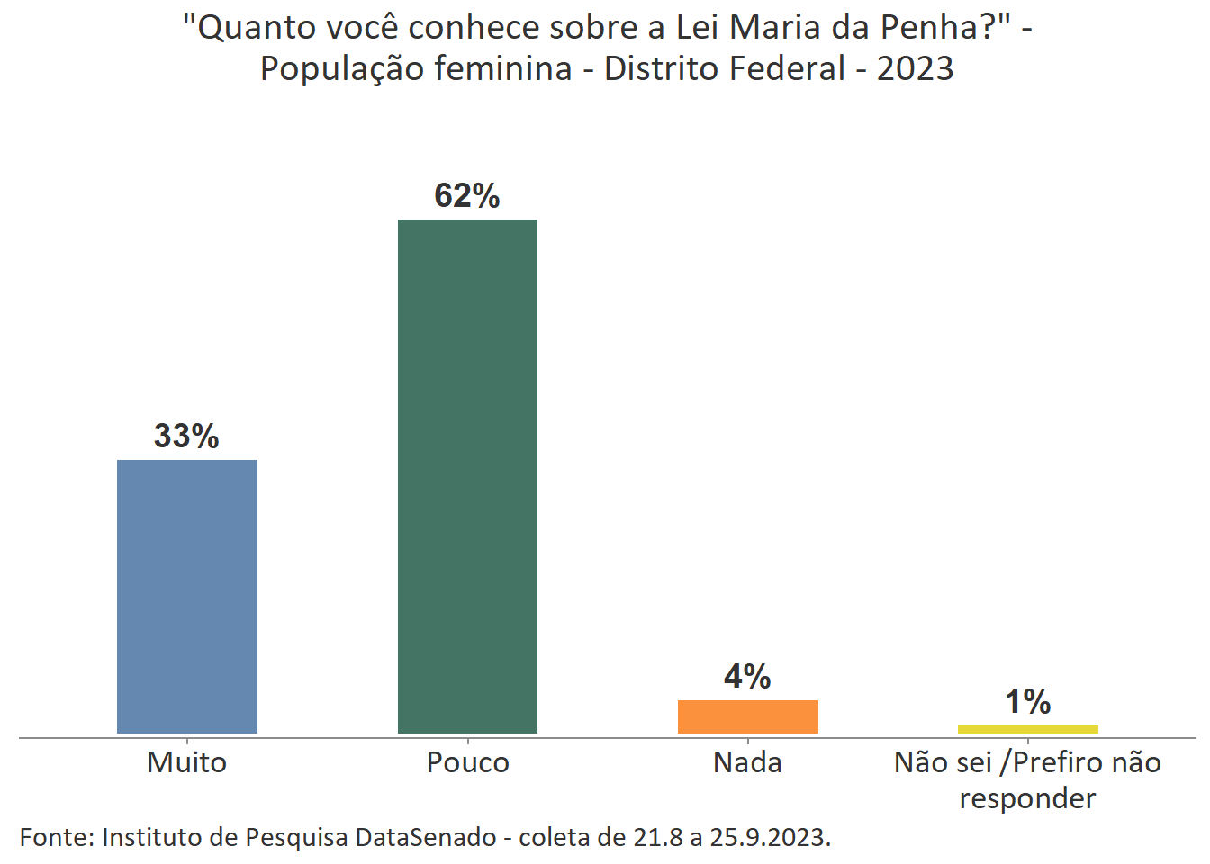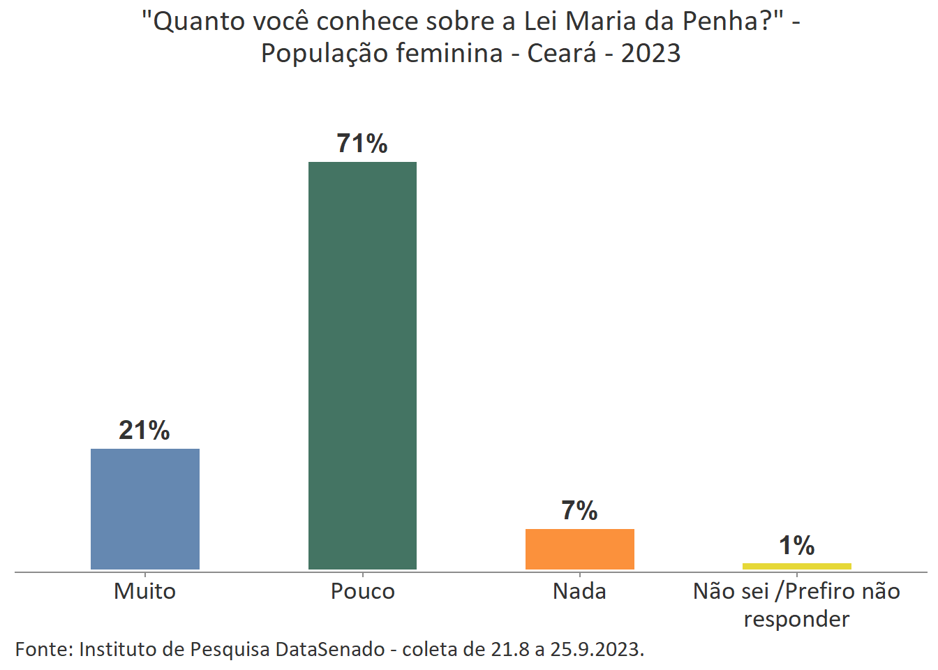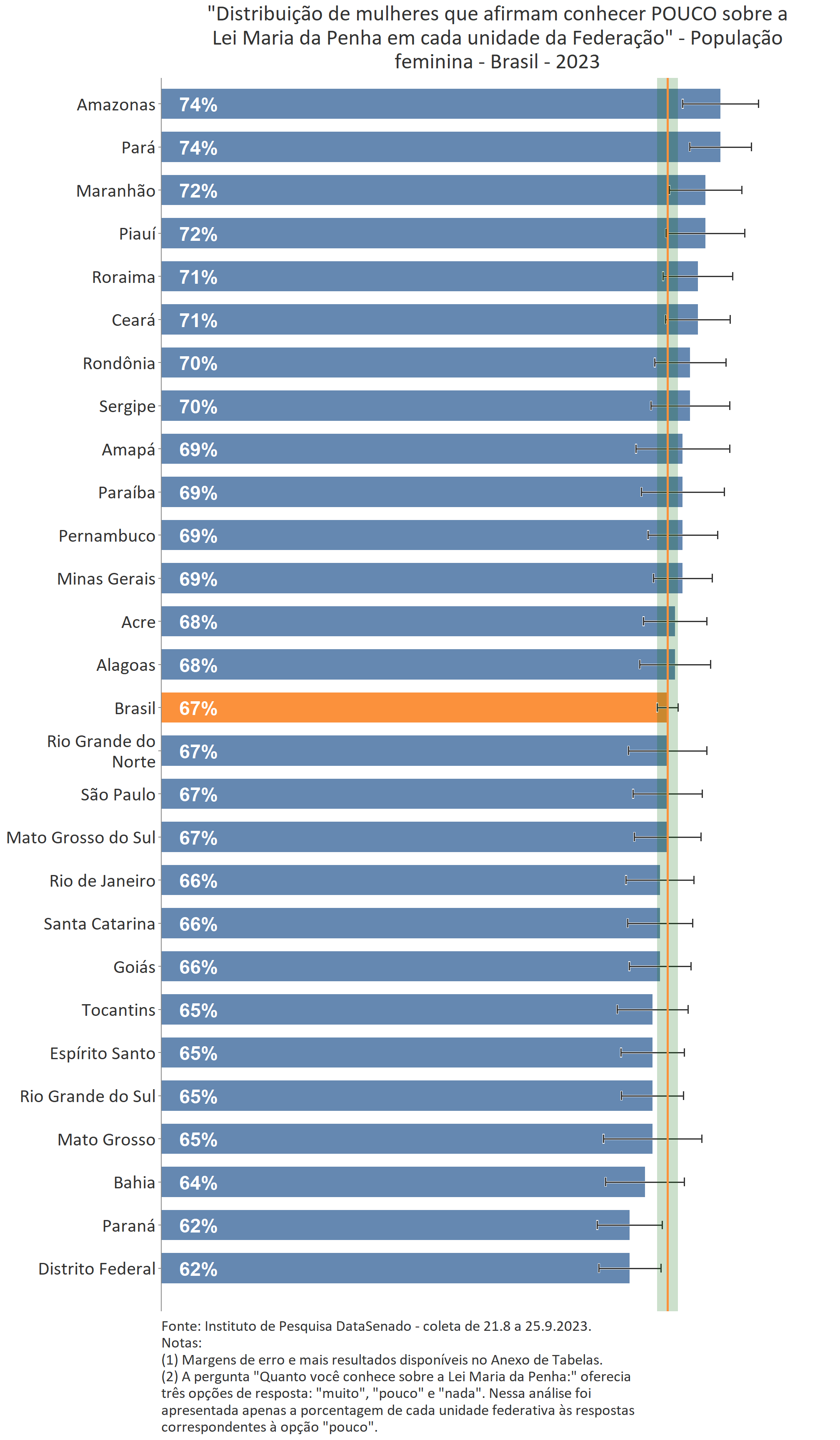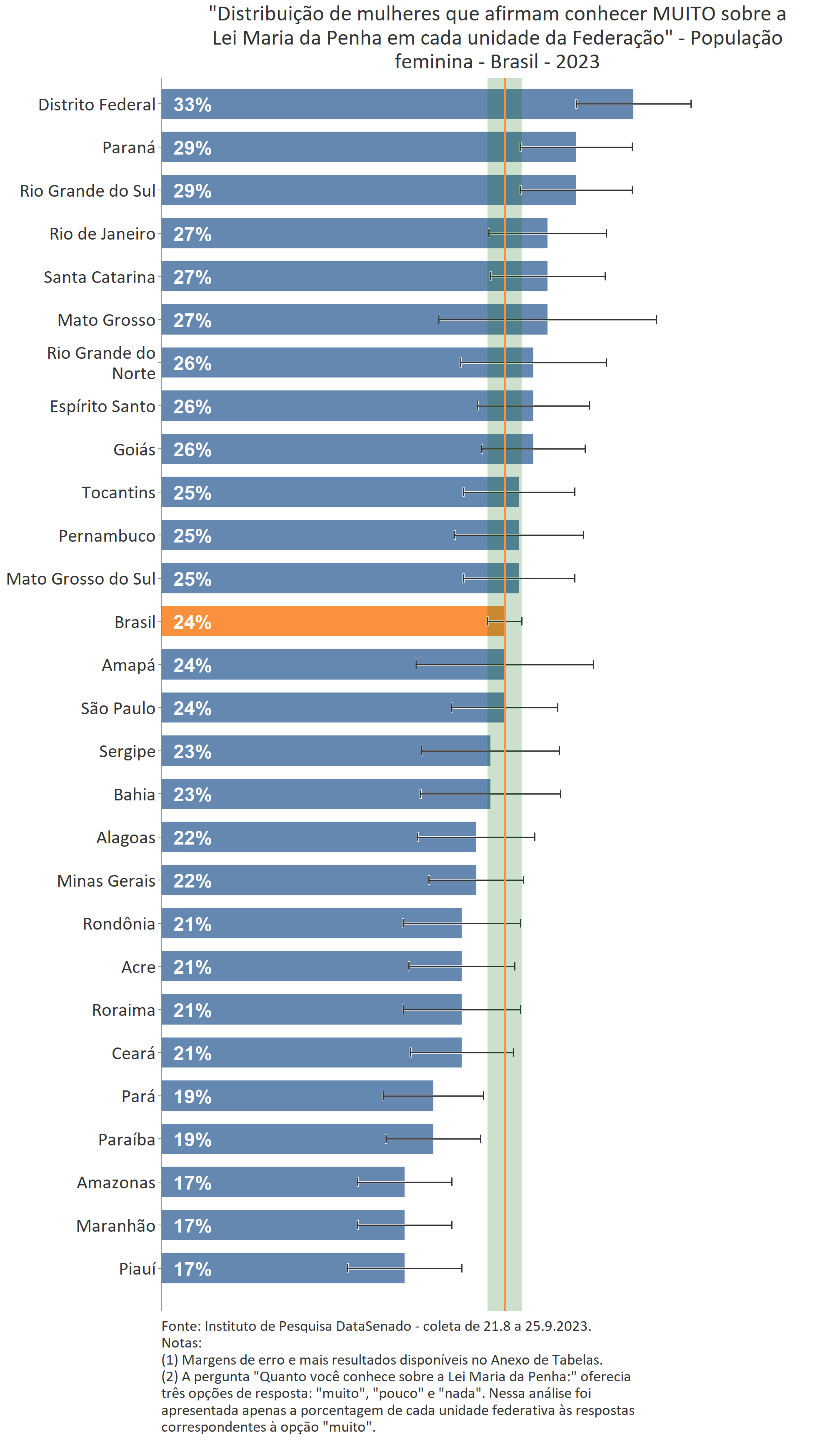 Menos de um quarto das brasileiras (24%) afirmam conhecer muito sobre a Lei Maria da Penha. Esse patamar é superado no Distrito Federal (33%), mas é inferior nos estados do Piauí (17%), do Maranhão (17%), do Amazonas (17%), da Paraíba (19%) e do Pará (19%).