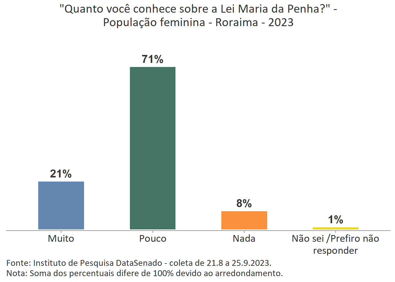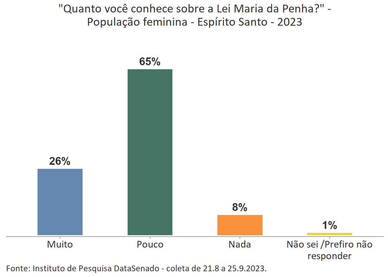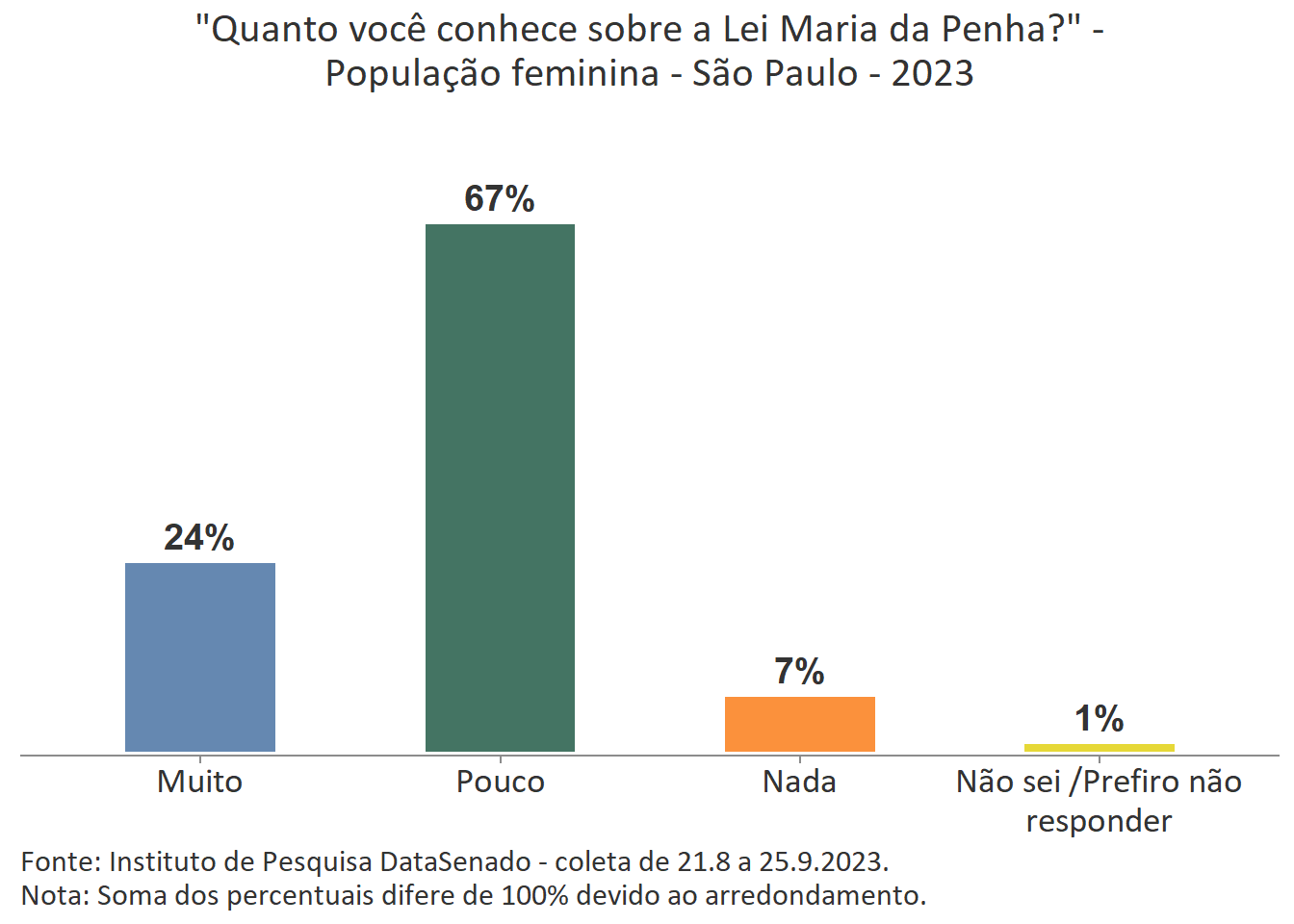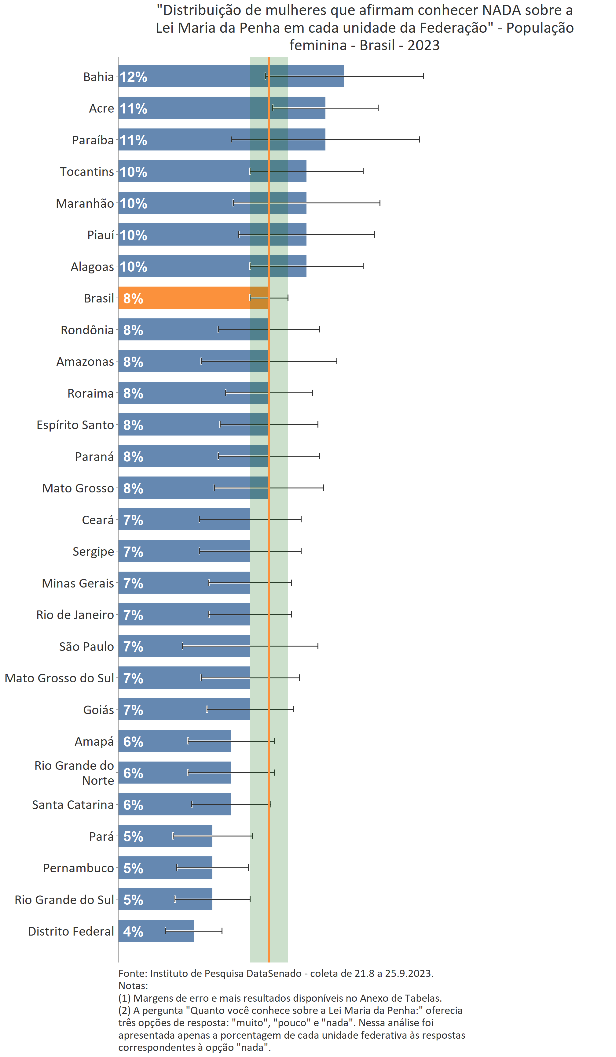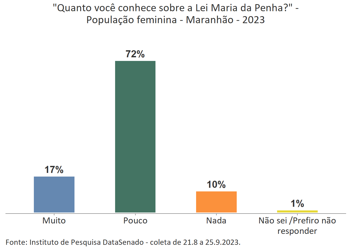 Menos de um quarto das brasileiras (24%) afirmam conhecer muito sobre a Lei Maria da Penha. Esse patamar é superado no Distrito Federal (33%), mas é inferior nos estados do Piauí (17%), do Maranhão (17%), do Amazonas (17%), da Paraíba (19%) e do Pará (19%).