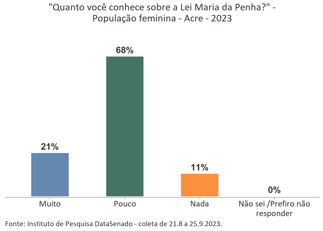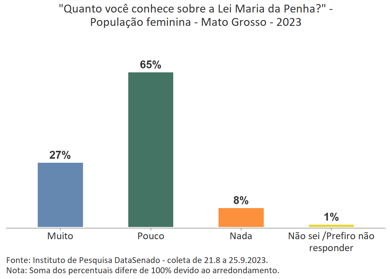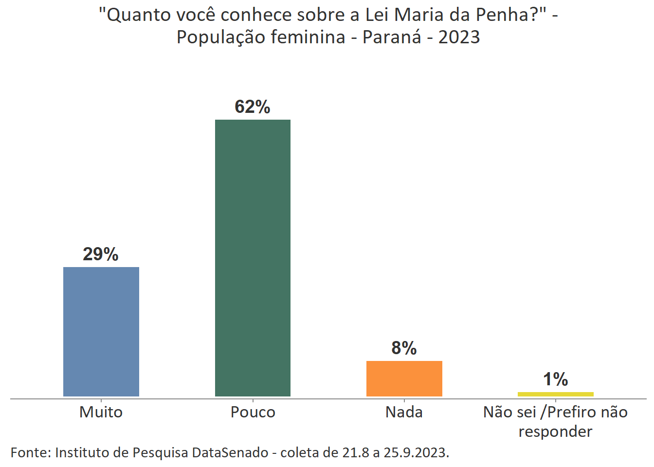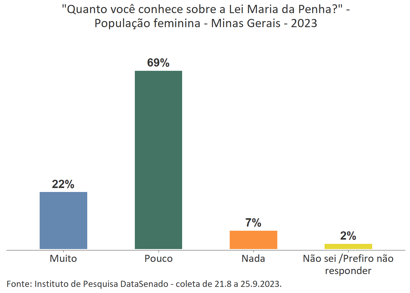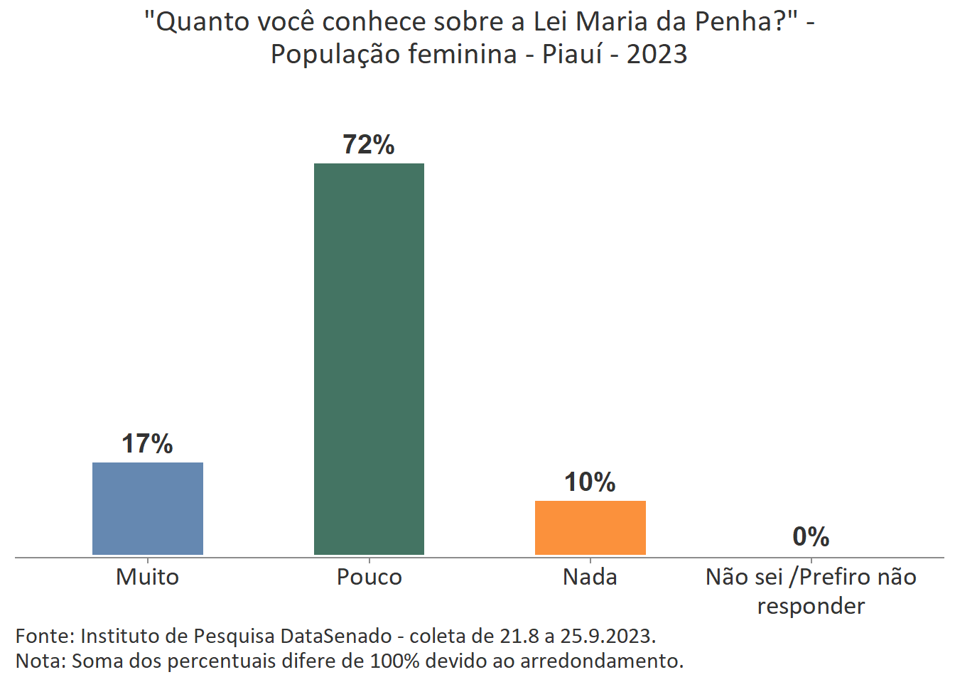 Menos de um quarto das brasileiras (24%) afirmam conhecer muito sobre a Lei Maria da Penha. Esse patamar é superado no Distrito Federal (33%), mas é inferior nos estados do Piauí (17%), do Maranhão (17%), do Amazonas (17%), da Paraíba (19%) e do Pará (19%).