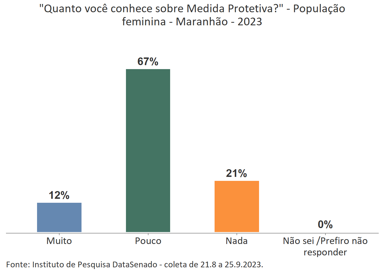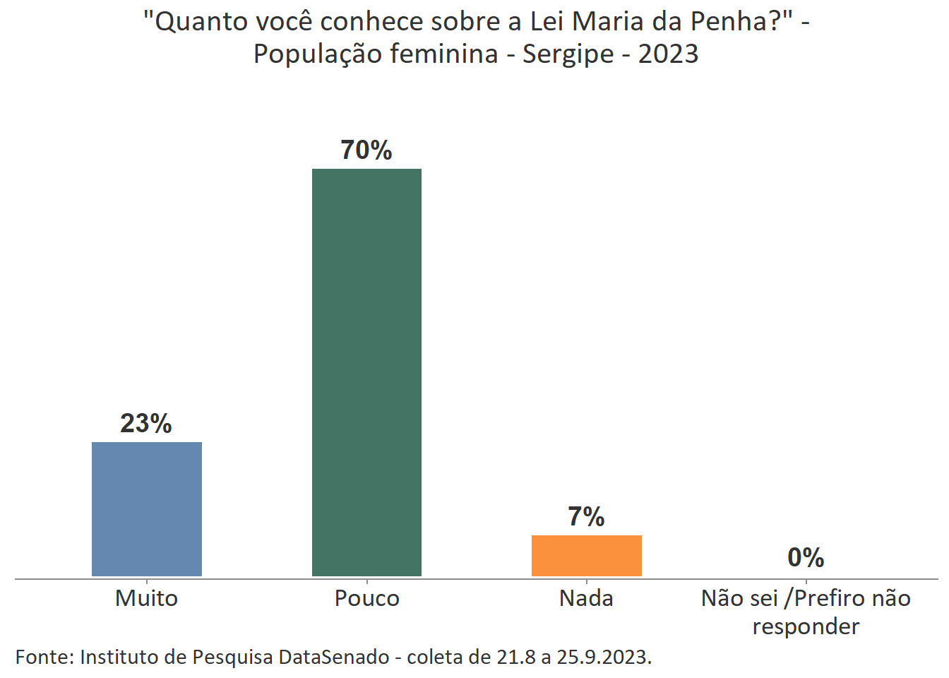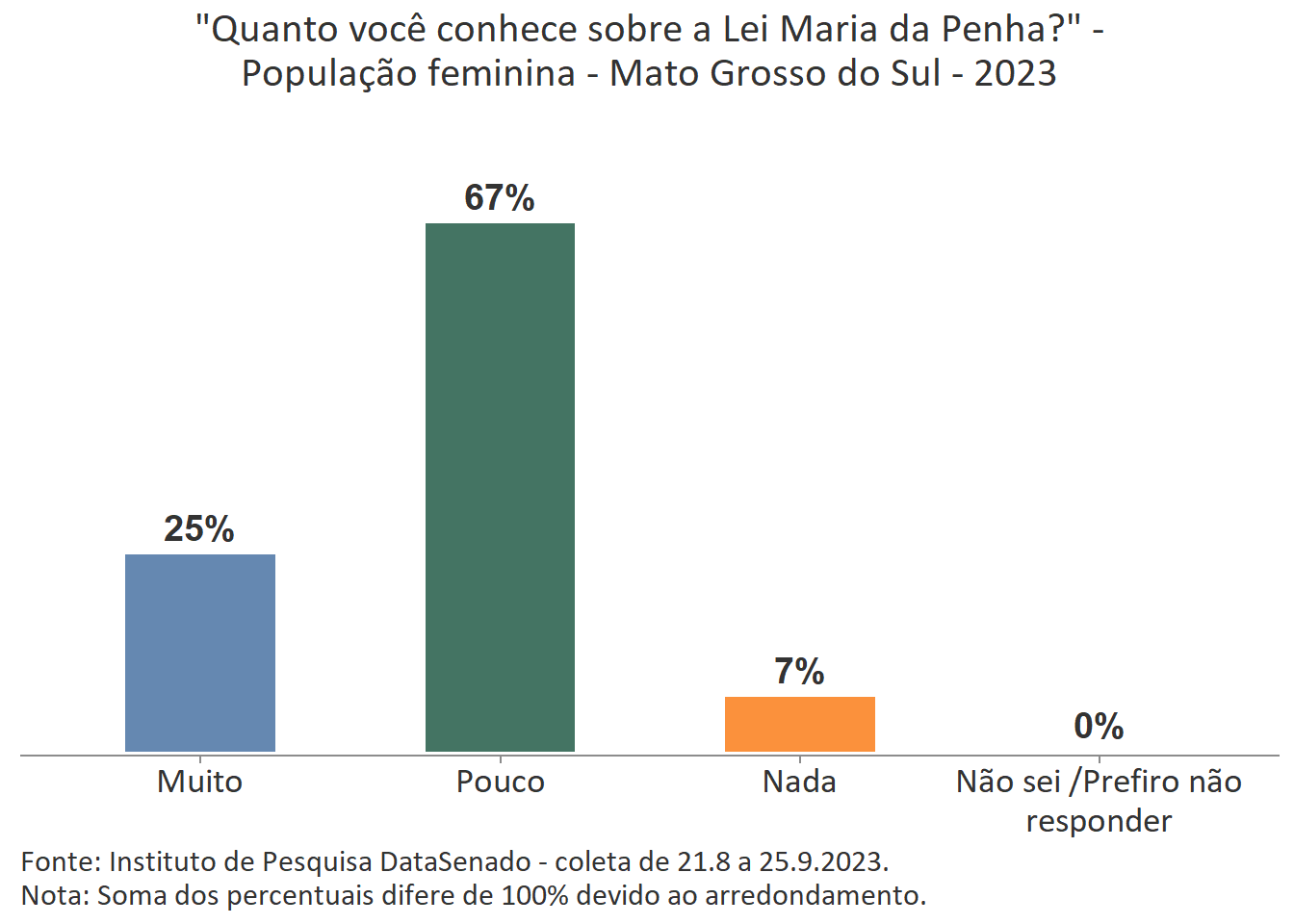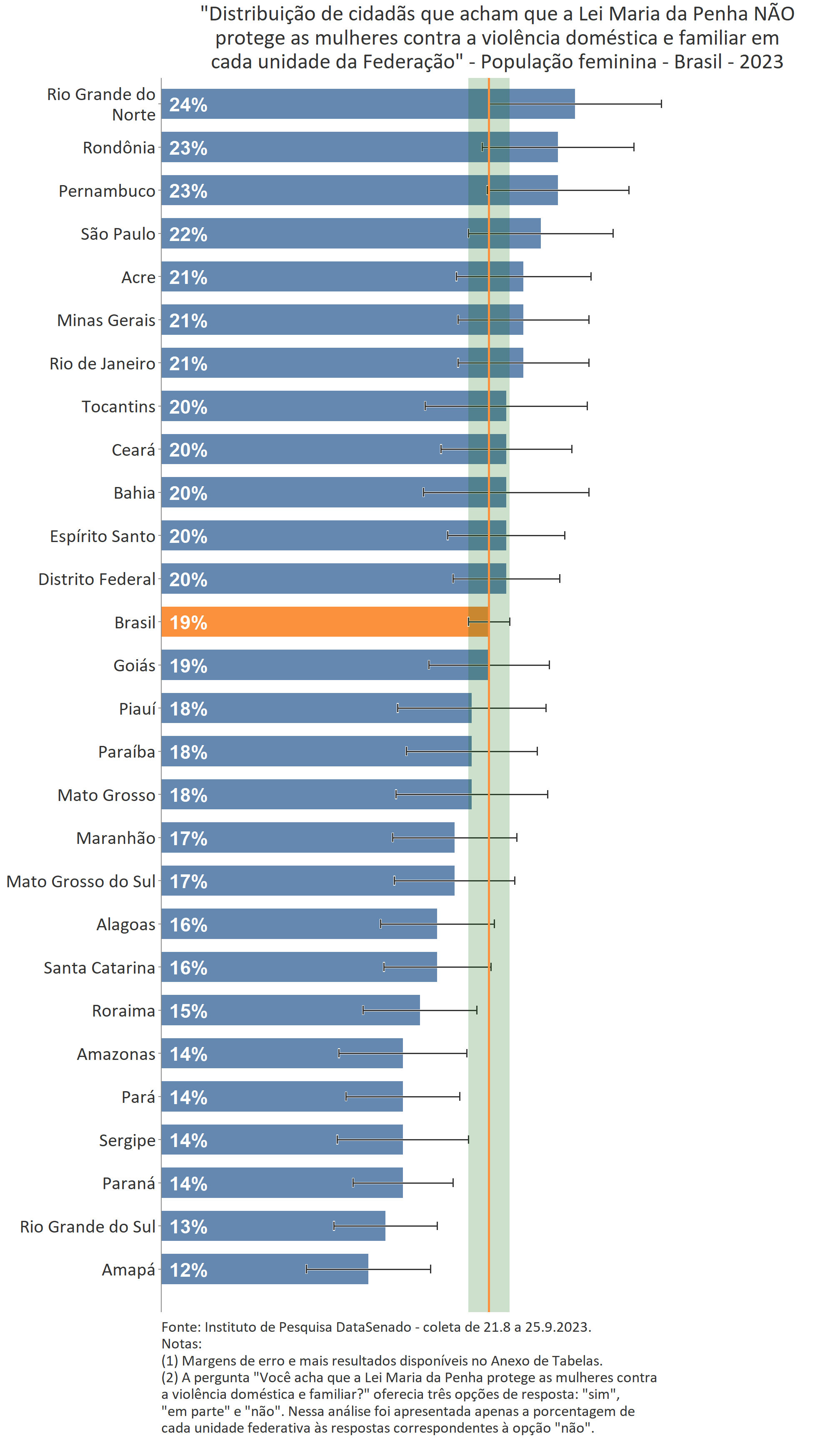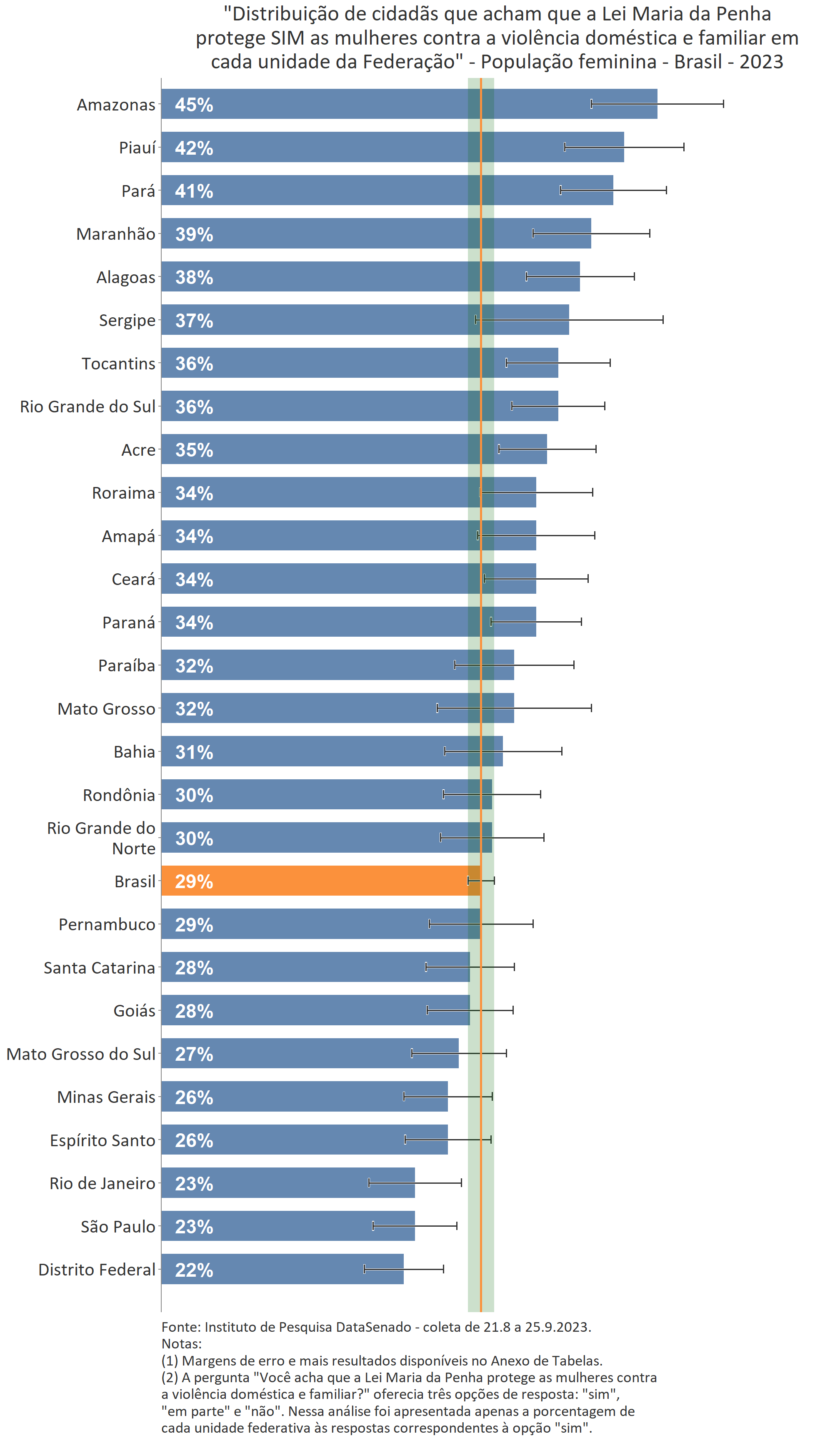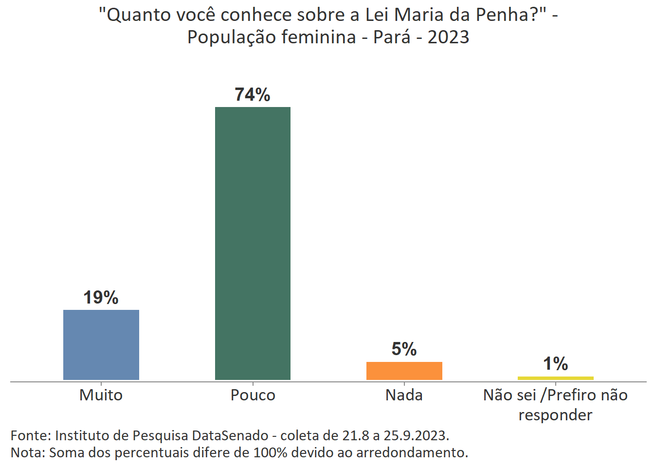 Menos de um quarto das brasileiras (24%) afirmam conhecer muito sobre a Lei Maria da Penha. Esse patamar é superado no Distrito Federal (33%), mas é inferior nos estados do Piauí (17%), do Maranhão (17%), do Amazonas (17%), da Paraíba (19%) e do Pará (19%).