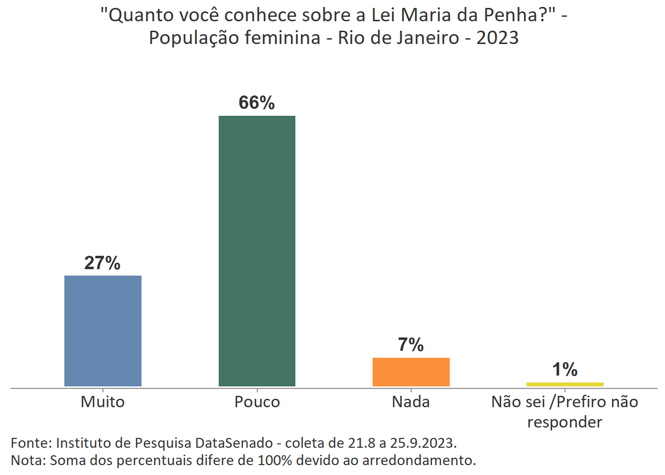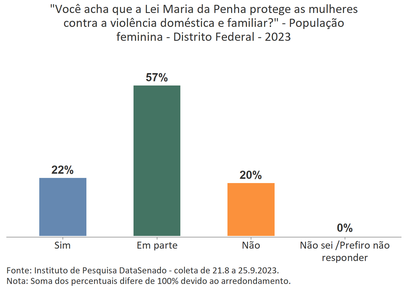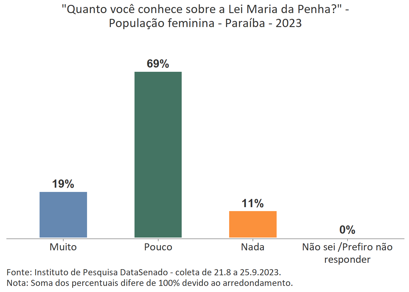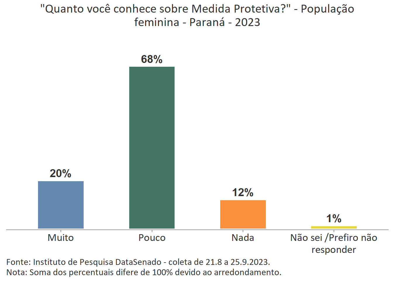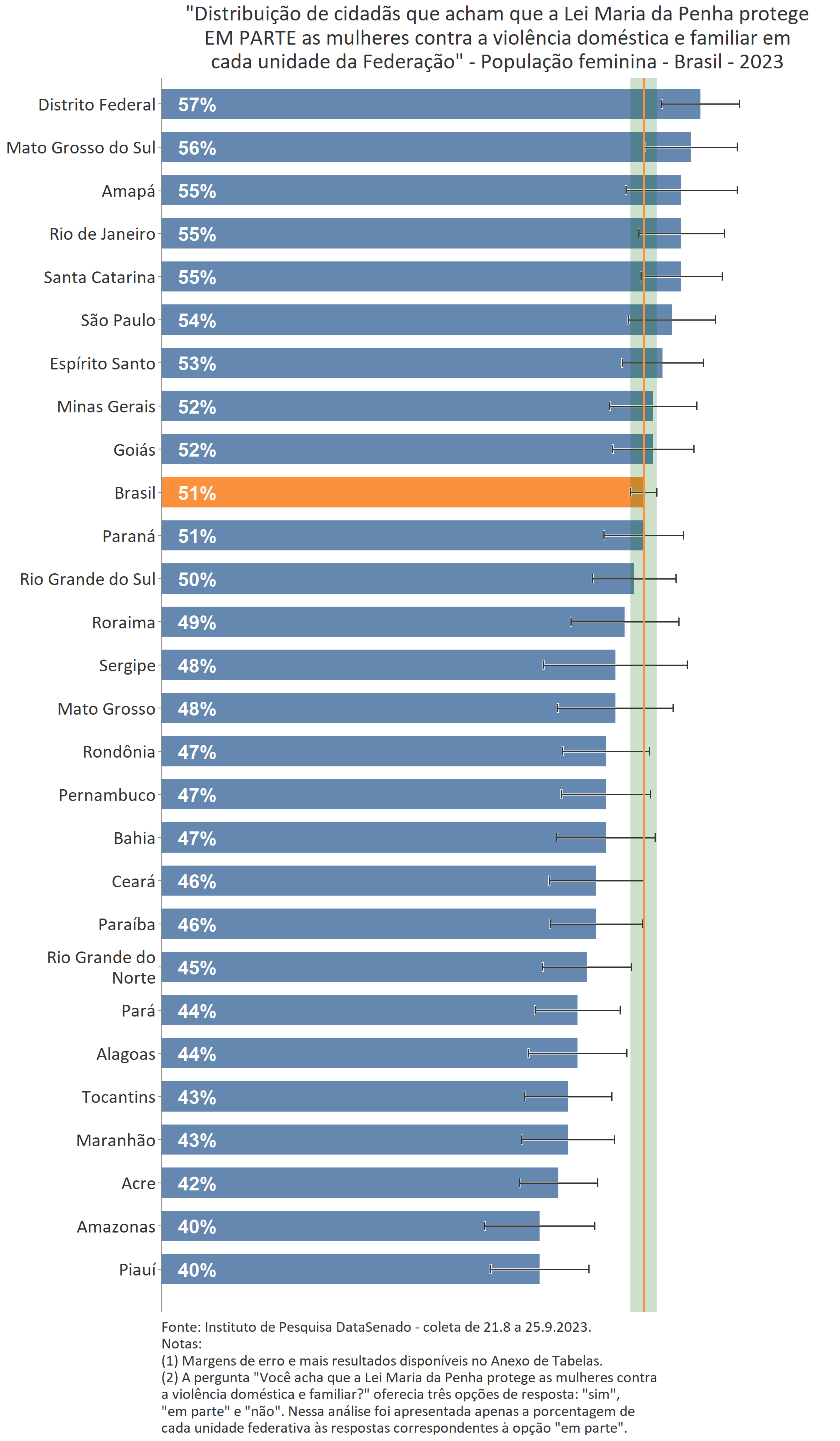 Menos de um quarto das brasileiras (24%) afirmam conhecer muito sobre a Lei Maria da Penha. Esse patamar é superado no Distrito Federal (33%), mas é inferior nos estados do Piauí (17%), do Maranhão (17%), do Amazonas (17%), da Paraíba (19%) e do Pará (19%).