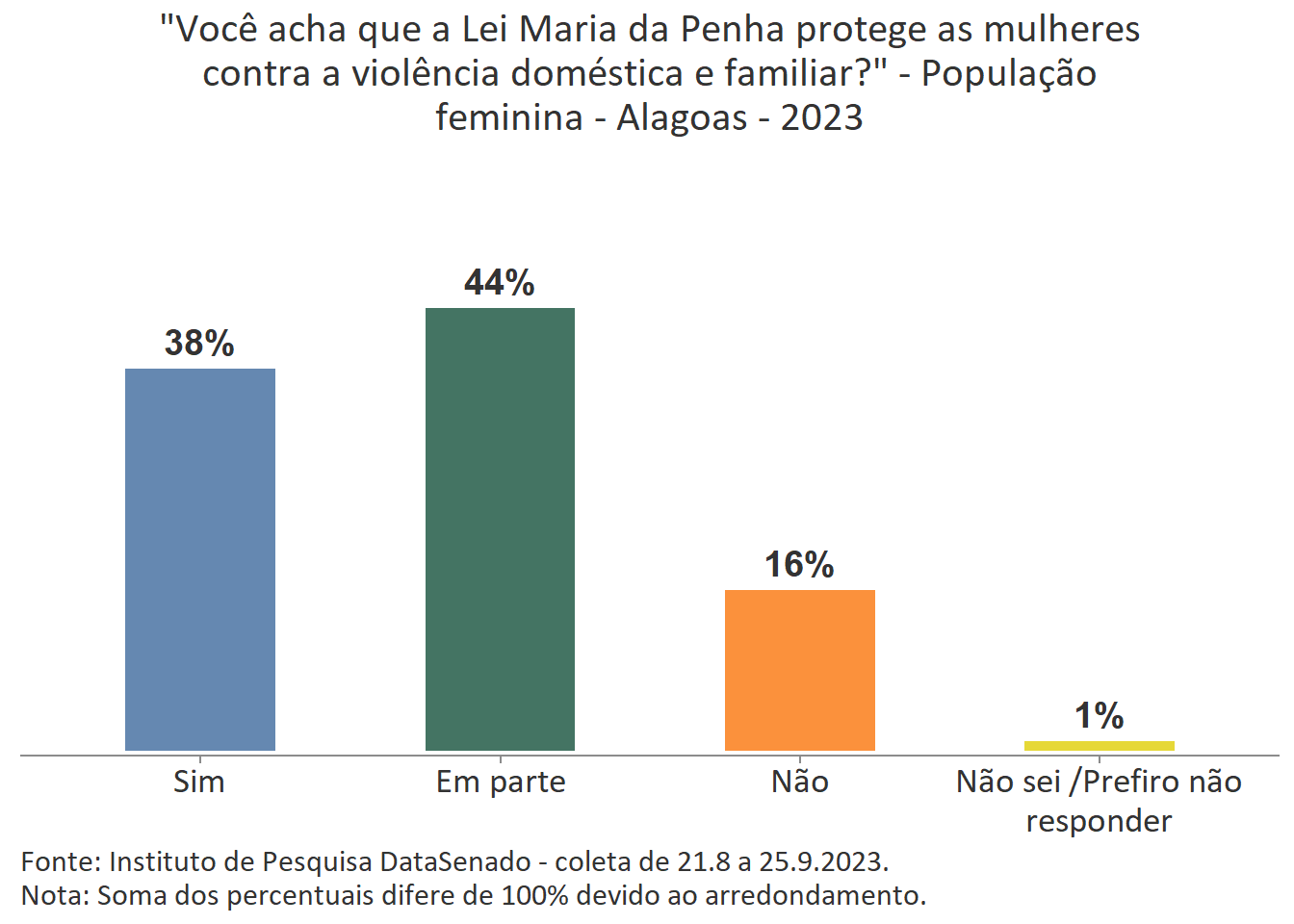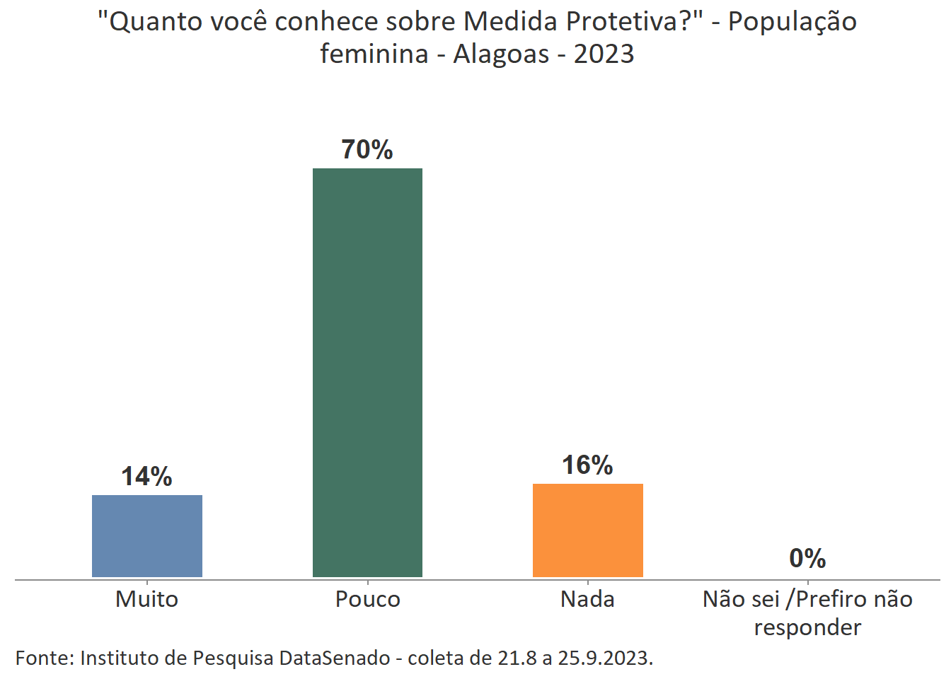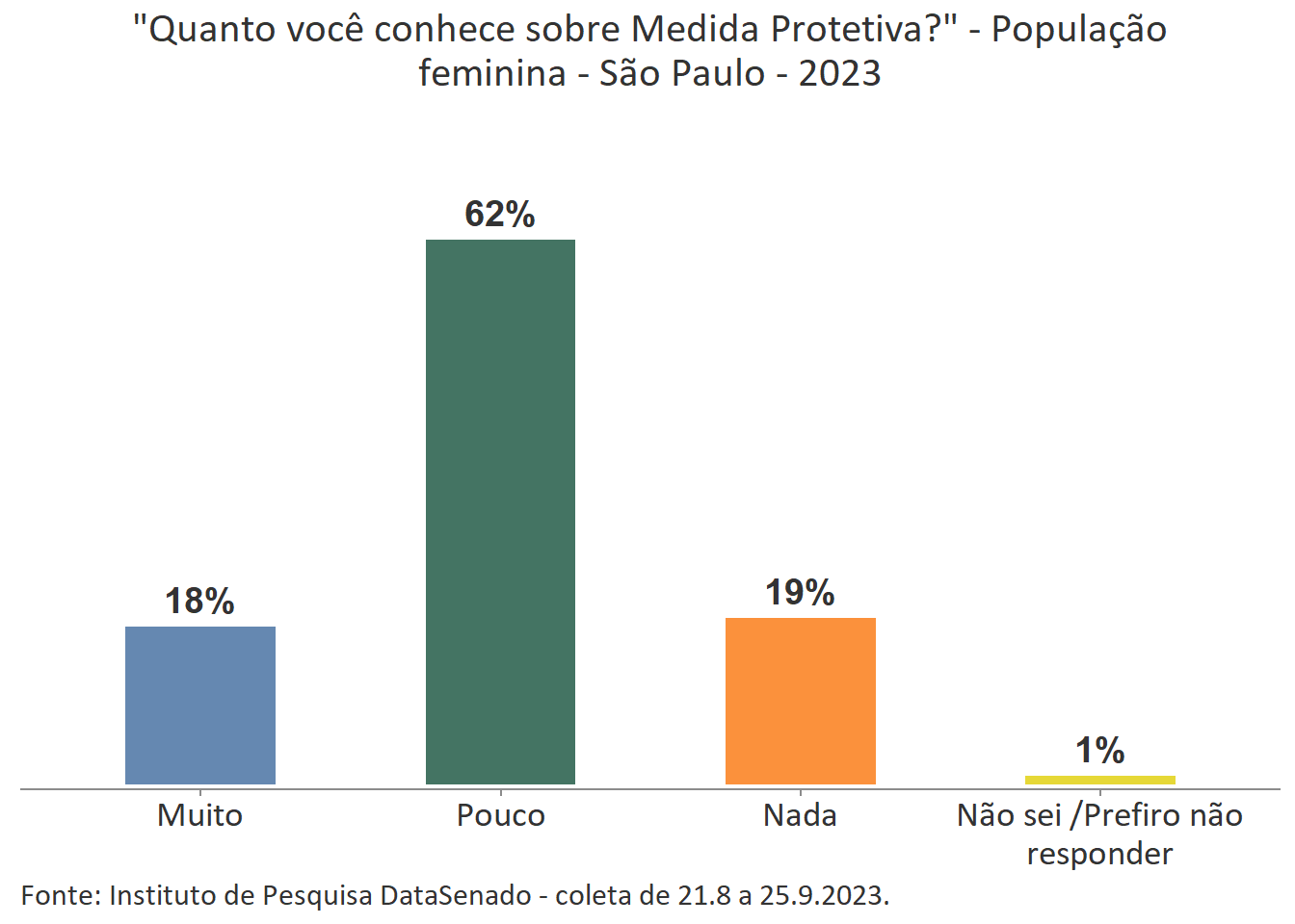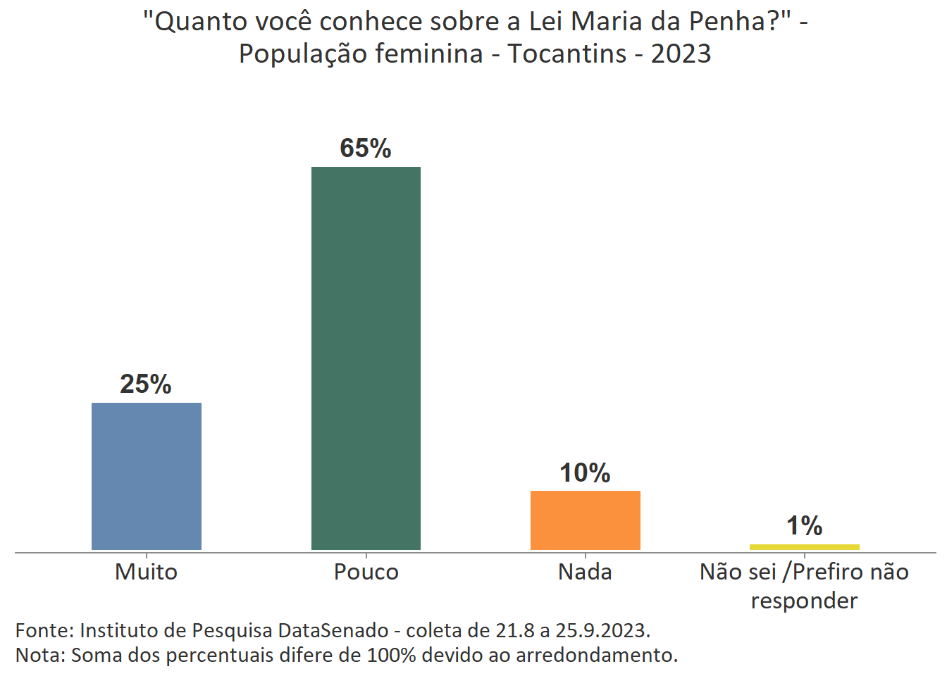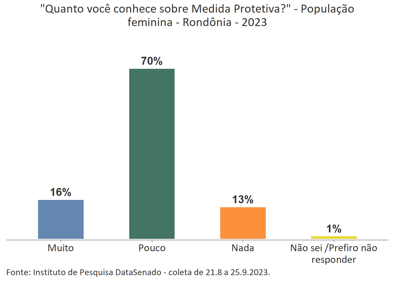 Menos de um quarto das brasileiras (24%) afirmam conhecer muito sobre a Lei Maria da Penha. Esse patamar é superado no Distrito Federal (33%), mas é inferior nos estados do Piauí (17%), do Maranhão (17%), do Amazonas (17%), da Paraíba (19%) e do Pará (19%).