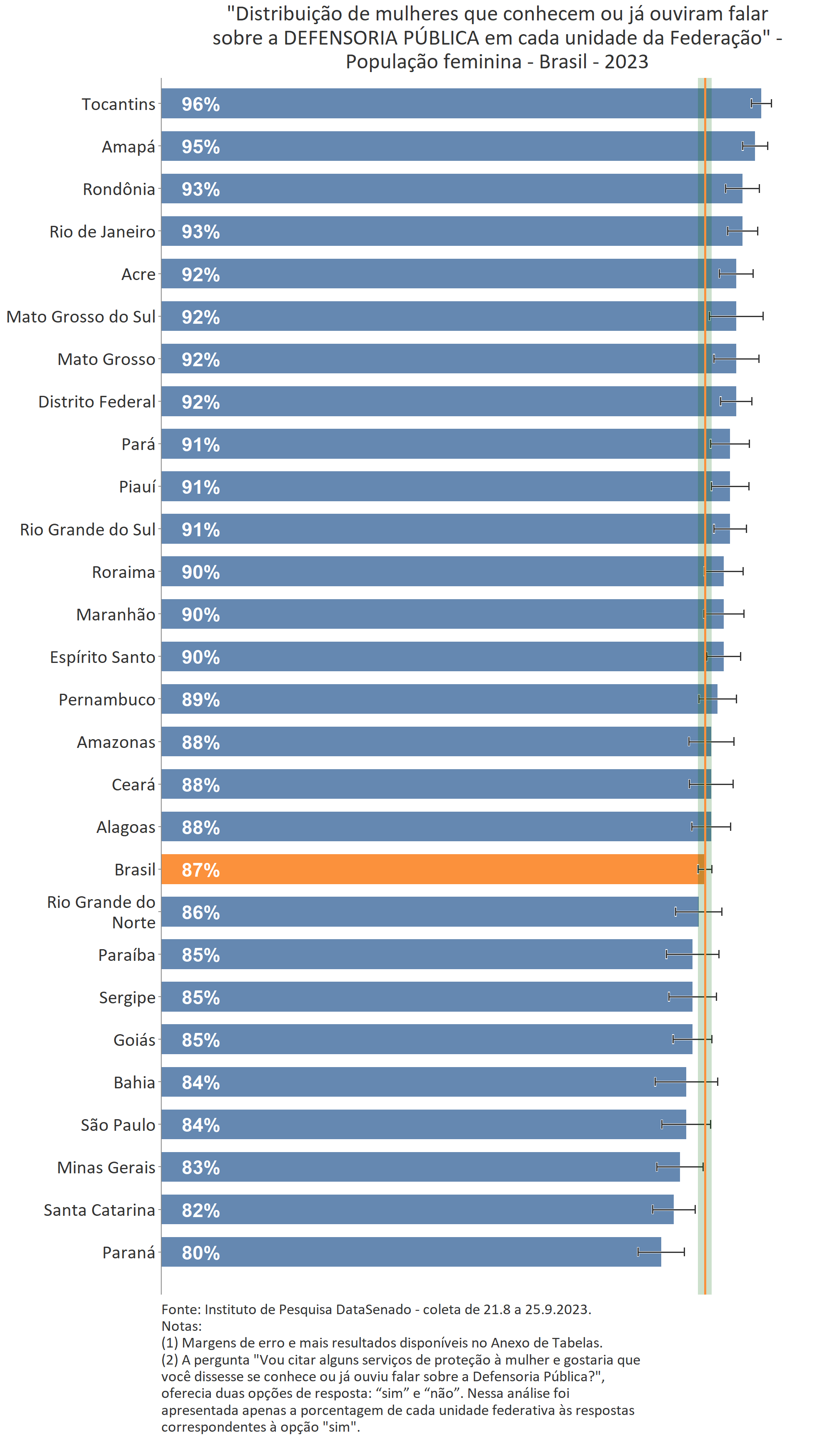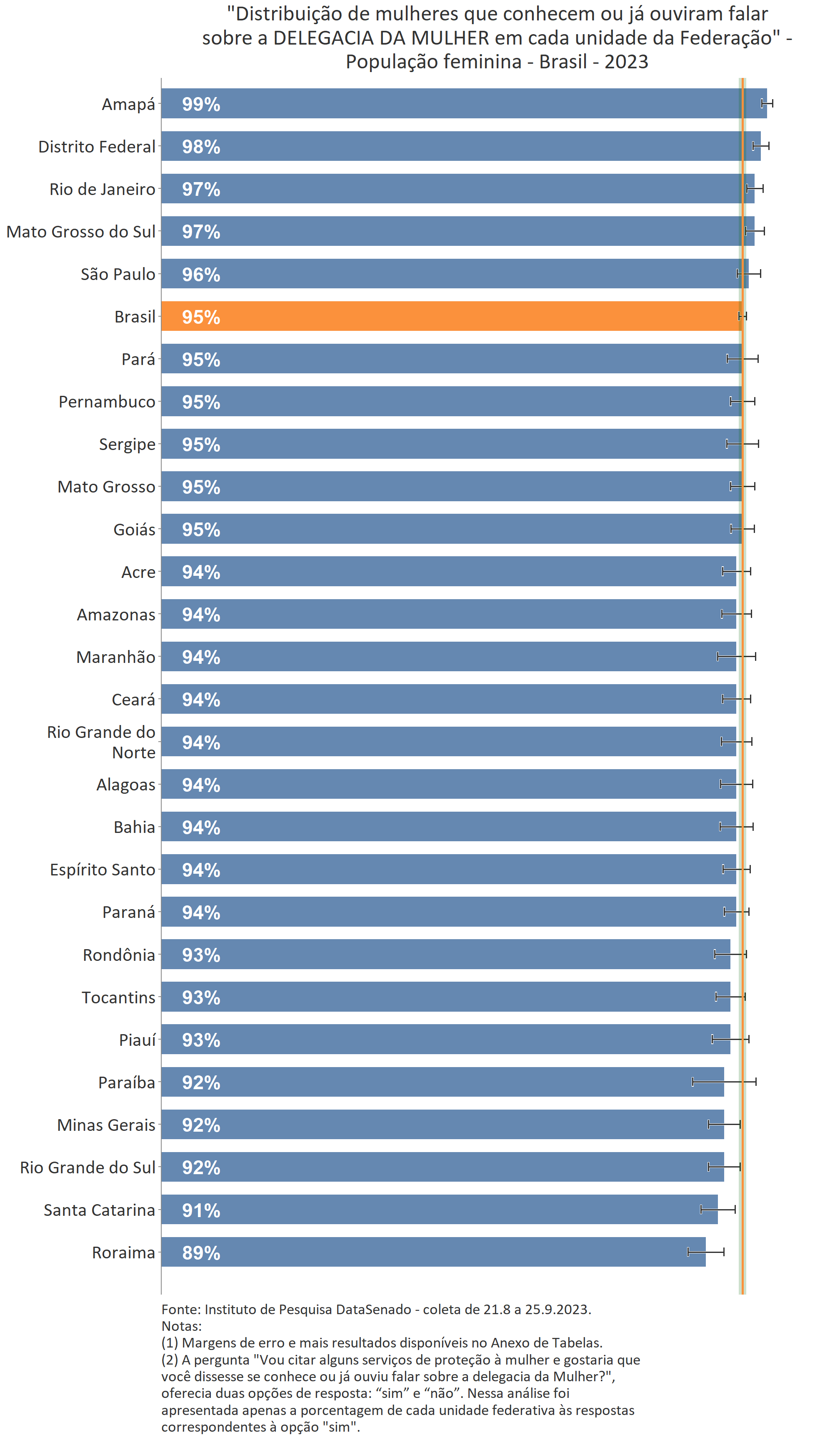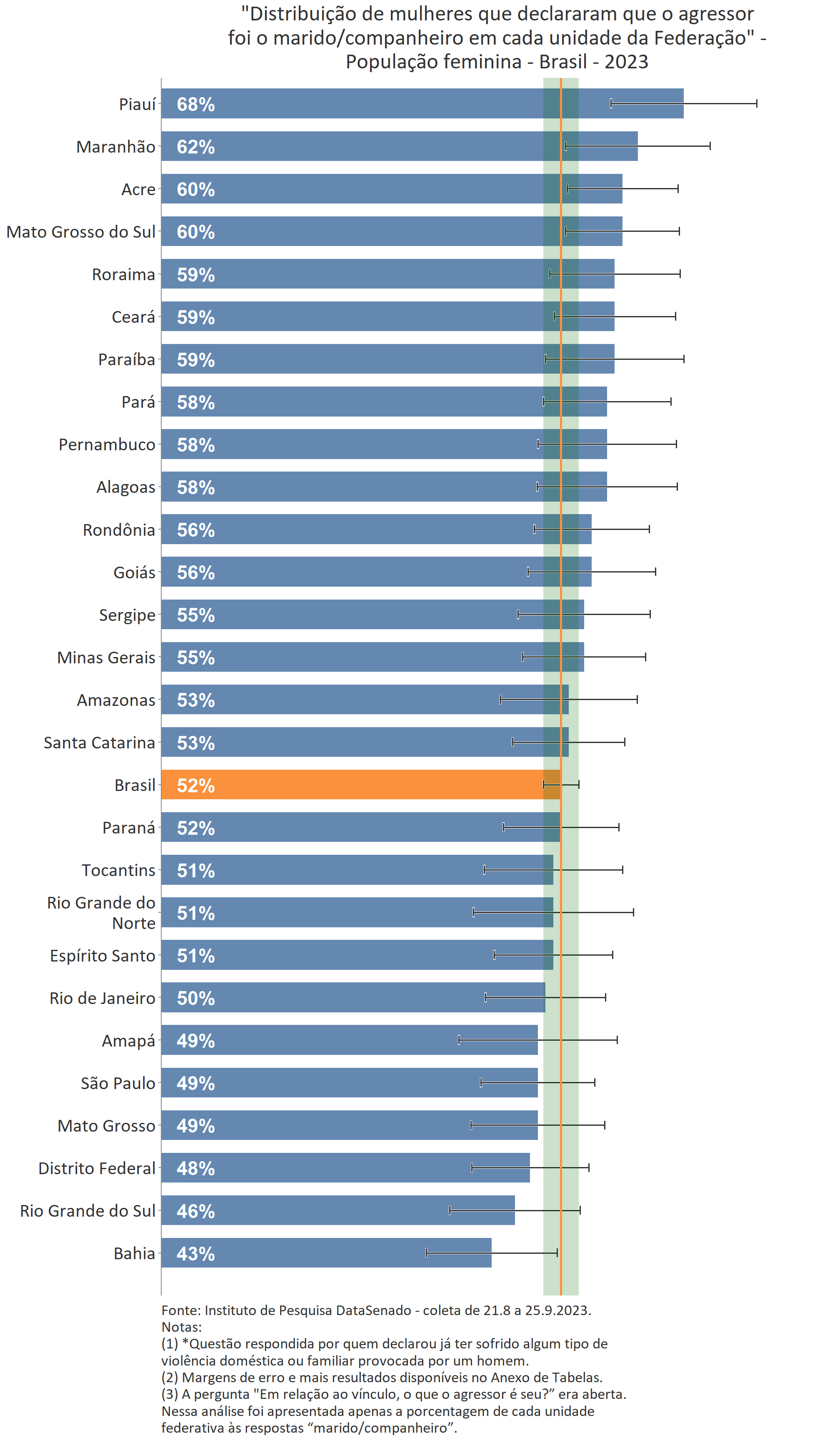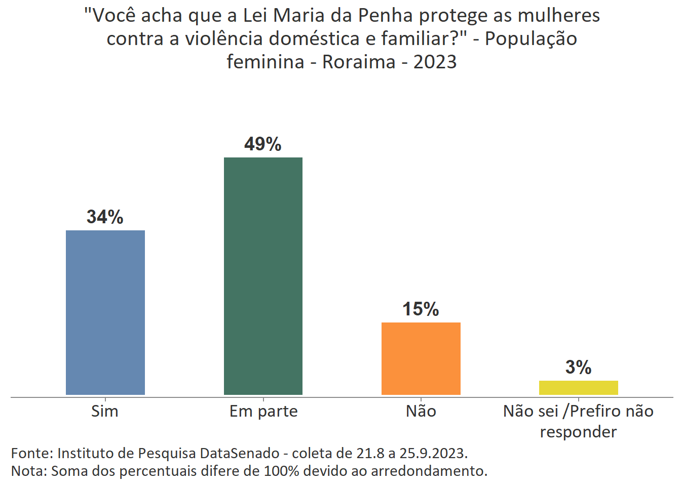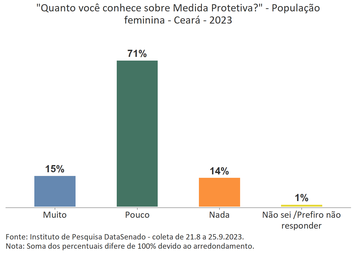 Menos de um quarto das brasileiras (24%) afirmam conhecer muito sobre a Lei Maria da Penha. Esse patamar é superado no Distrito Federal (33%), mas é inferior nos estados do Piauí (17%), do Maranhão (17%), do Amazonas (17%), da Paraíba (19%) e do Pará (19%).