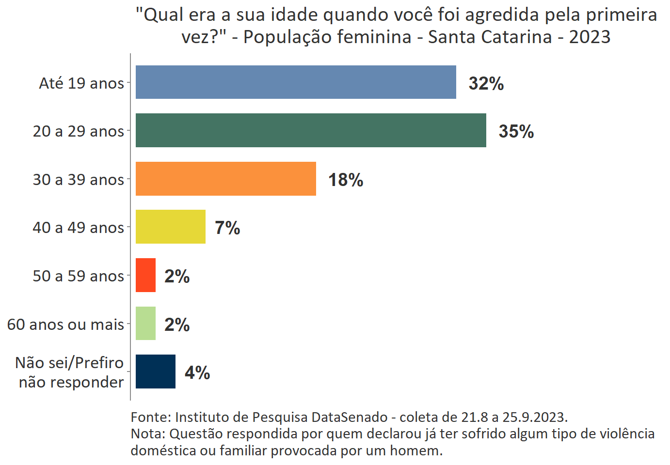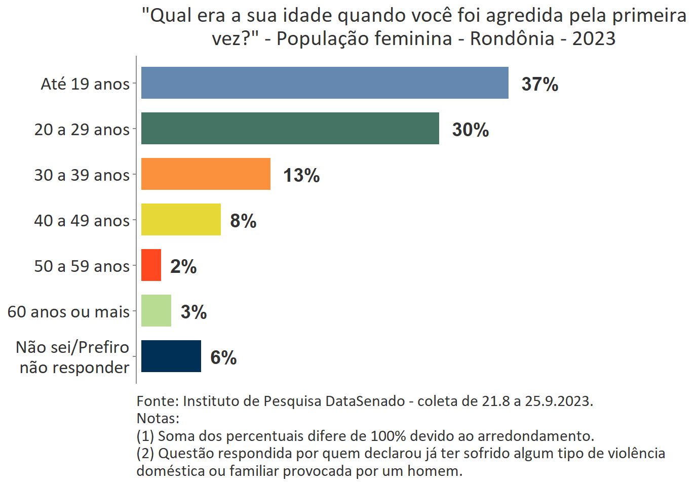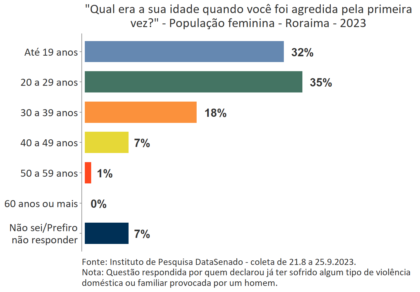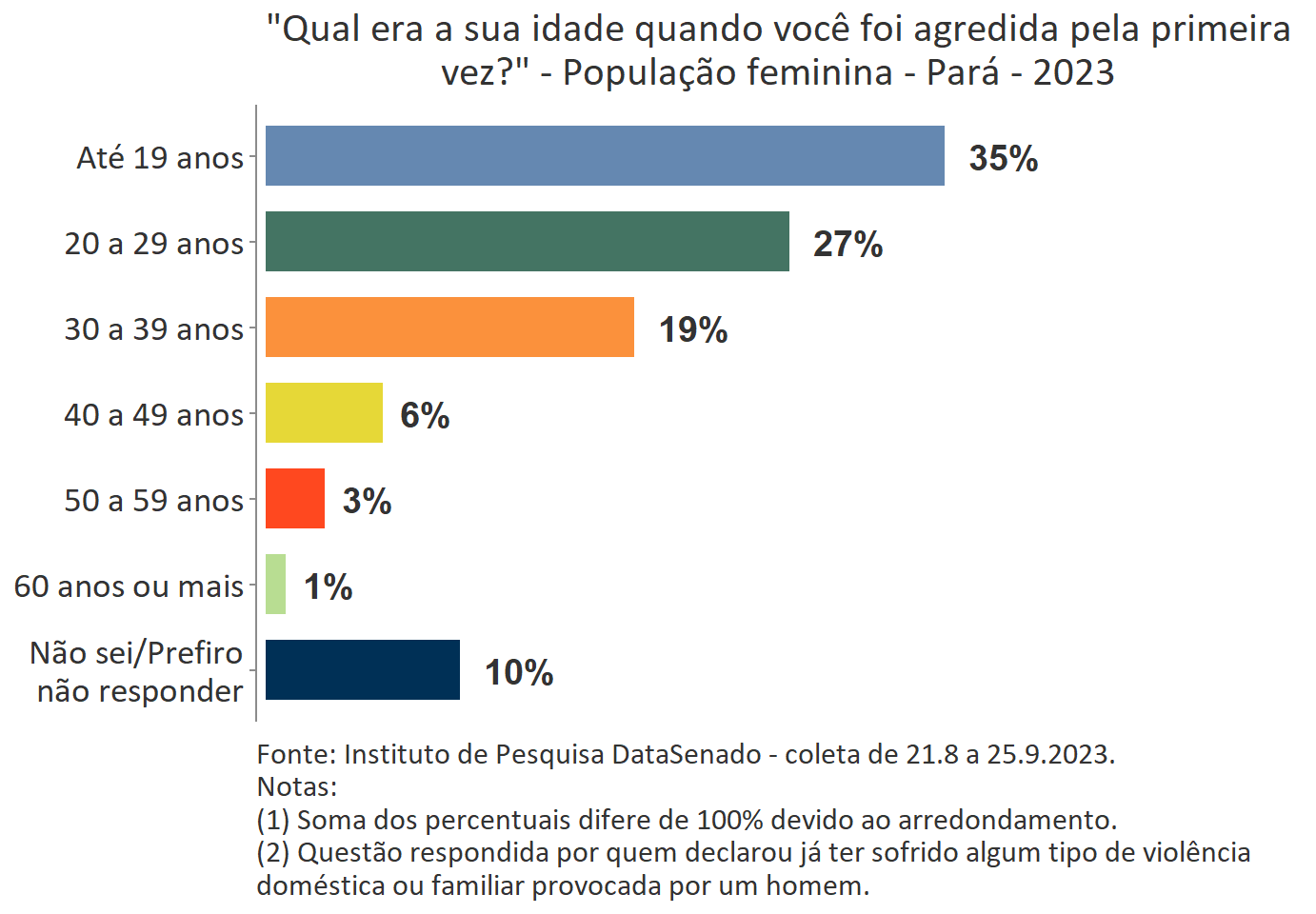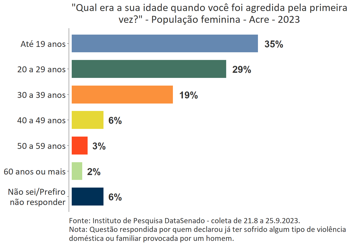 O levantamento mostra que boa parte das vítimas do Acre, a exemplo do que ocorre no Brasil, vivencia a primeira agressão ainda muito jovem. Para 35%, a primeira ocorrência se deu quando tinham até 19 anos de idade.