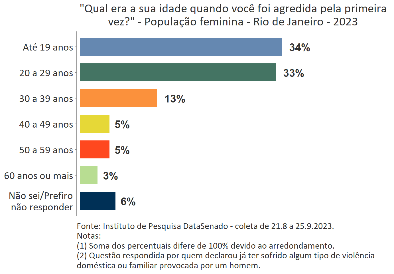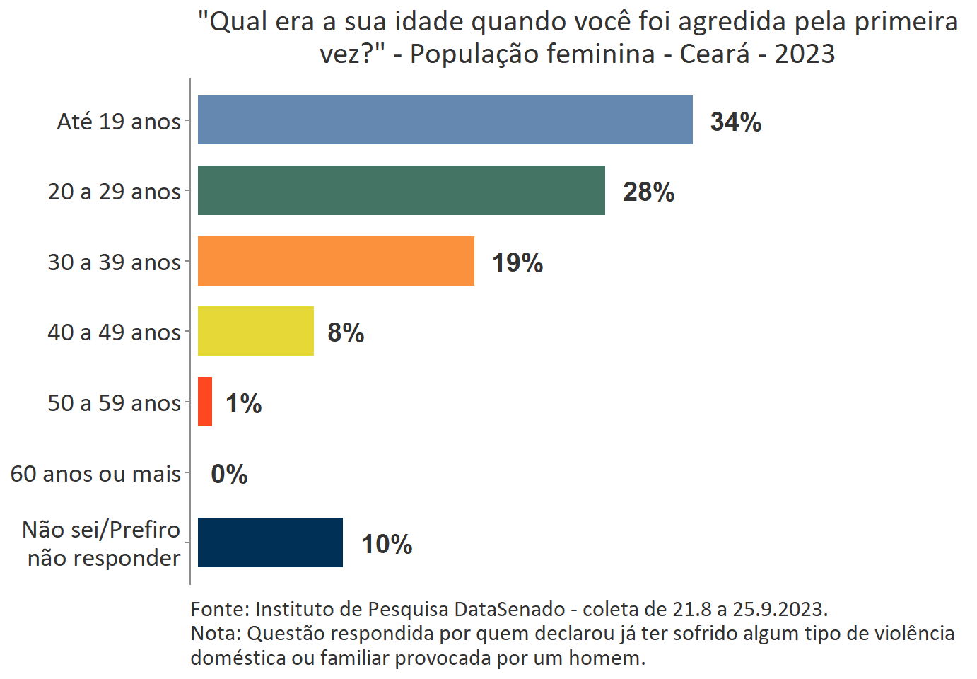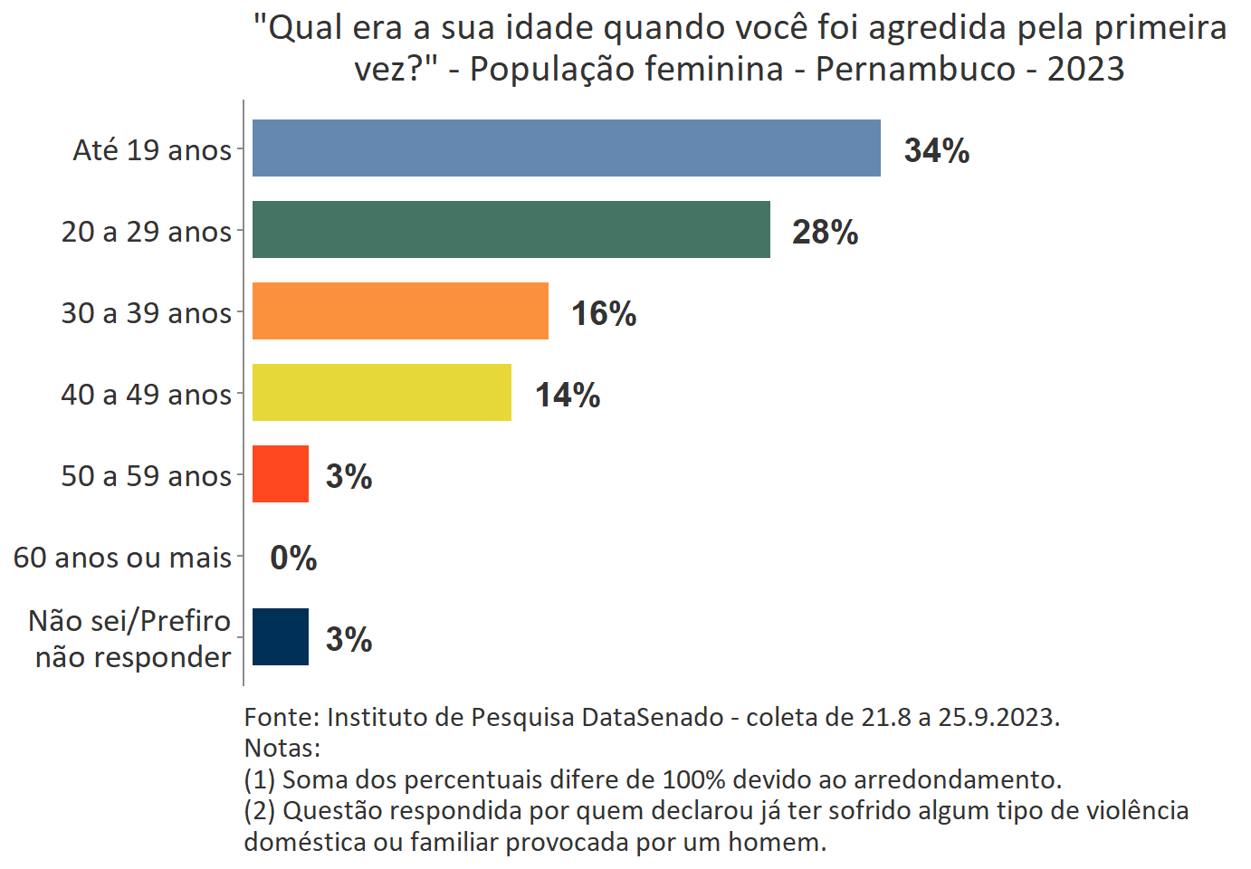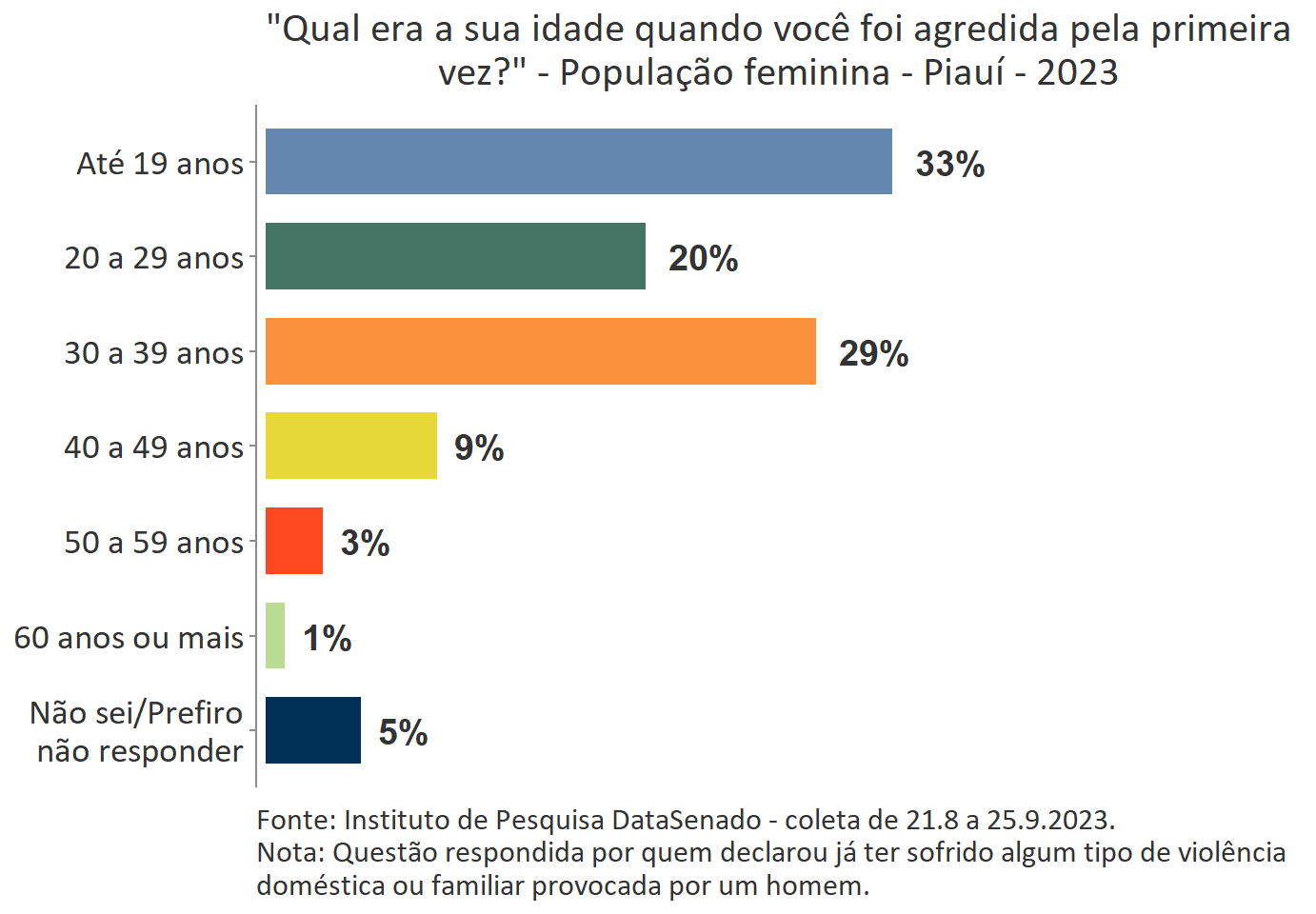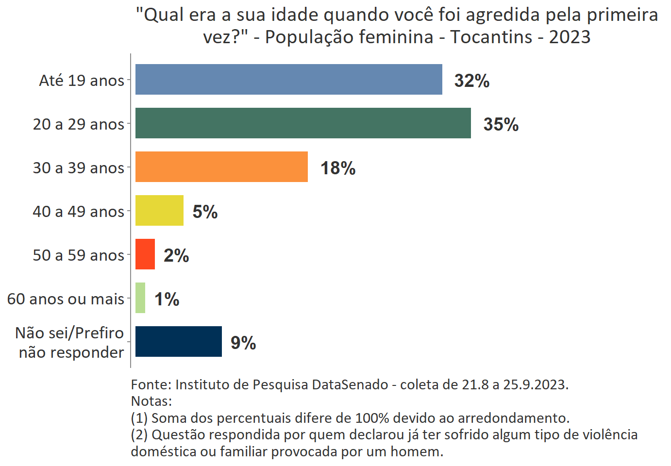 O levantamento mostra que boa parte das vítimas do Acre, a exemplo do que ocorre no Brasil, vivencia a primeira agressão ainda muito jovem. Para 35%, a primeira ocorrência se deu quando tinham até 19 anos de idade.
