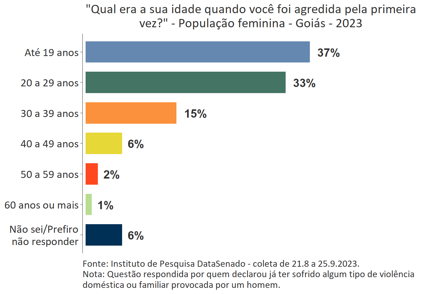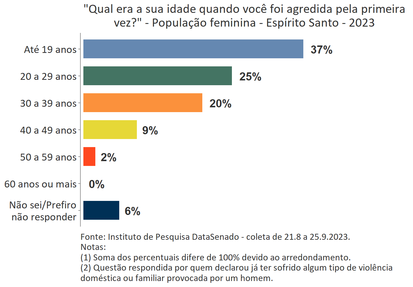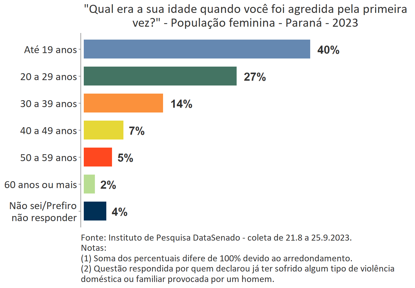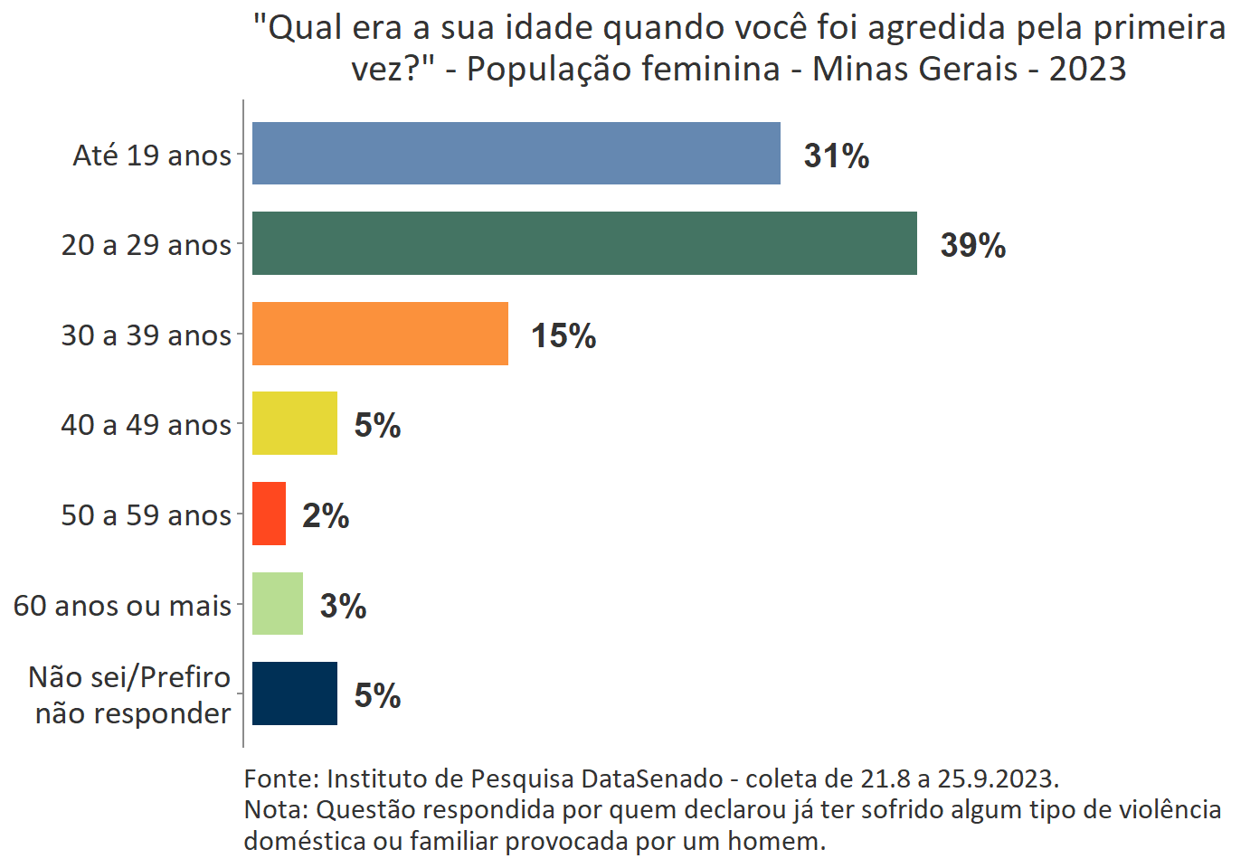 O levantamento mostra que boa parte das vítimas do Acre, a exemplo do que ocorre no Brasil, vivencia a primeira agressão ainda muito jovem. Para 35%, a primeira ocorrência se deu quando tinham até 19 anos de idade.