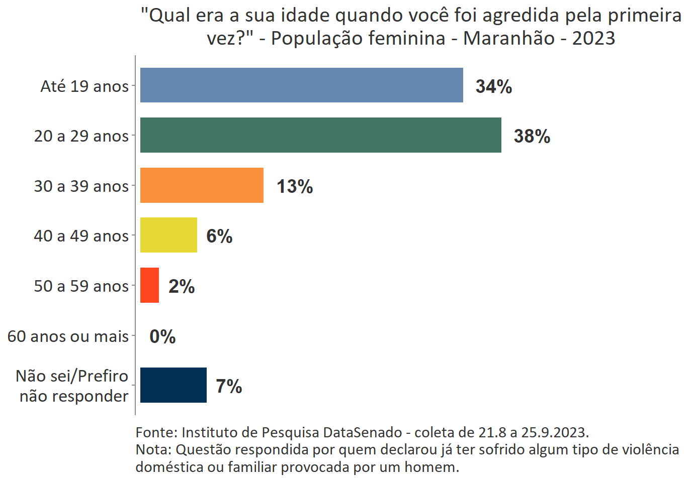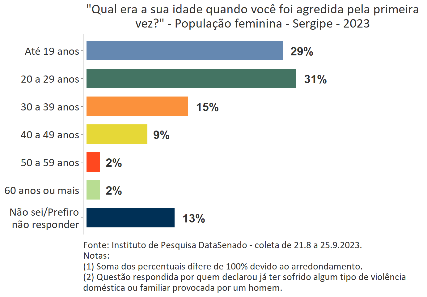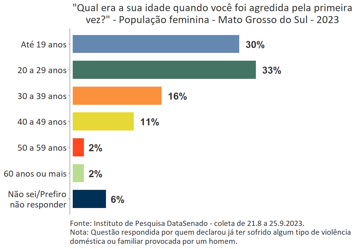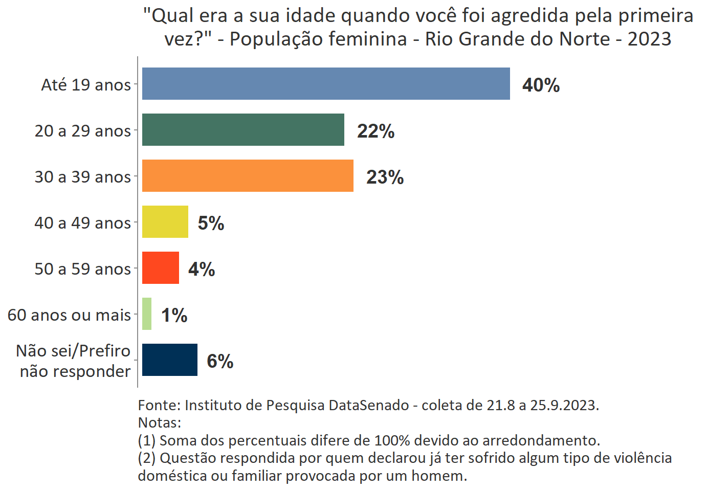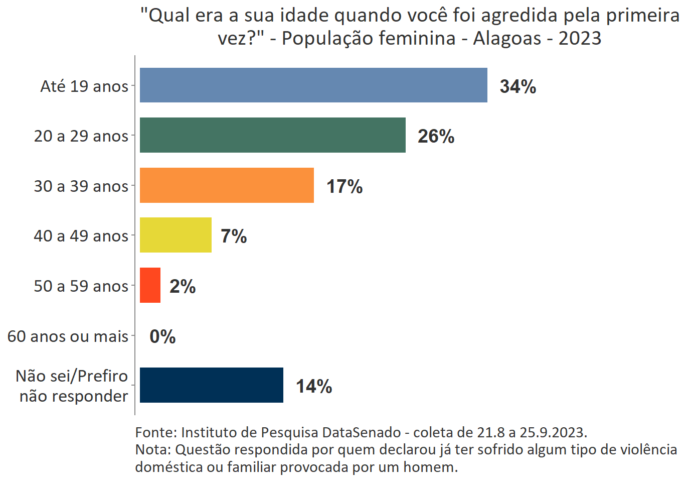 O levantamento mostra que boa parte das vítimas do Acre, a exemplo do que ocorre no Brasil, vivencia a primeira agressão ainda muito jovem. Para 35%, a primeira ocorrência se deu quando tinham até 19 anos de idade.