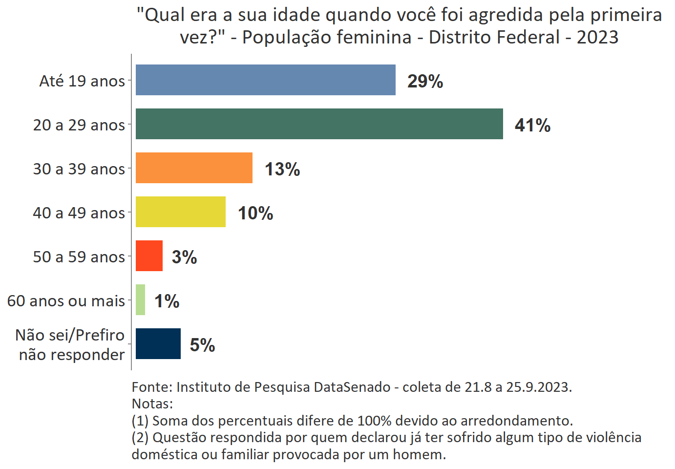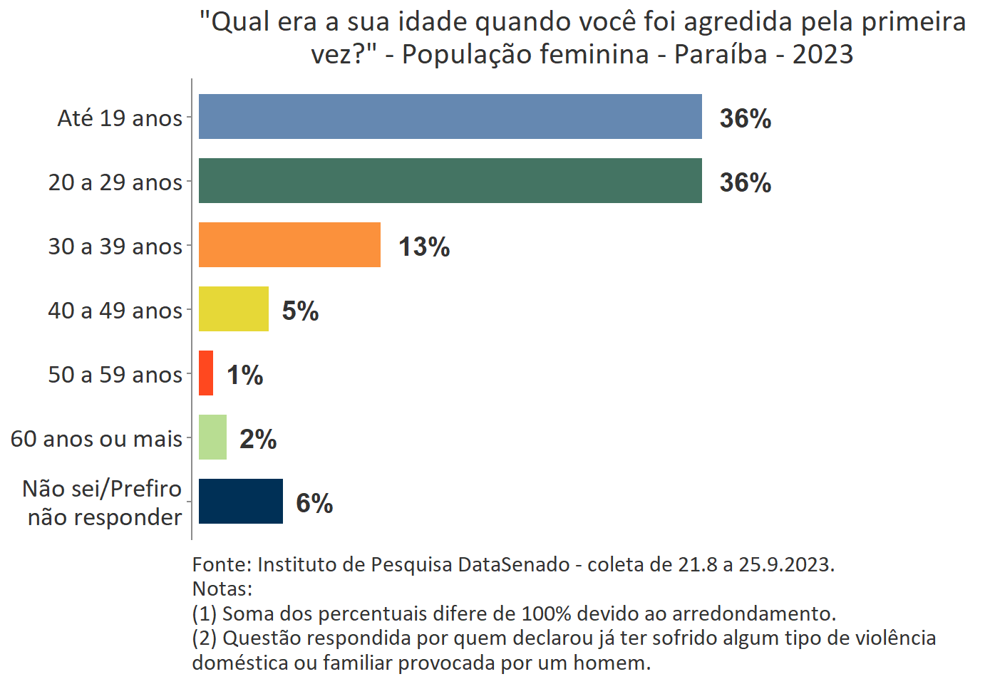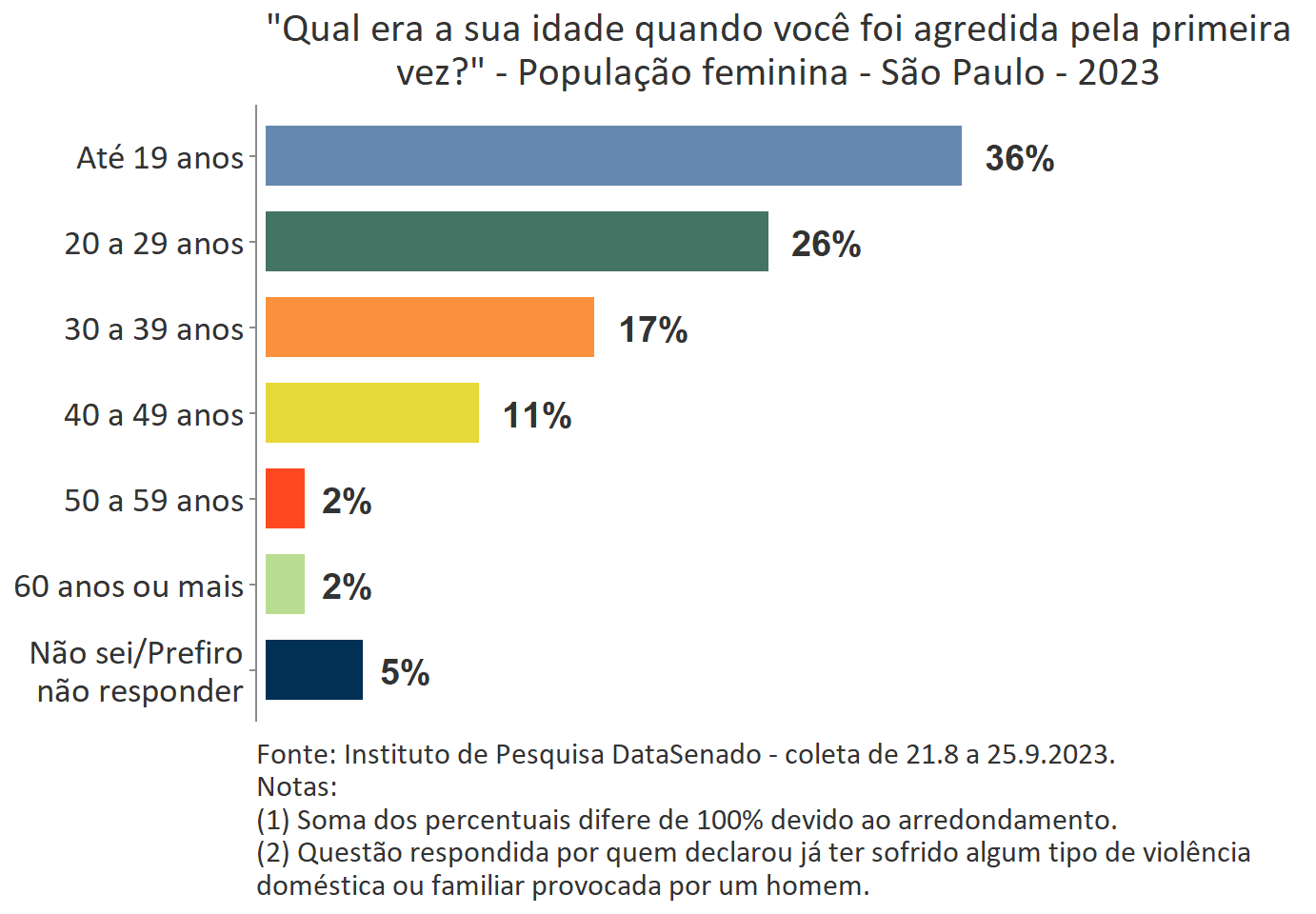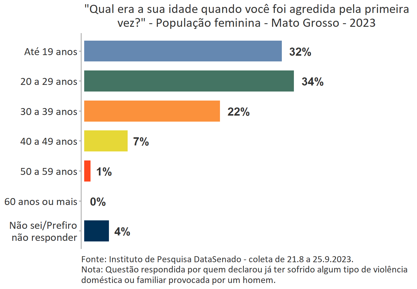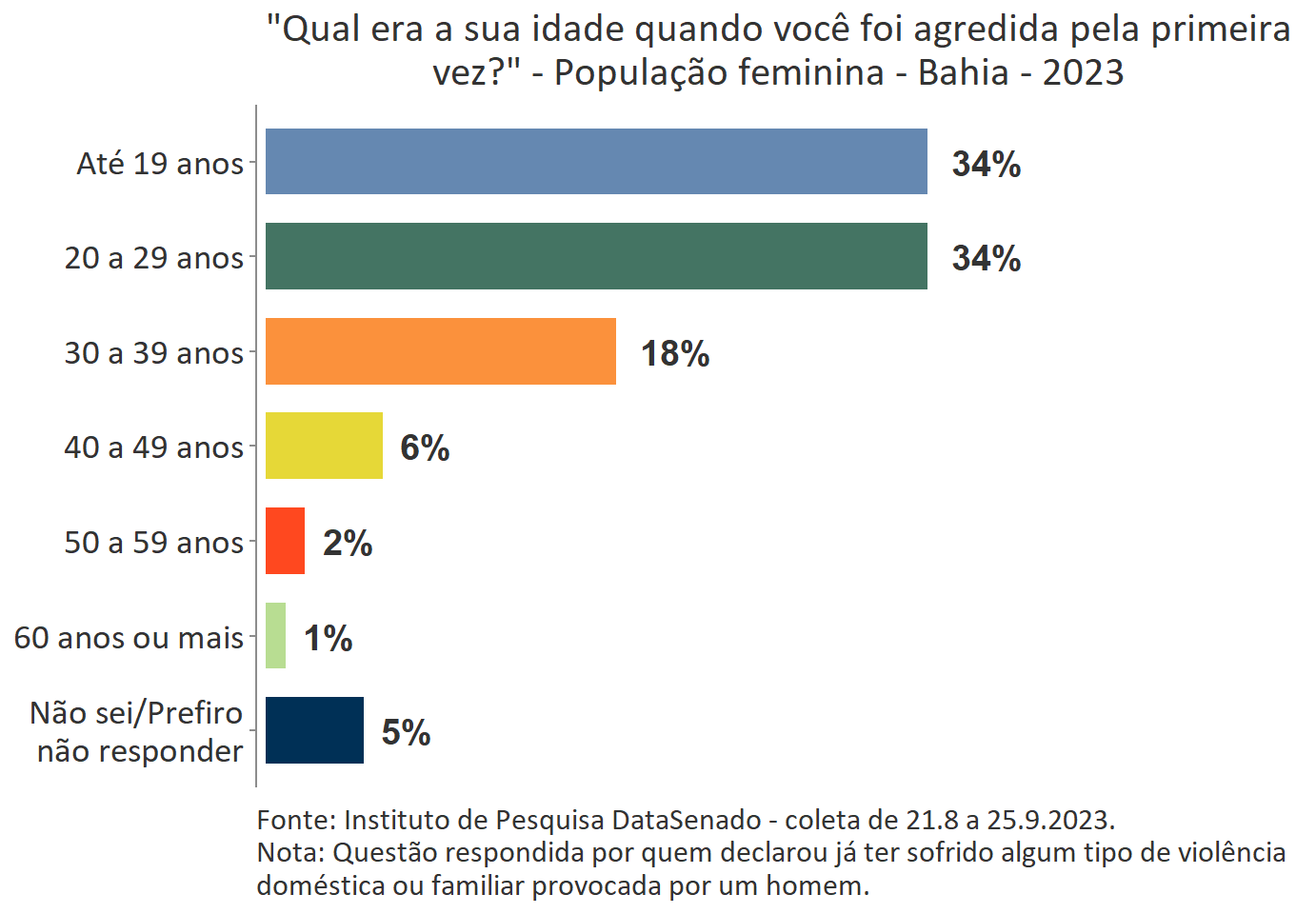 O levantamento mostra que boa parte das vítimas do Acre, a exemplo do que ocorre no Brasil, vivencia a primeira agressão ainda muito jovem. Para 35%, a primeira ocorrência se deu quando tinham até 19 anos de idade.