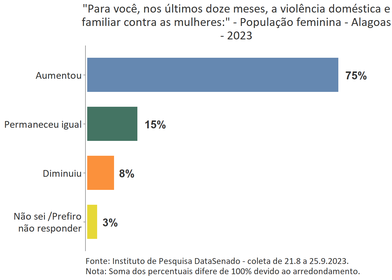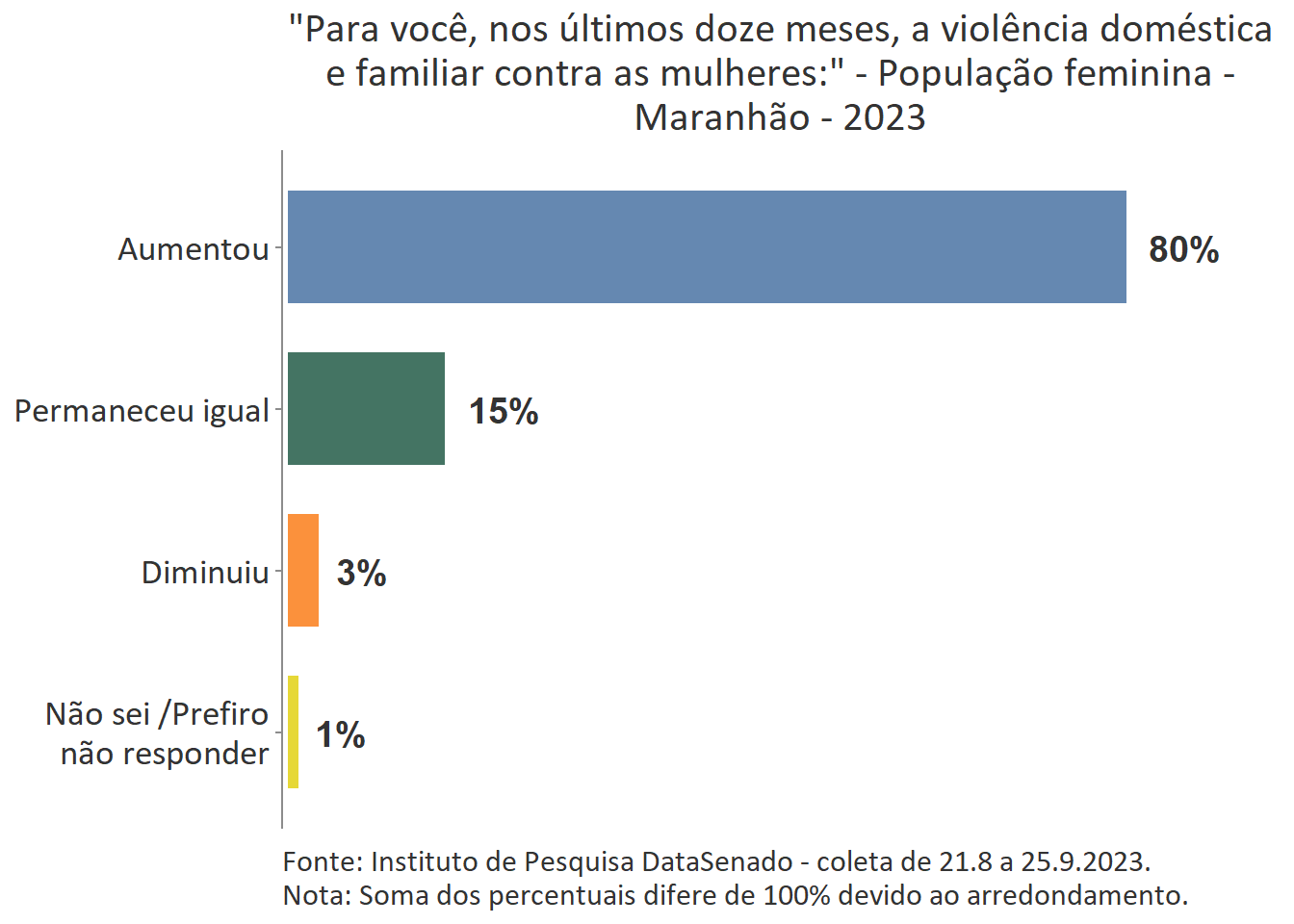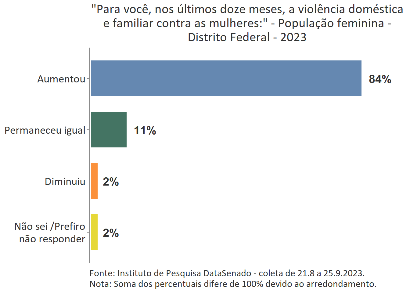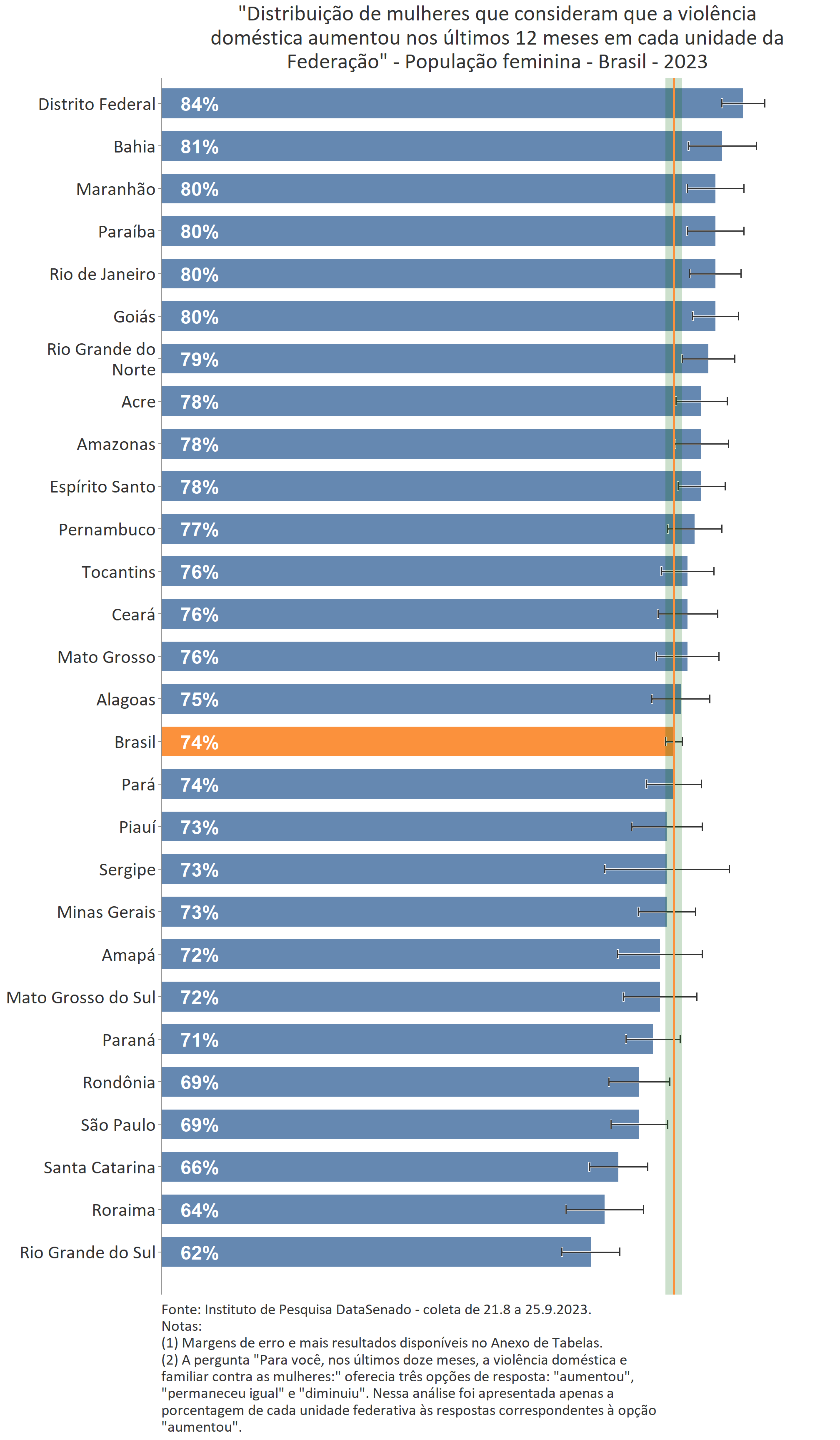 Em todo país é majoritária a percepção de que a violência doméstica aumentou nos últimos 12 meses (74%), com algumas variações nas unidades federativas. Entre as brasilienses, encontra-se o maior número de cidadãs que afirmam que a violência doméstica aumentou (84%) e, entre as gaúchas, o menor número (62%). Entre esses dois polos, estão Goiás (80%), Rio de Janeiro (80%), Paraíba (80%), Maranhão (80%), Bahia (81%), Roraima (64%), Santa Catarina (66%), Rio Grande do sul (62%) e as demais unidades federativas, cujos patamares são estatisticamente equivalentes ao nacional.