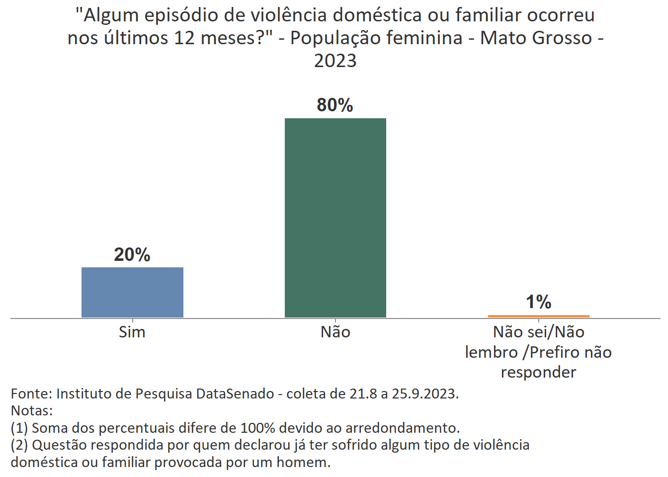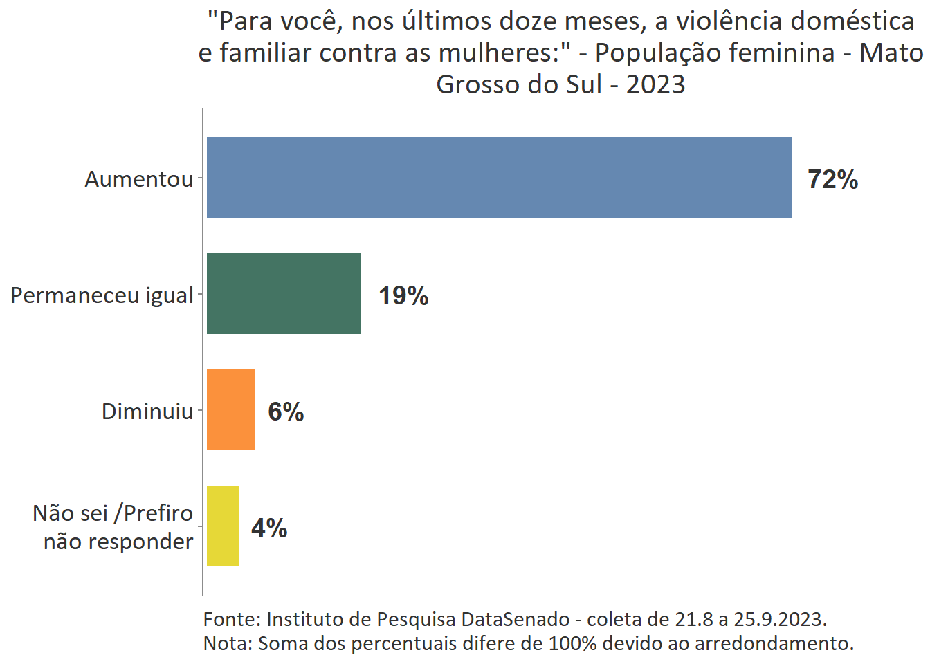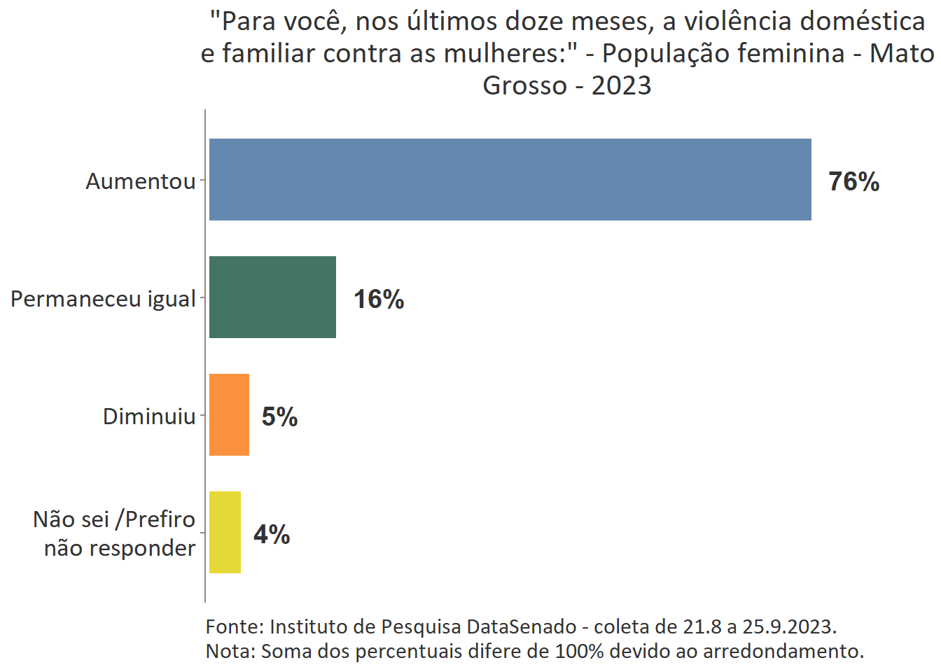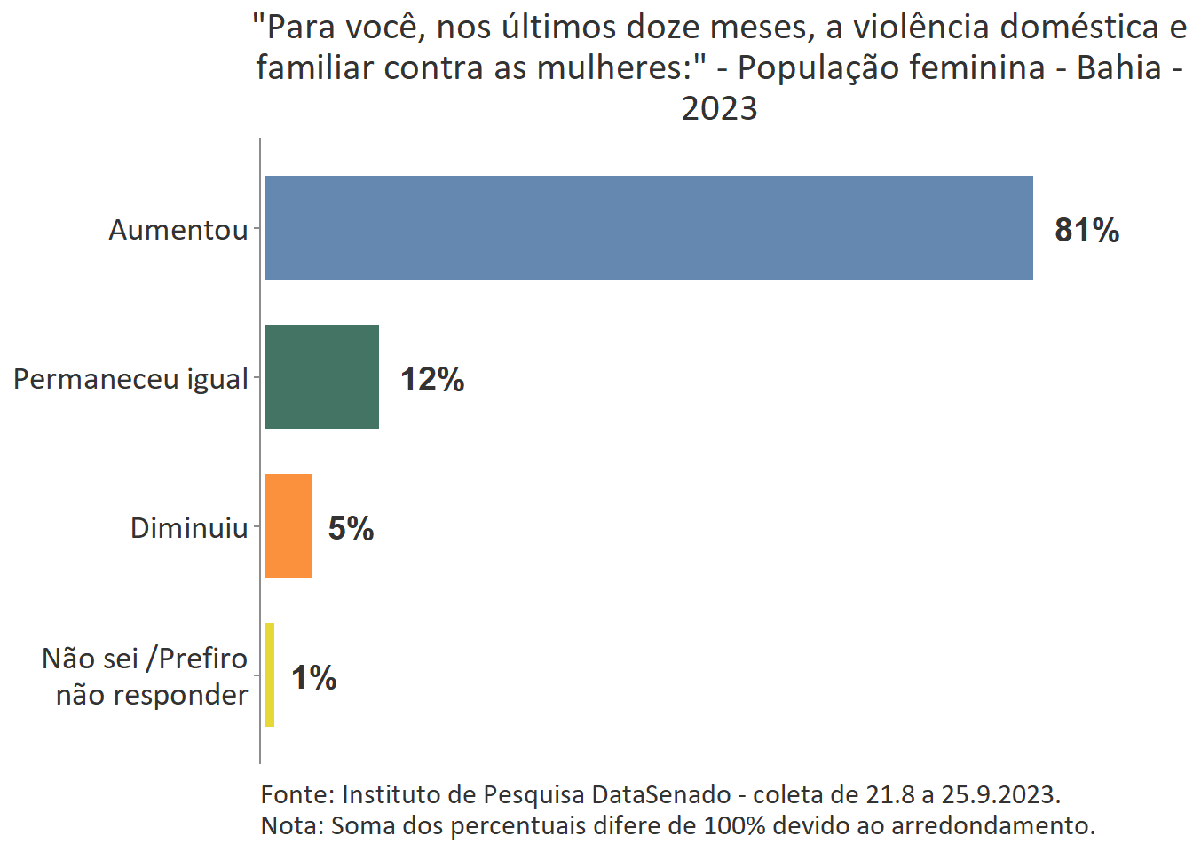Em todo país é majoritária a percepção de que a violência doméstica aumentou nos últimos 12 meses (74%), com algumas variações nas unidades federativas. Entre as brasilienses, encontra-se o maior número de cidadãs que afirmam que a violência doméstica aumentou (84%) e, entre as gaúchas, o menor número (62%). Entre esses dois polos, estão Goiás (80%), Rio de Janeiro (80%), Paraíba (80%), Maranhão (80%), Bahia (81%), Roraima (64%), Santa Catarina (66%), Rio Grande do sul (62%) e as demais unidades federativas, cujos patamares são estatisticamente equivalentes ao nacional.