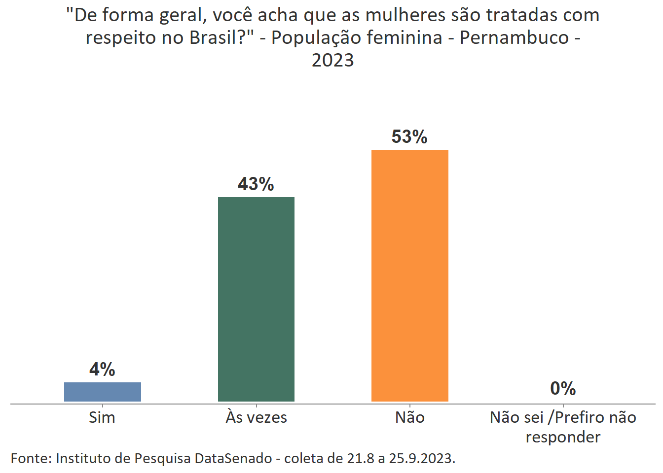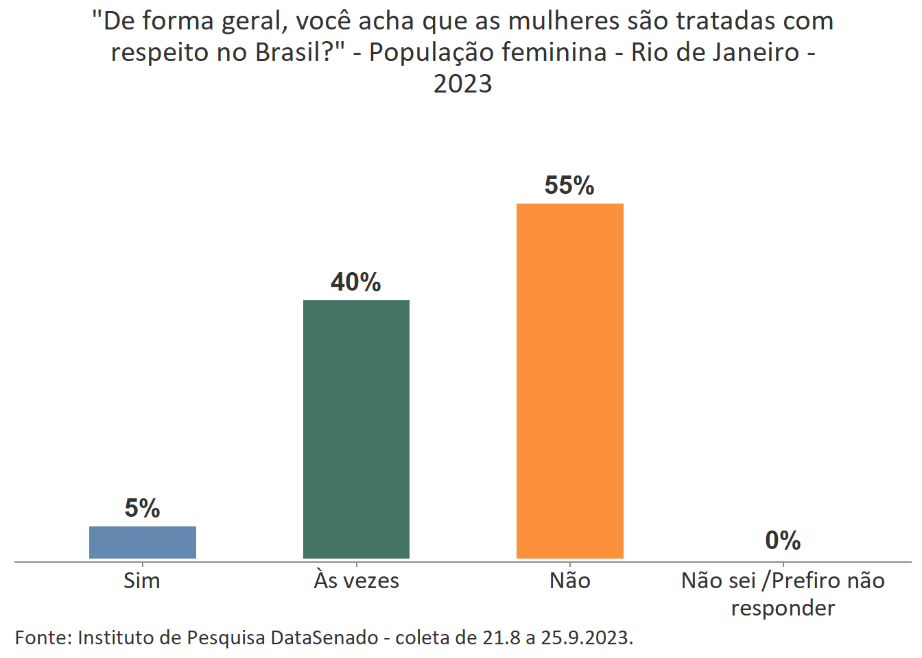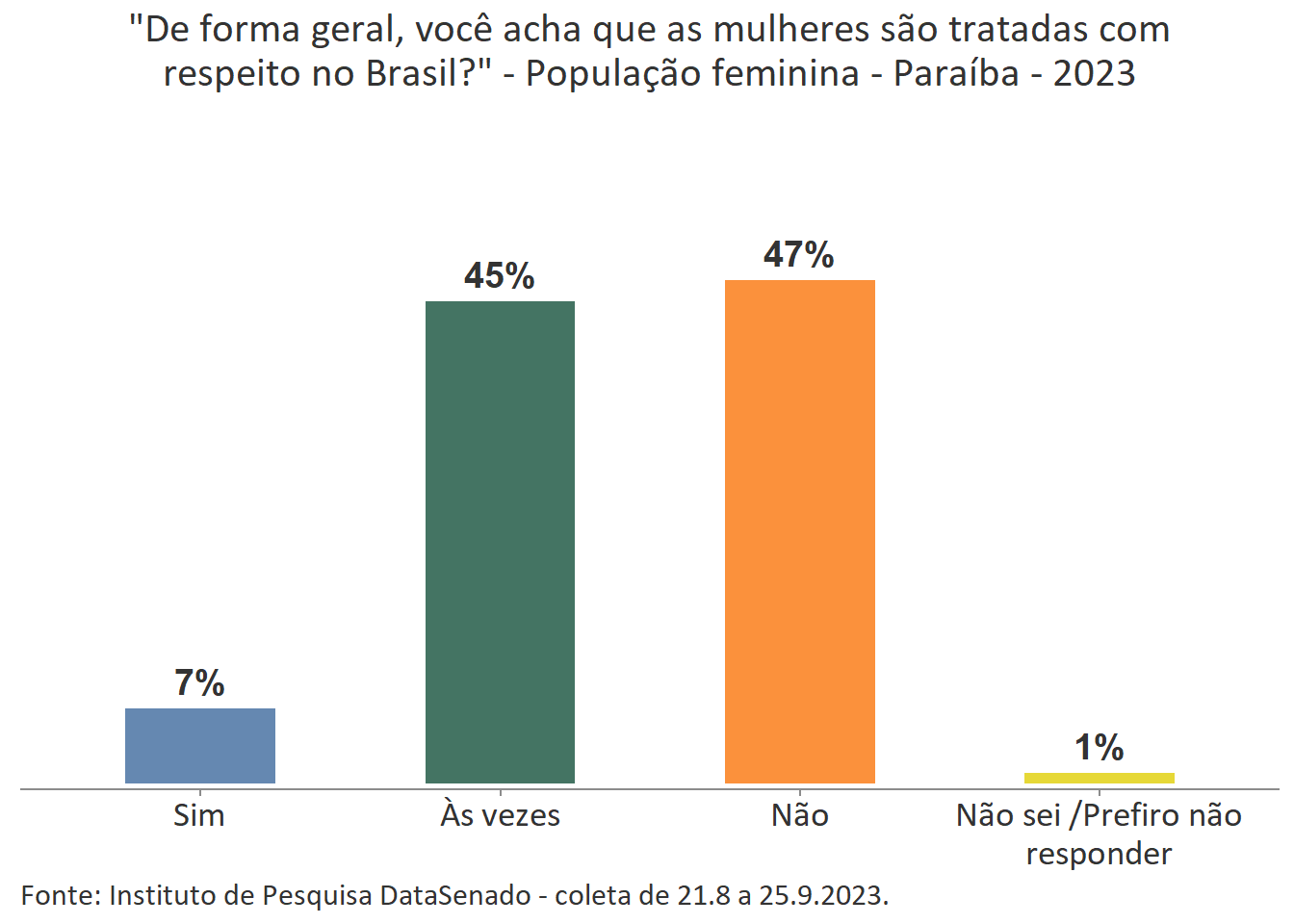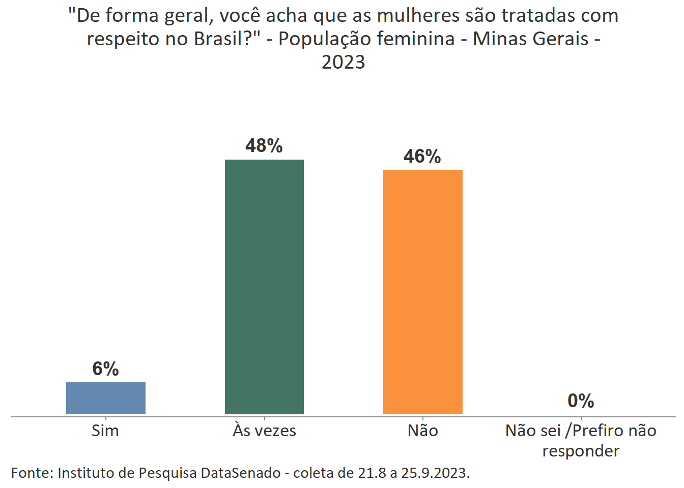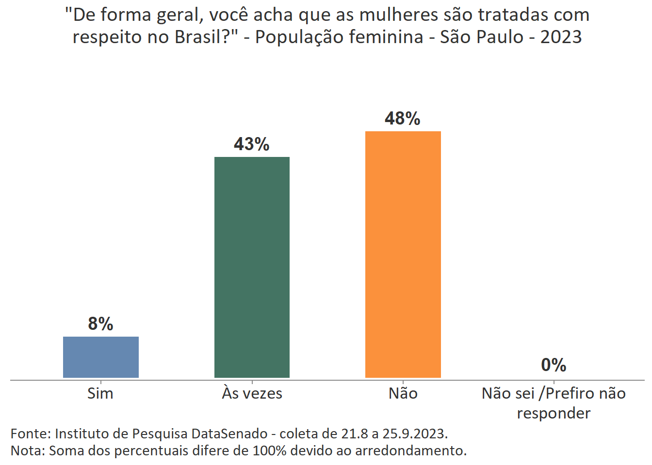 Pesquisa nacional realizada em 2023 pelo Instituto de Pesquisa DataSenado mostra que 46% das brasileiras acreditam que em geral as mulheres não são tratadas com respeito no Brasil, e que outras 46% acreditam que as mulheres são tratadas com respeito apenas às vezes. Para a menor parte delas (7%), as mulheres são, sim, tratadas com respeito no país.