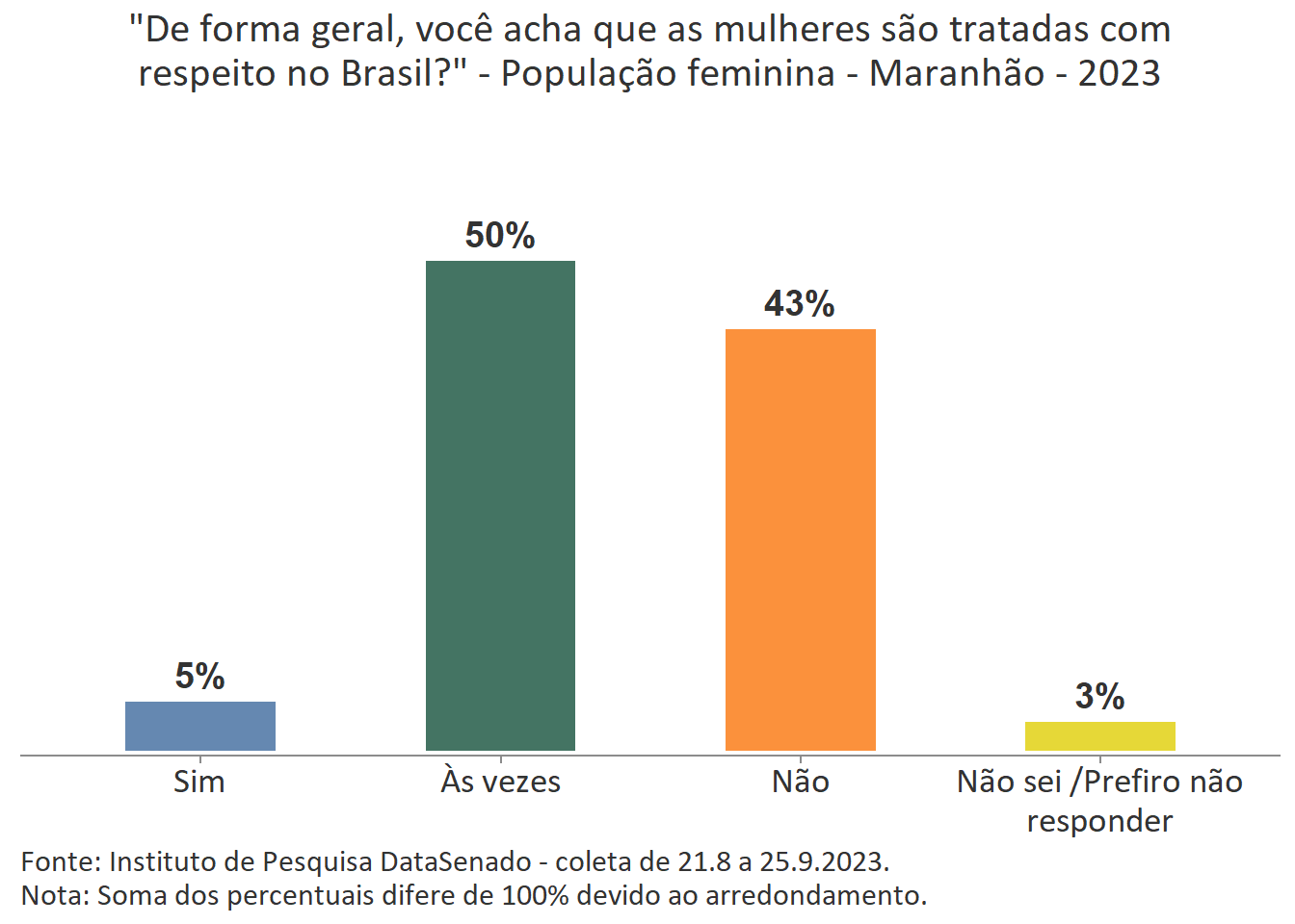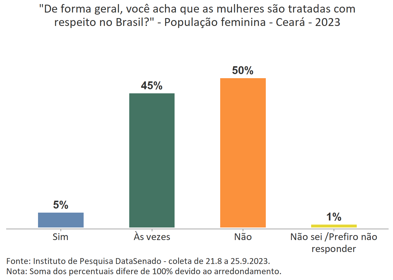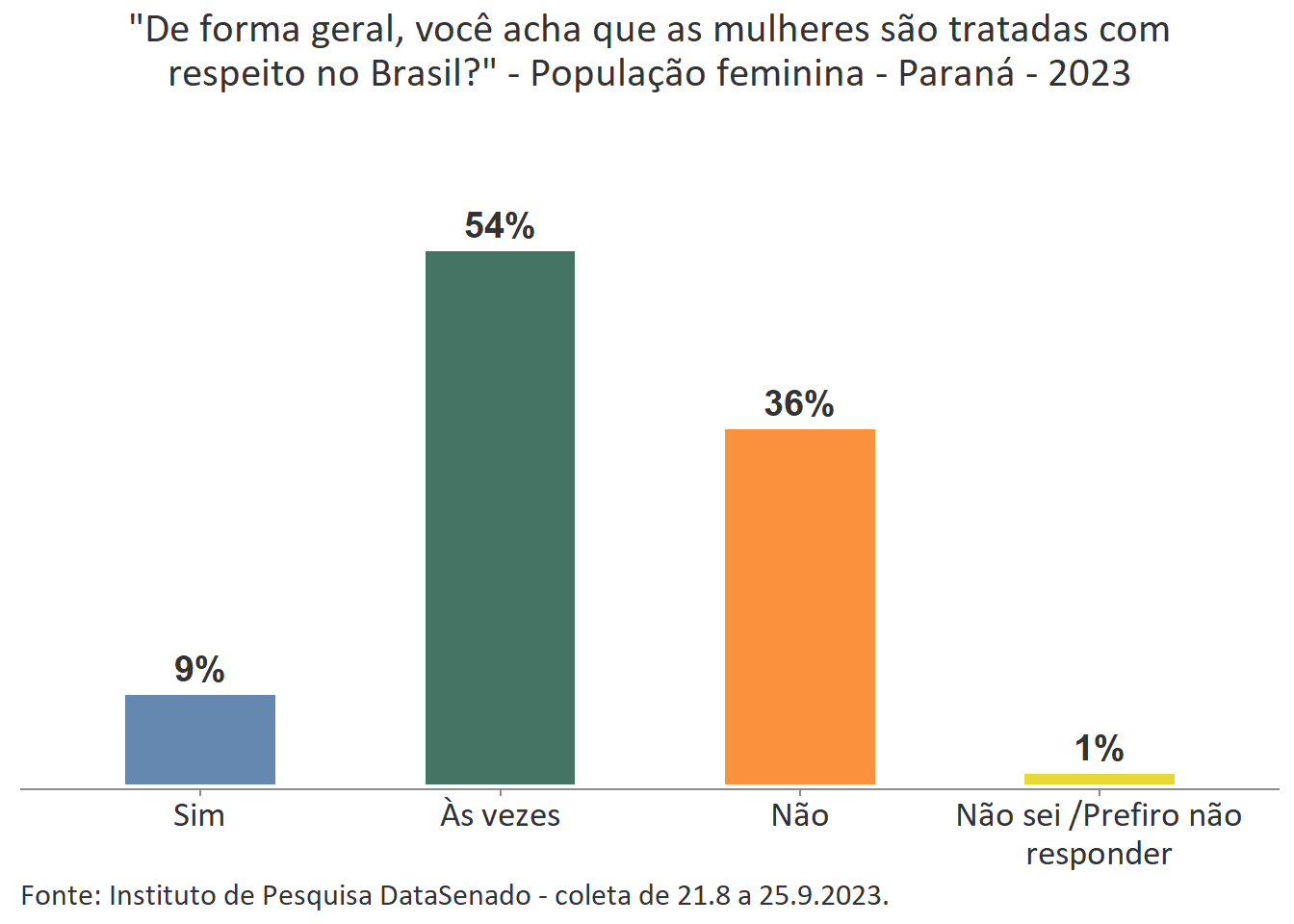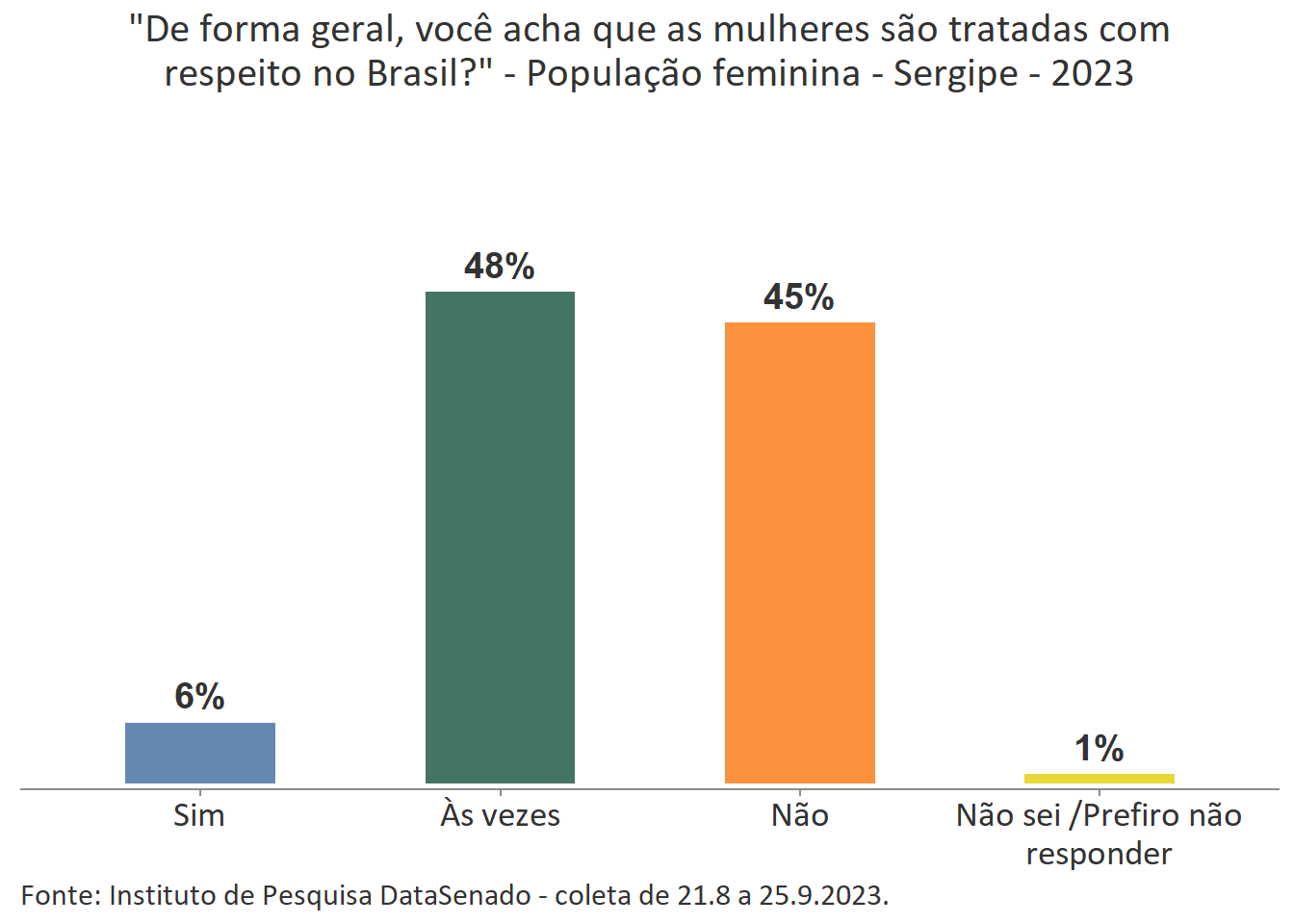 Pesquisa nacional realizada em 2023 pelo Instituto de Pesquisa DataSenado mostra que 46% das brasileiras acreditam que em geral as mulheres não são tratadas com respeito no Brasil, e que outras 46% acreditam que as mulheres são tratadas com respeito apenas às vezes. Para a menor parte delas (7%), as mulheres são, sim, tratadas com respeito no país.