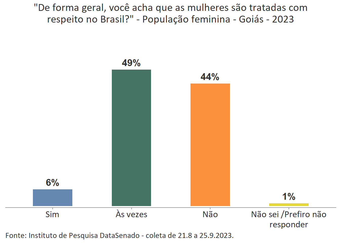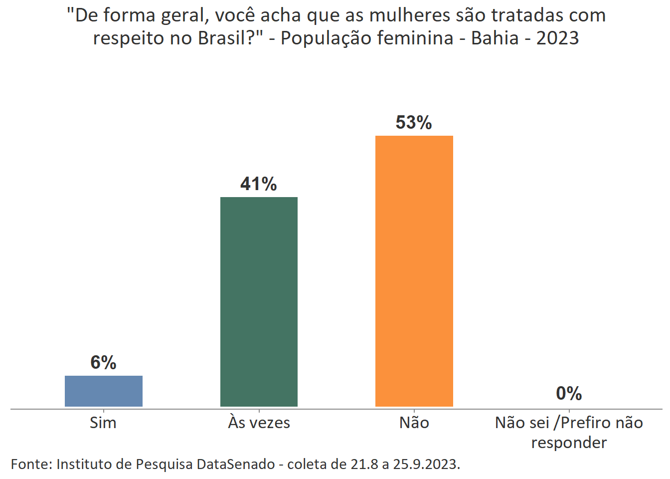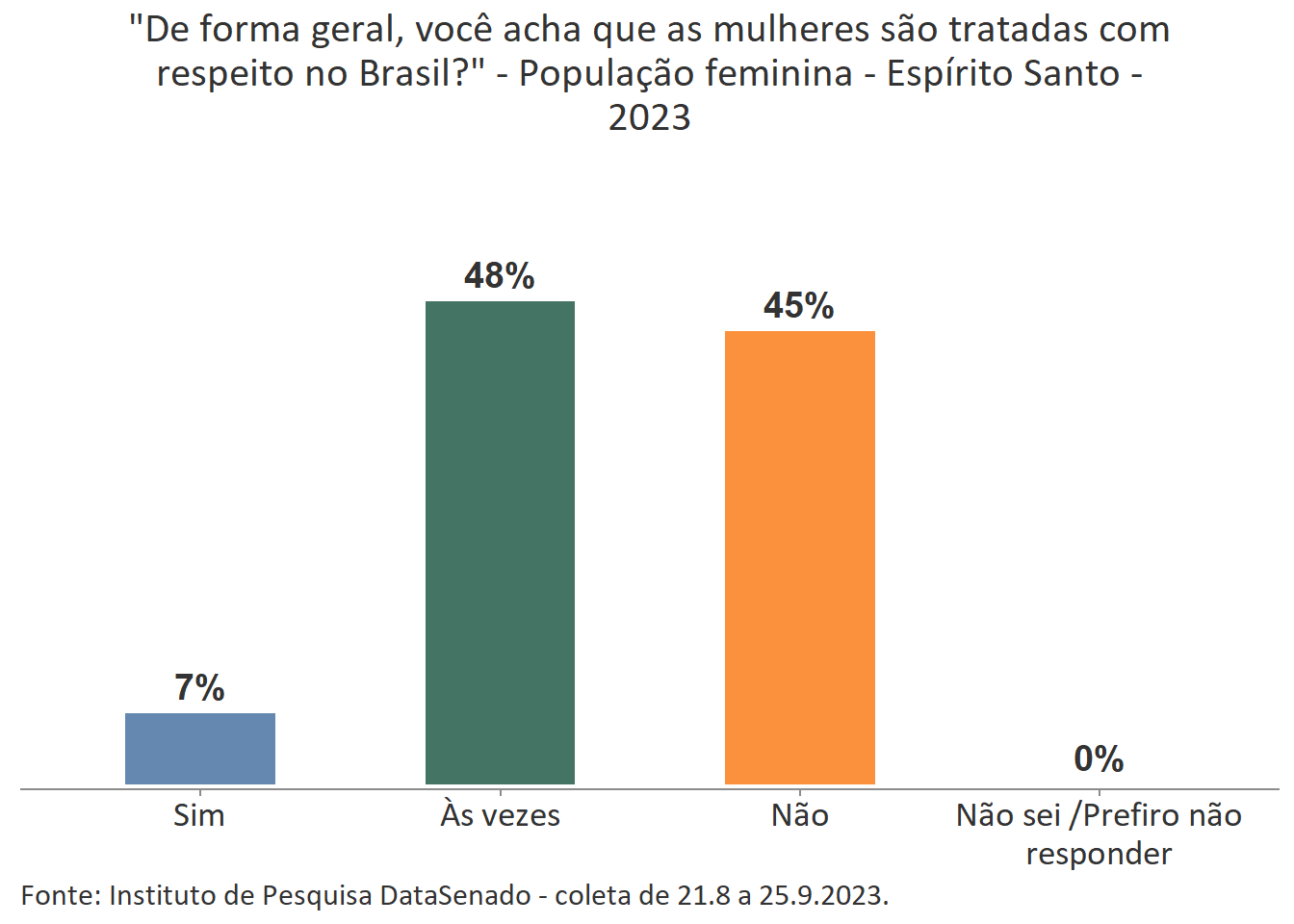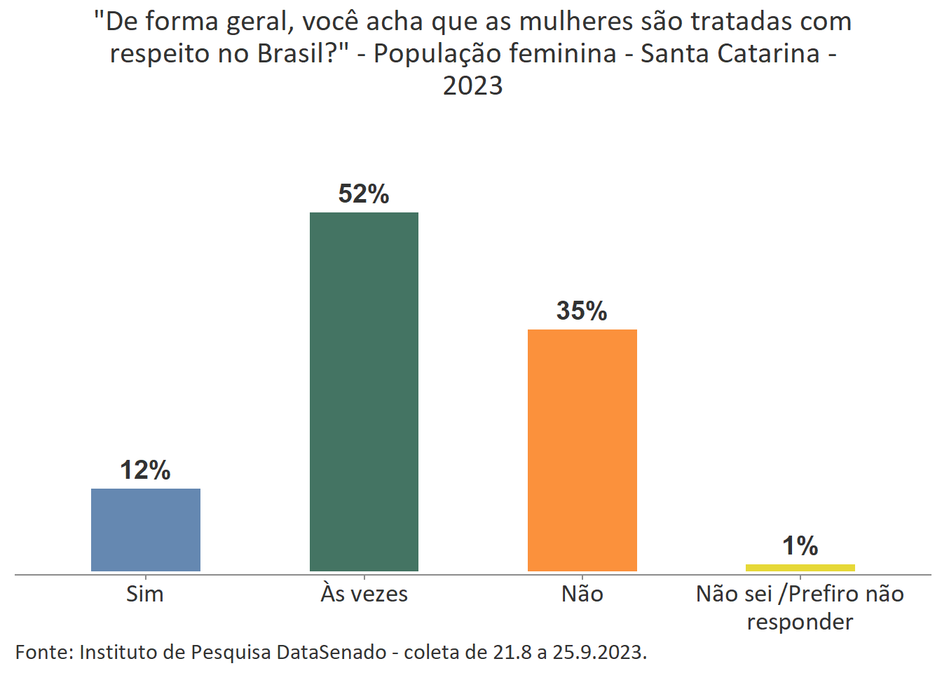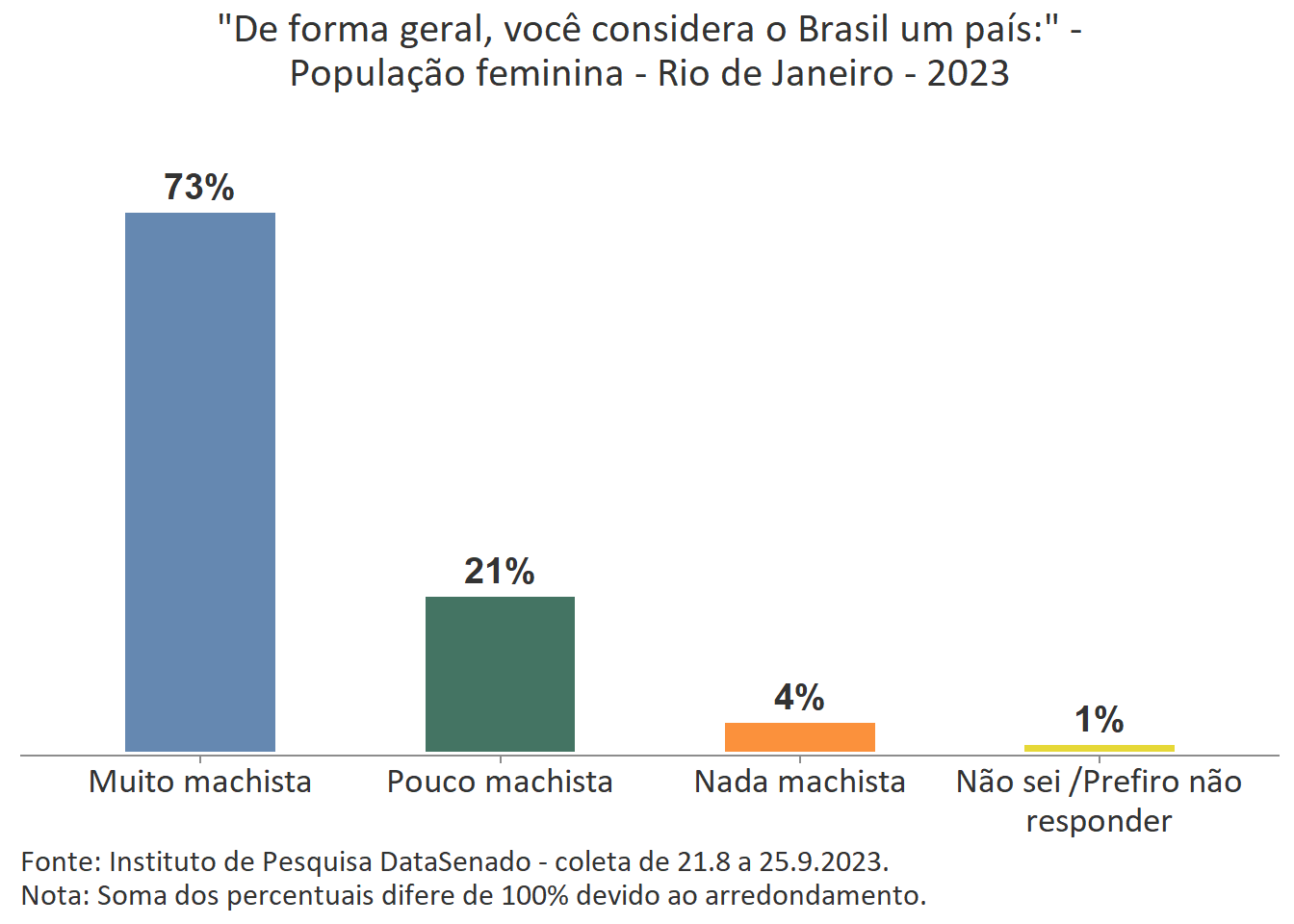 Pesquisa nacional realizada em 2023 pelo Instituto de Pesquisa DataSenado mostra que 46% das brasileiras acreditam que em geral as mulheres não são tratadas com respeito no Brasil, e que outras 46% acreditam que as mulheres são tratadas com respeito apenas às vezes. Para a menor parte delas (7%), as mulheres são, sim, tratadas com respeito no país.