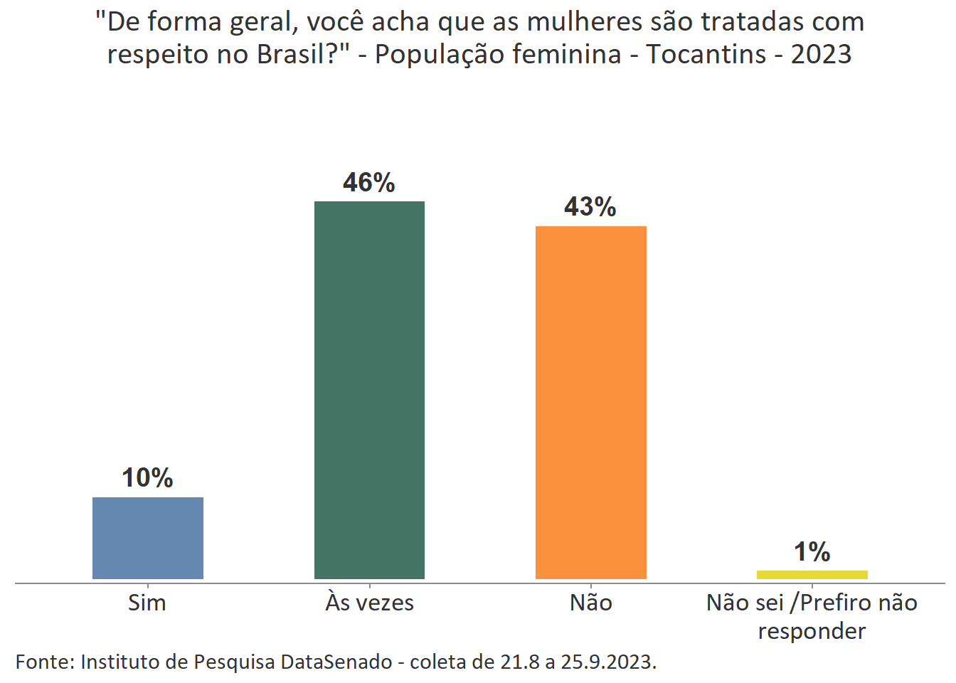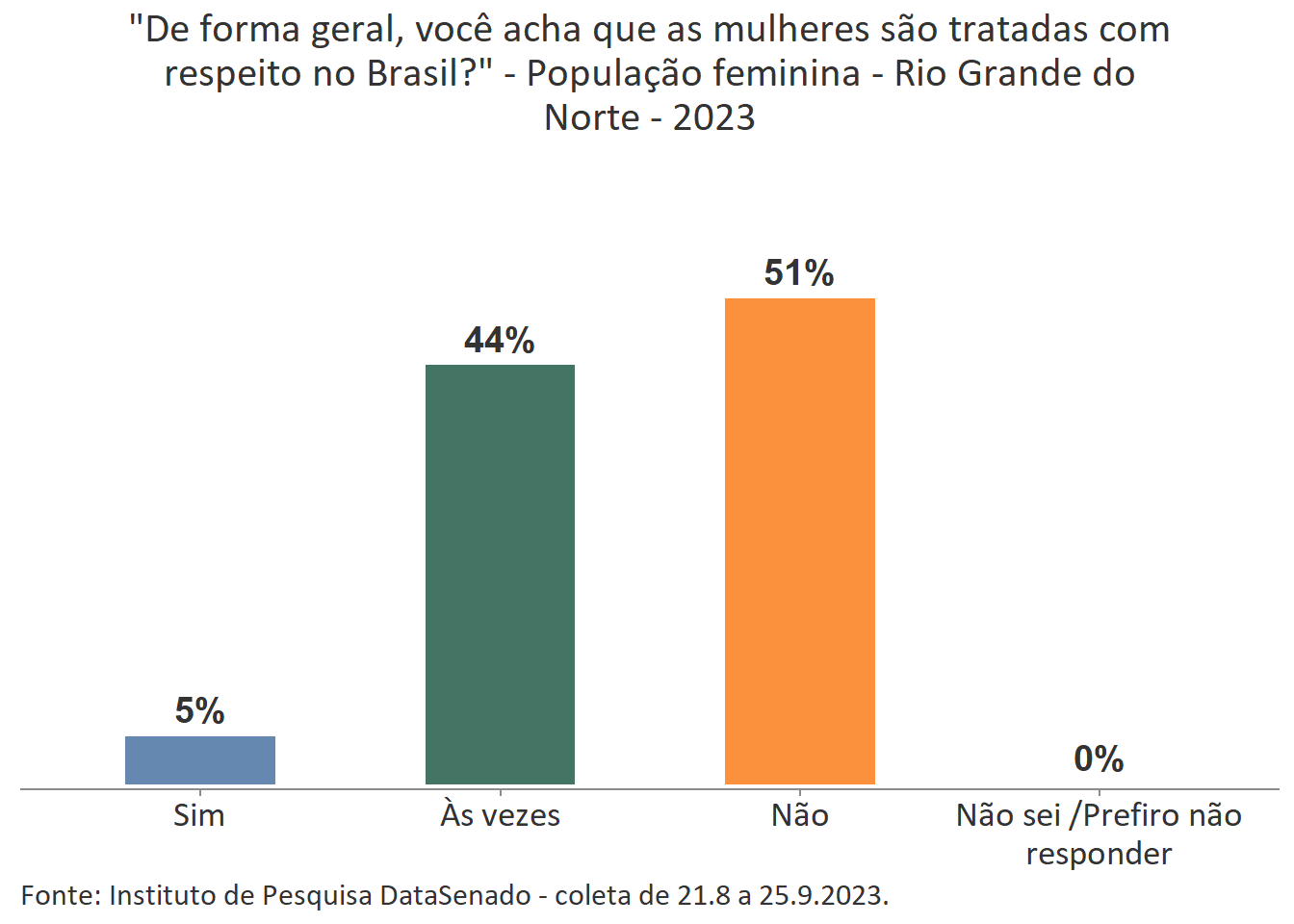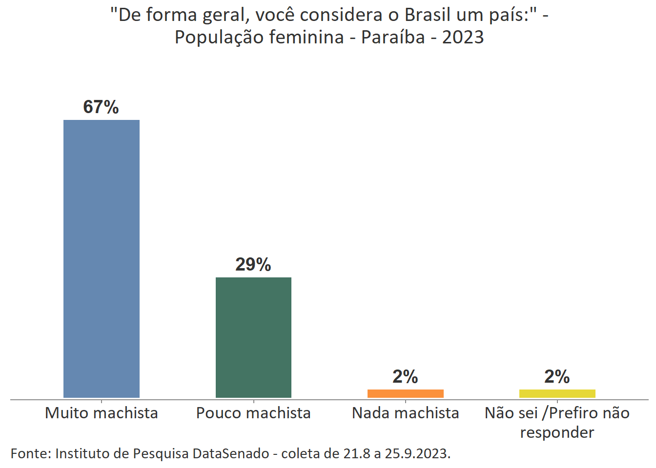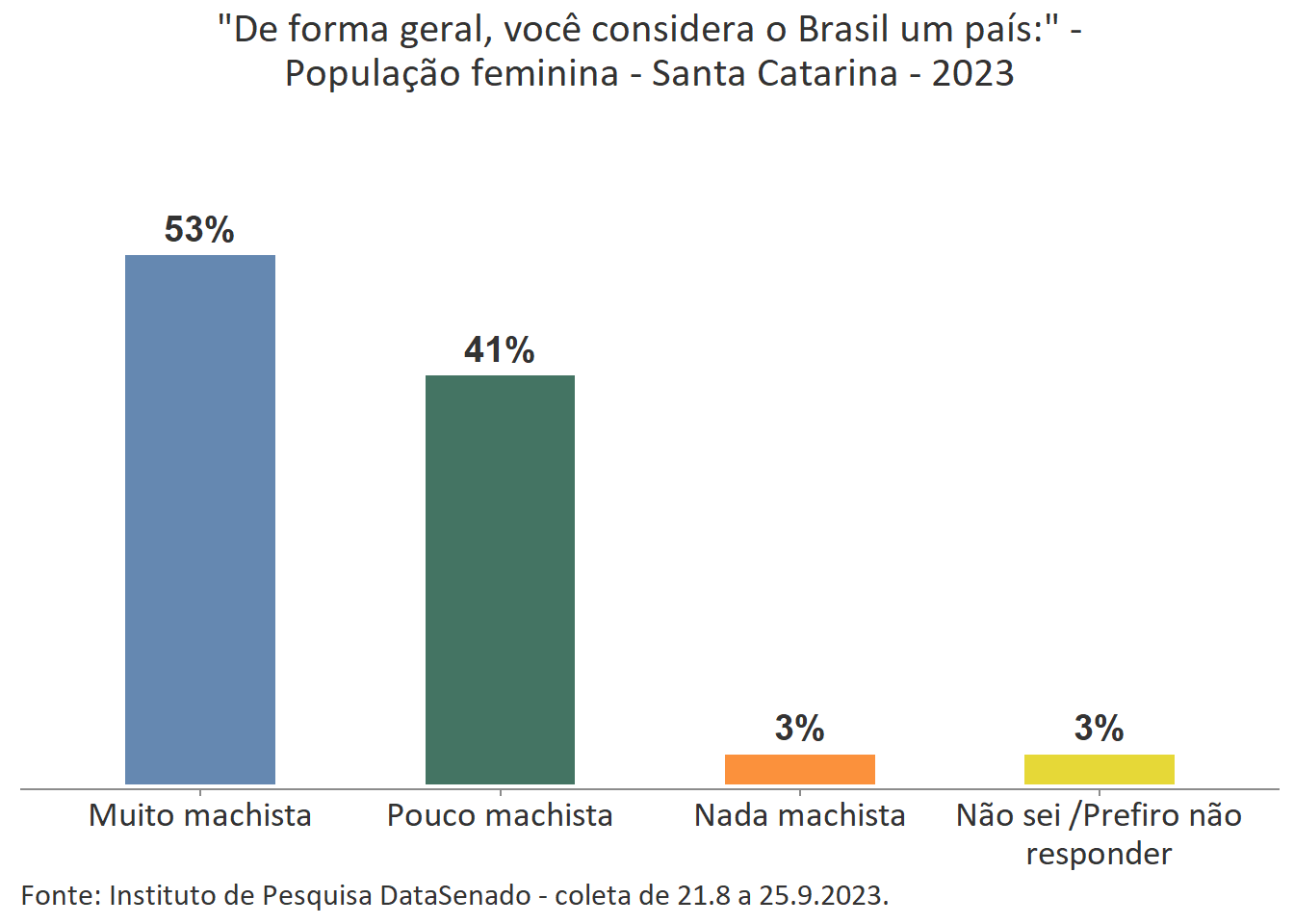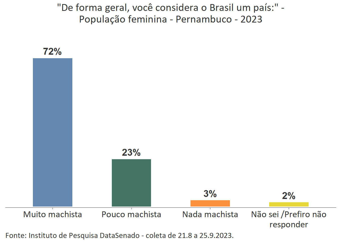 Pesquisa nacional realizada em 2023 pelo Instituto de Pesquisa DataSenado mostra que 46% das brasileiras acreditam que em geral as mulheres não são tratadas com respeito no Brasil, e que outras 46% acreditam que as mulheres são tratadas com respeito apenas às vezes. Para a menor parte delas (7%), as mulheres são, sim, tratadas com respeito no país.