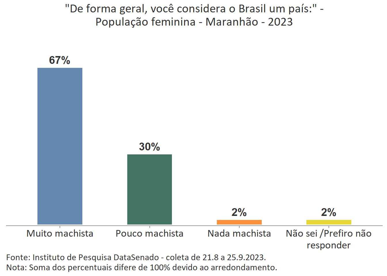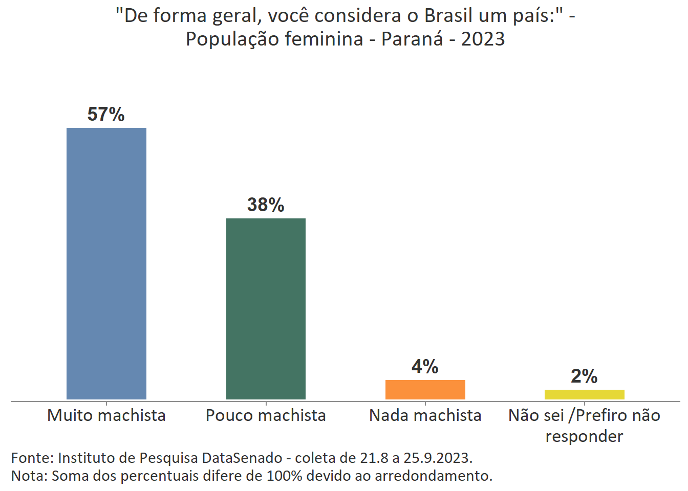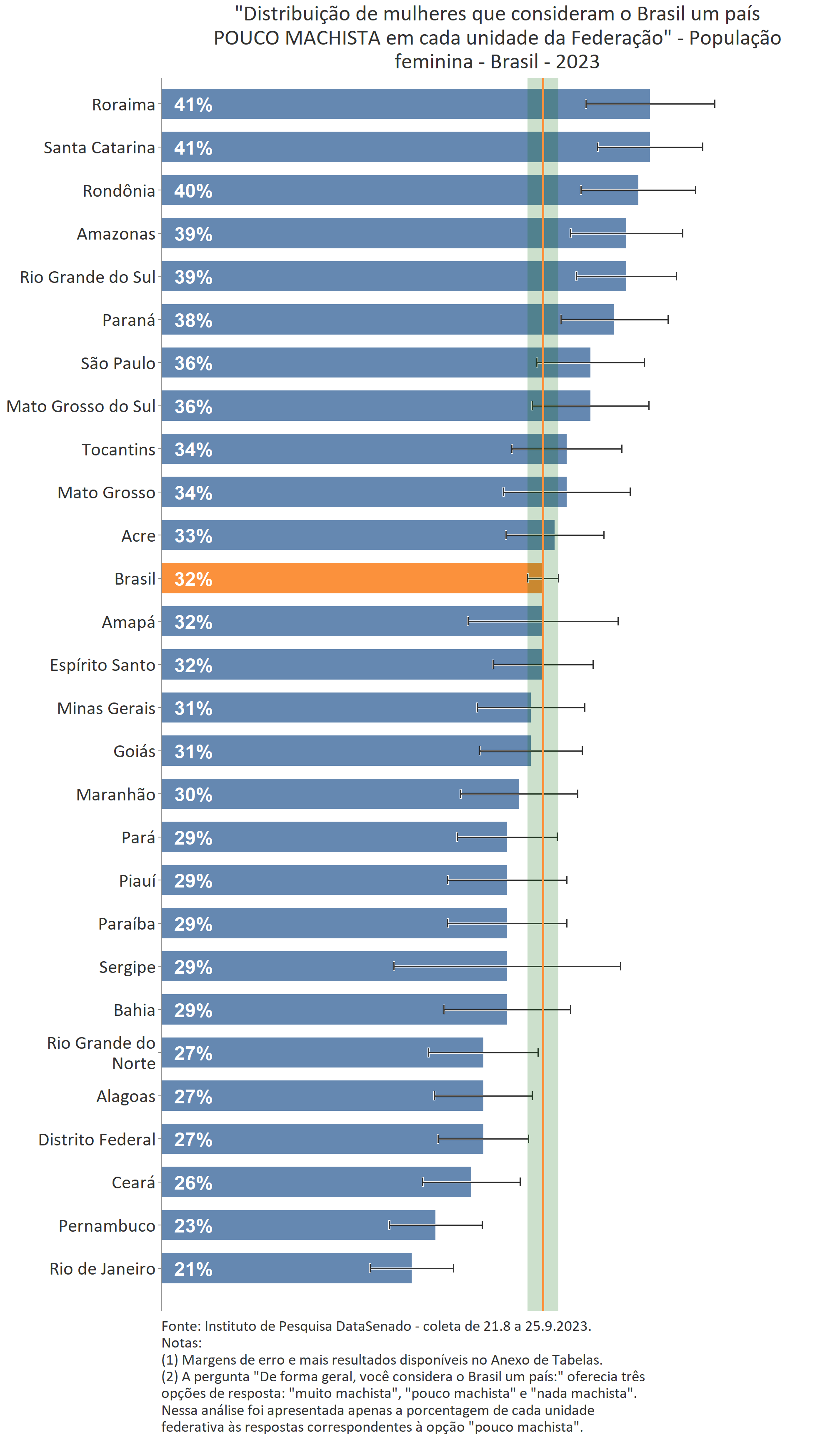 Para 32% das cidadãs, o Brasil é um país pouco machista. Esse índice é menor nos estados do Rio de Janeiro (21%), de Pernambuco (23%) e do Ceará (26%); maior nos estados do Paraná (38%), do Rio Grande do Sul (39%), do Amazonas (39%), de Rondônia (40%), de Santa Catarina (41%) e de Roraima (41%); e estatisticamente equivalente nas demais unidades federativas do país.