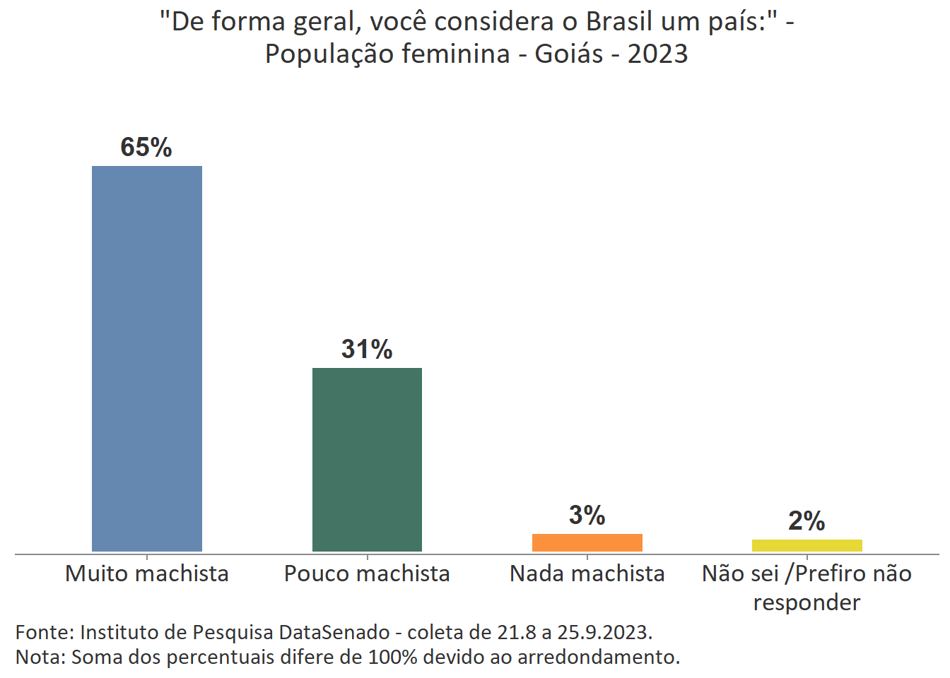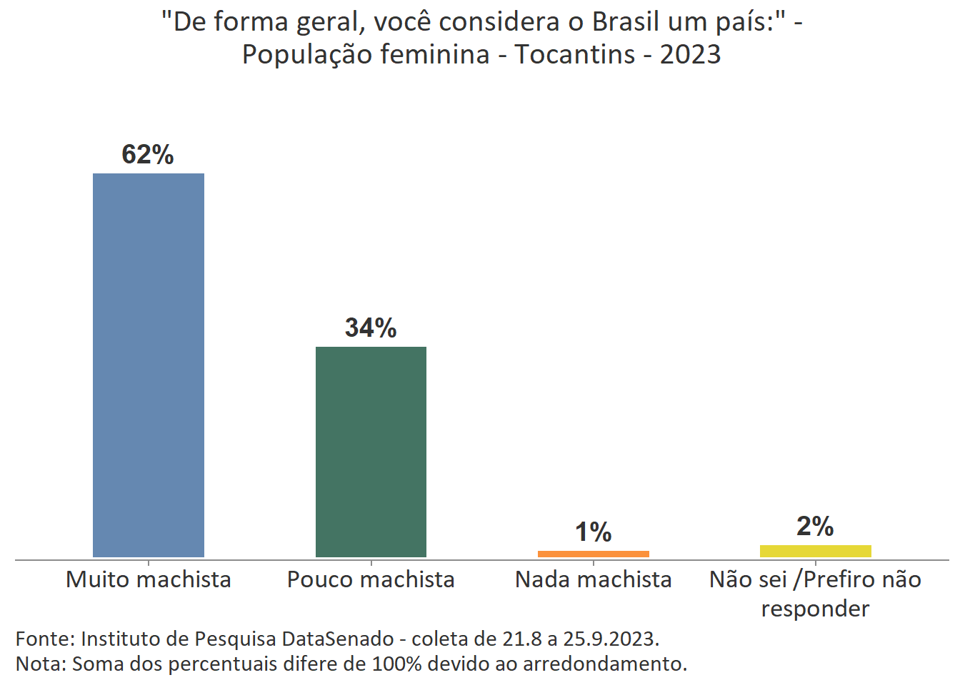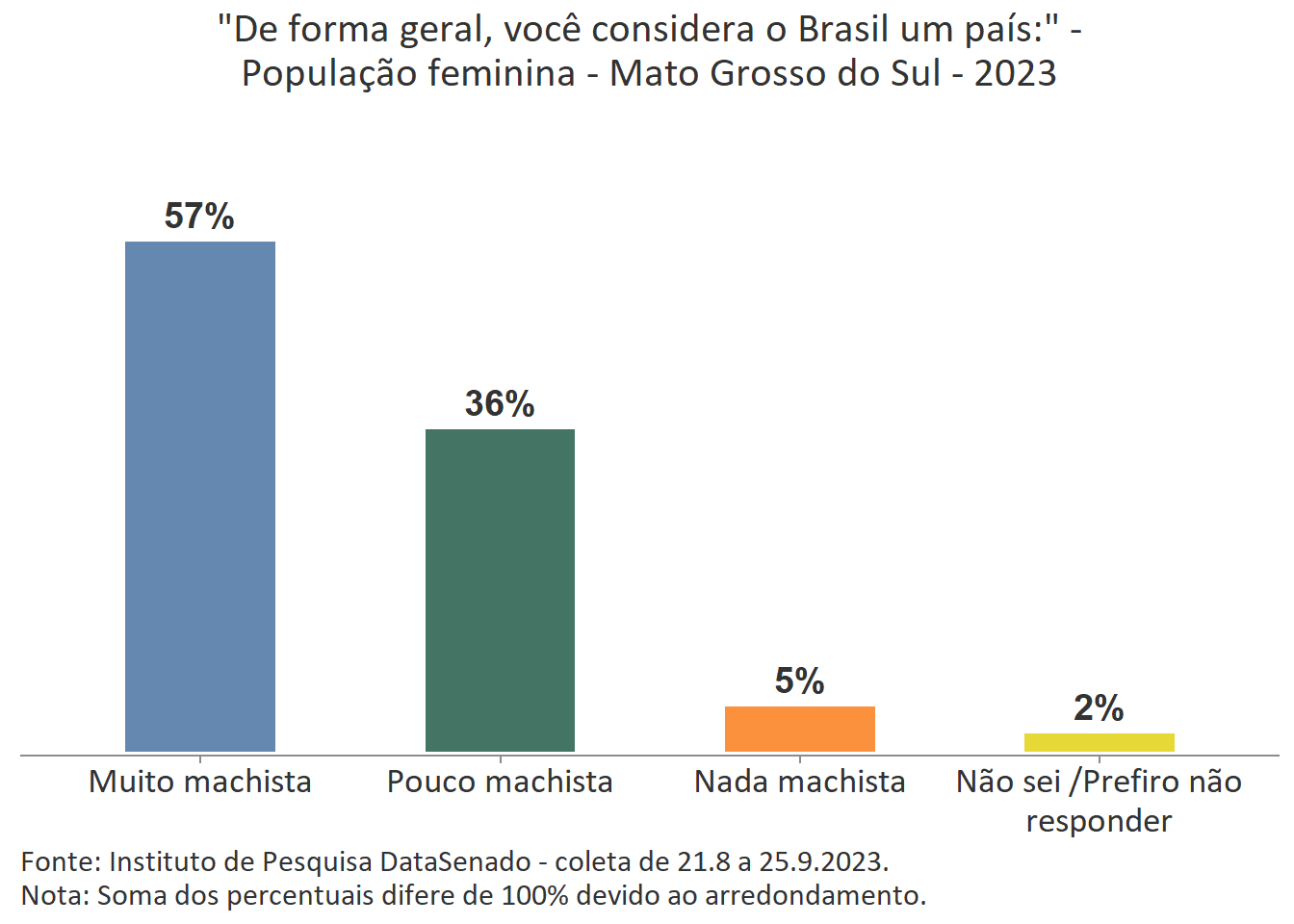 Para 32% das cidadãs, o Brasil é um país pouco machista. Esse índice é menor nos estados do Rio de Janeiro (21%), de Pernambuco (23%) e do Ceará (26%); maior nos estados do Paraná (38%), do Rio Grande do Sul (39%), do Amazonas (39%), de Rondônia (40%), de Santa Catarina (41%) e de Roraima (41%); e estatisticamente equivalente nas demais unidades federativas do país.