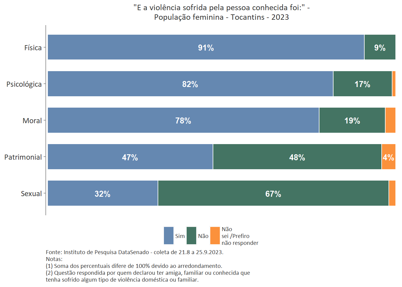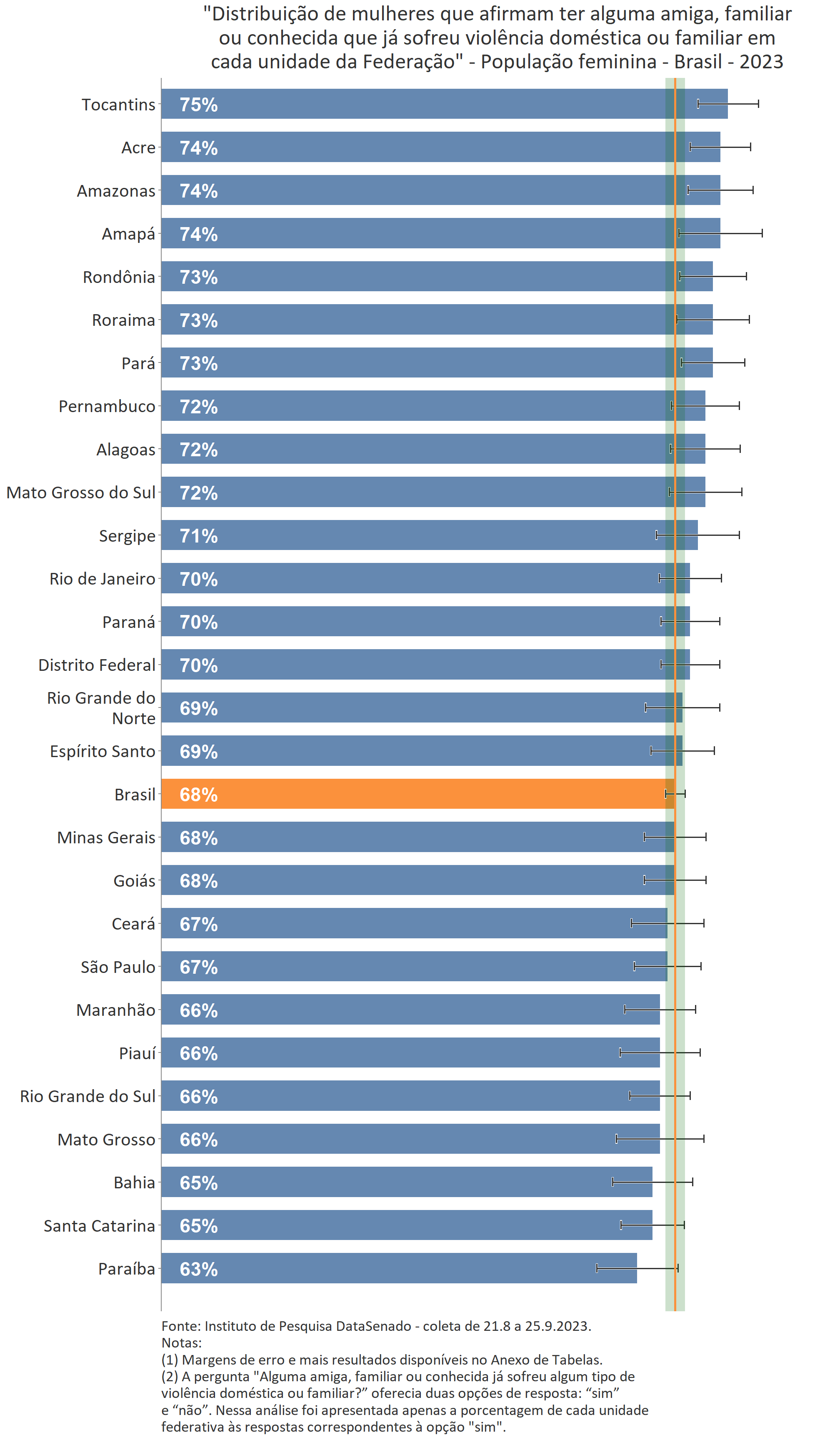 O levantamento nacional mostra que 68% das brasileiras tem uma amiga, familiar ou conhecida que já sofreu violência doméstica. Esse índice é ainda maior entre as tocantinenses (75%), acreanas (74%) e amazonenses (74%).