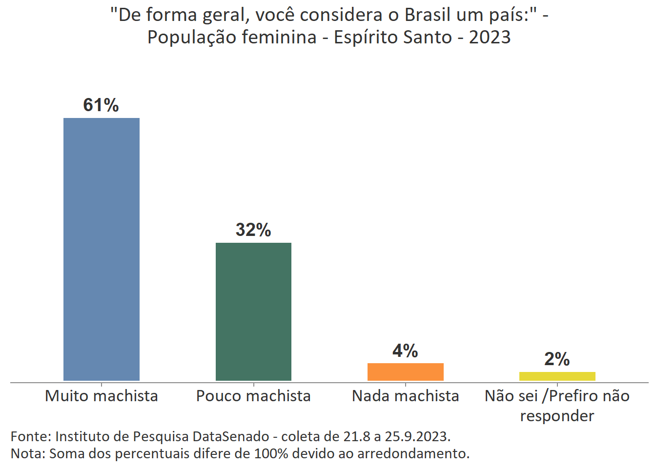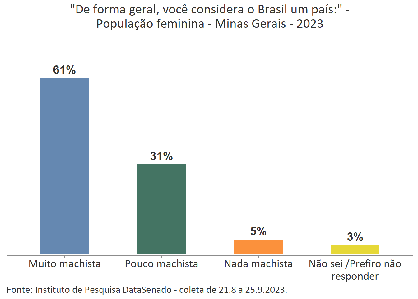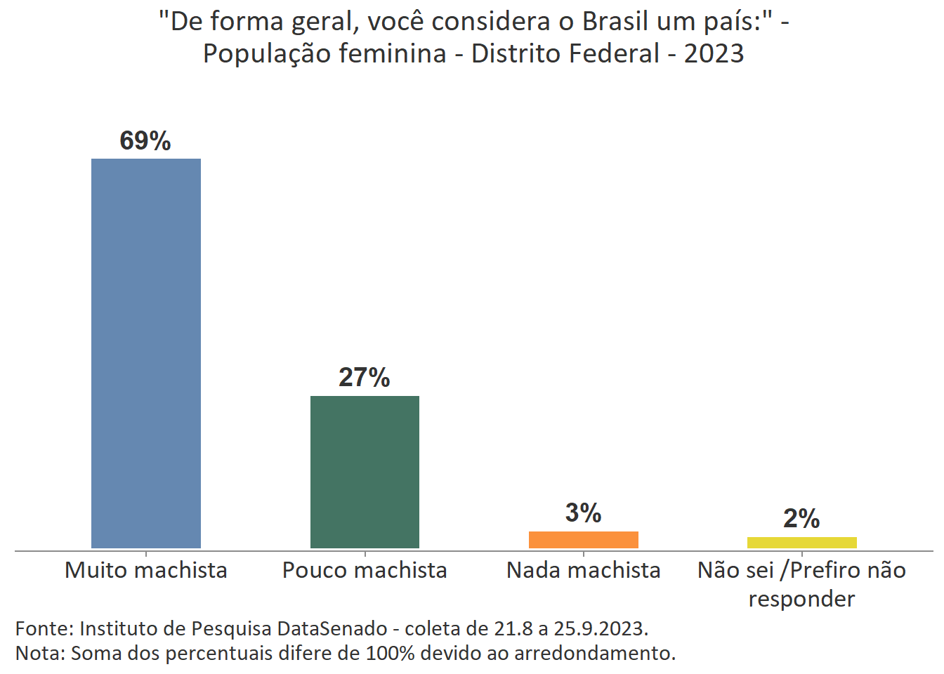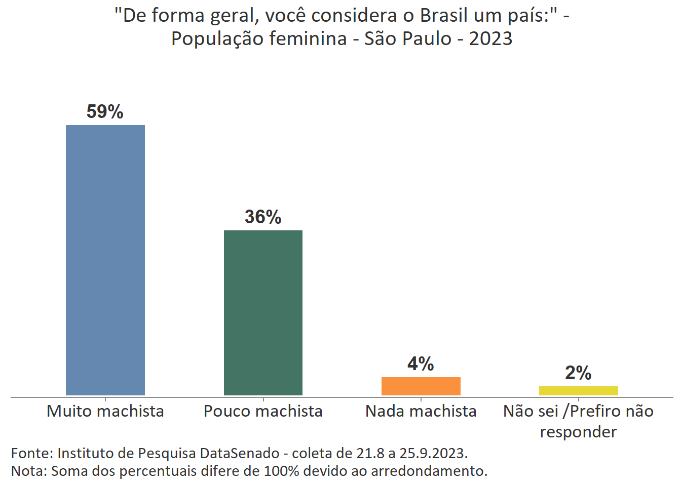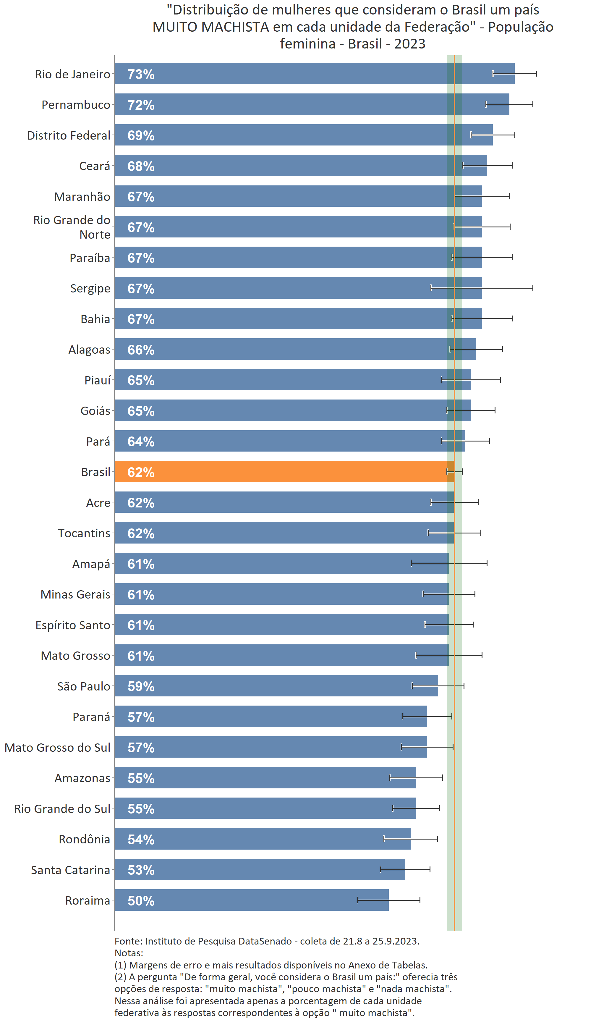 A percepção feminina majoritária é a de que o Brasil é um país muito machista. Comparando o patamar nacional (62%) com o patamar das unidades federativas, percebe-se que há variações nos índices obtidos em nove delas. Entre aquelas em que o patamar é maior que o nacional estão os estados do Rio de Janeiro (73%), de Pernambuco (72%), do Ceará (68%) e o Distrito Federal (69%). Entre os estados que apresentam índices menores que o país como um todo estão os estados do Amazonas (55%), do Rio Grande do Sul (55%), de Rondônia (54%), de Santa Catarina (53%) e de Roraima (50%). Para as demais unidades federativas a percepção de que o Brasil é um país muito machista tem valores estatisticamente equivalentes aos encontrados na pesquisa nacional.
