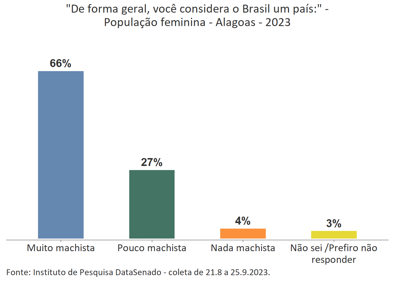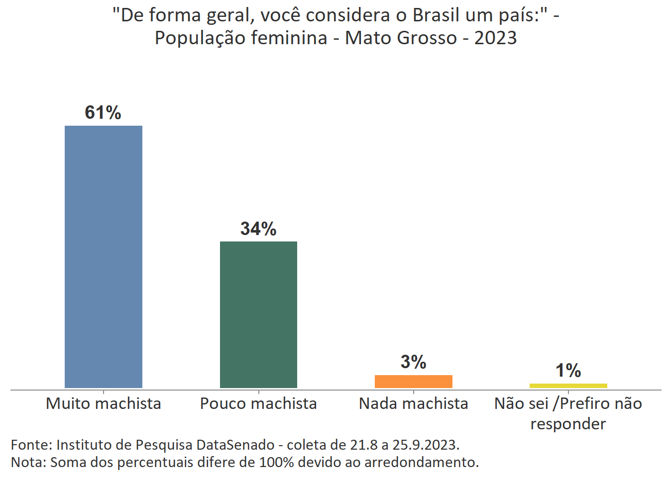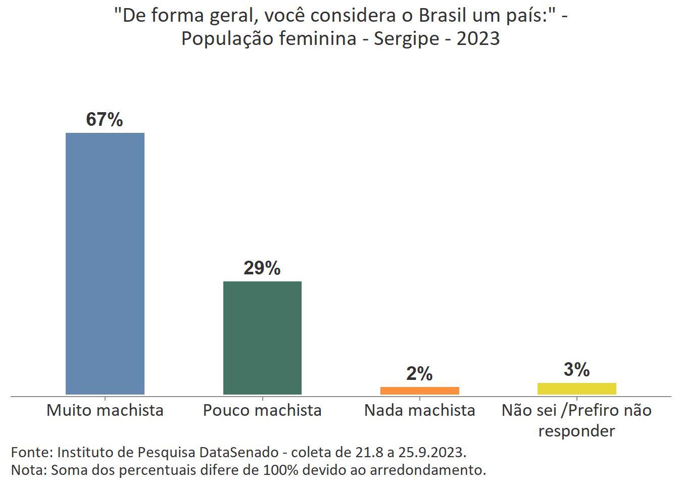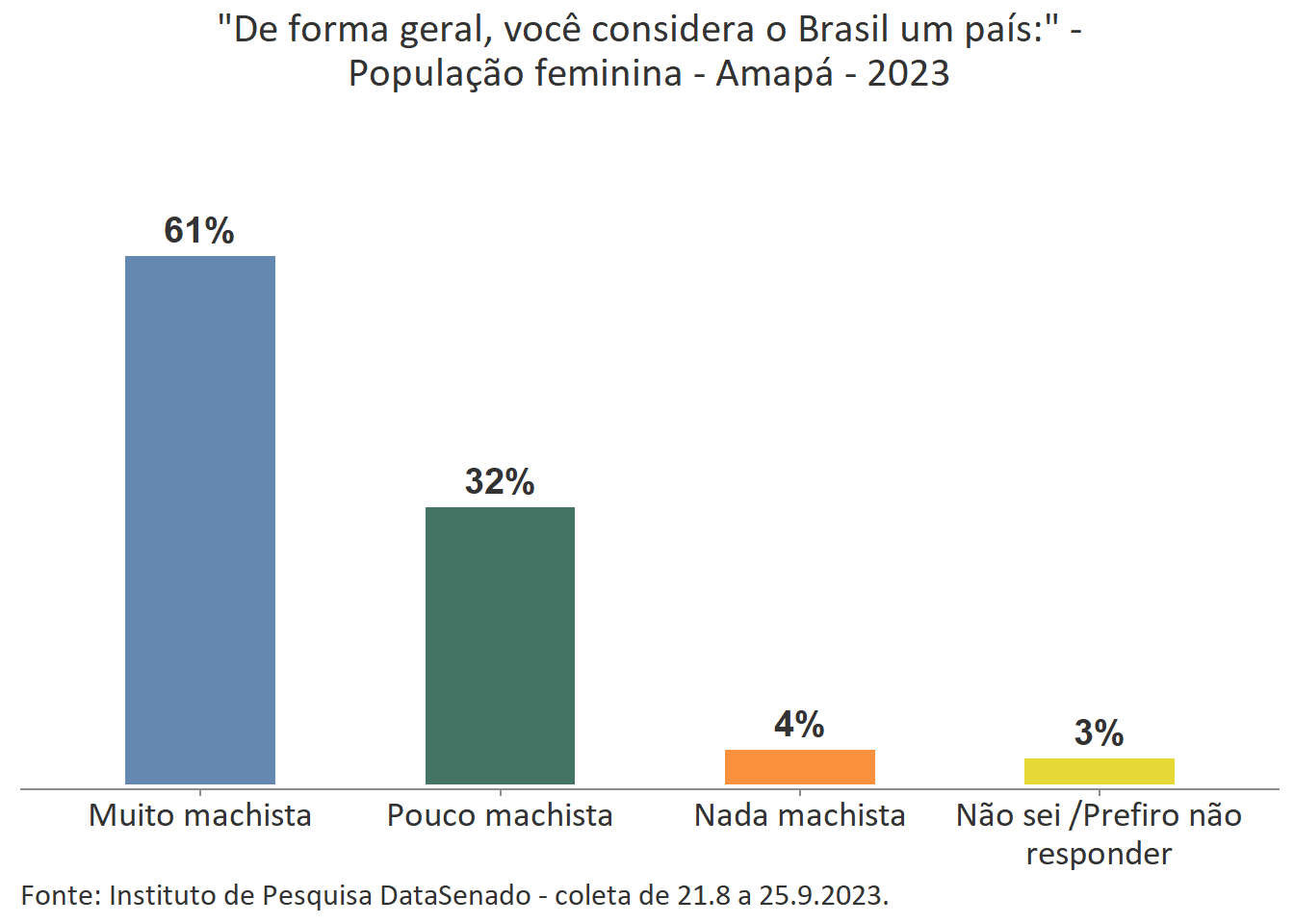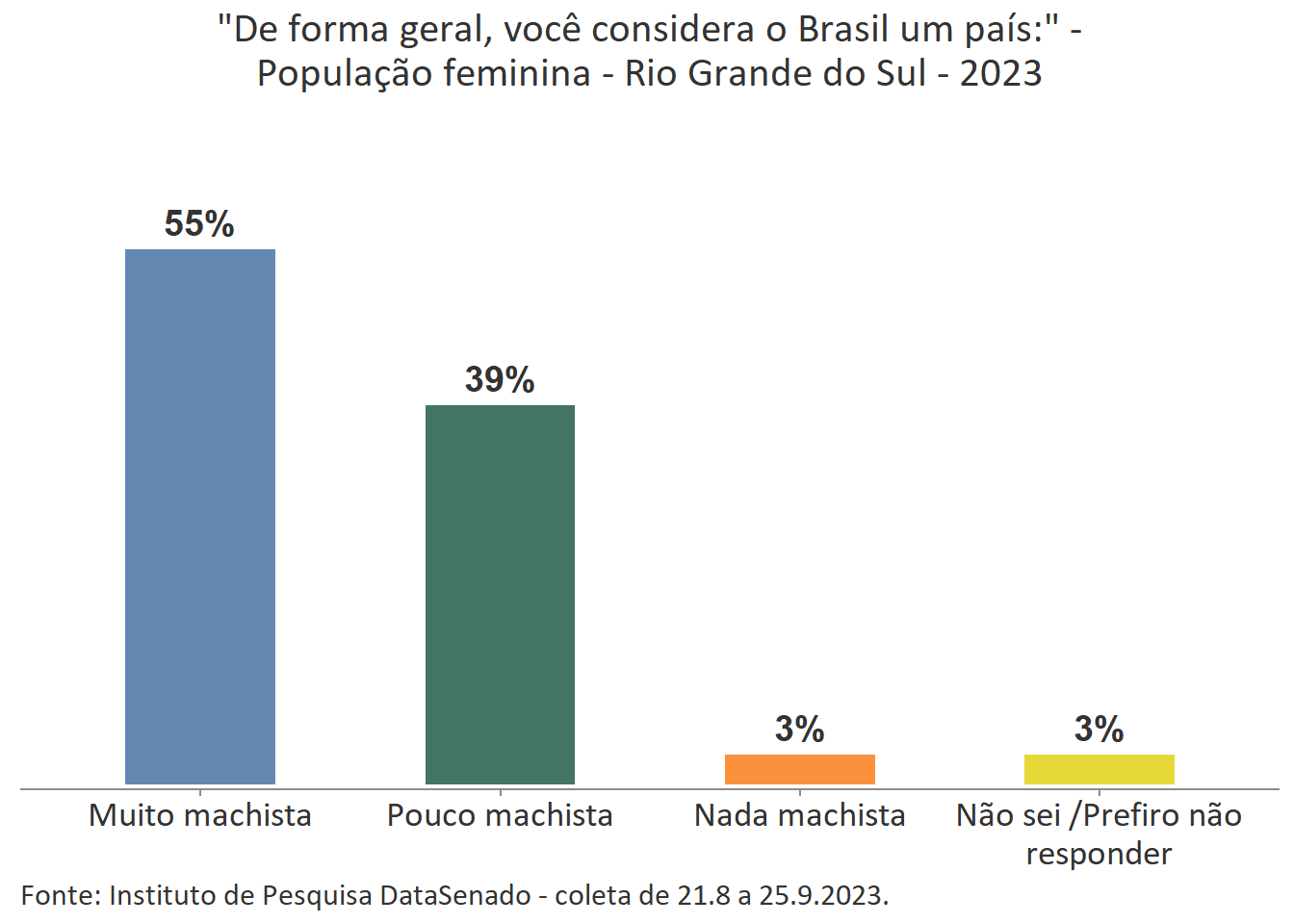 A percepção feminina majoritária é a de que o Brasil é um país muito machista. Comparando o patamar nacional (62%) com o patamar das unidades federativas, percebe-se que há variações nos índices obtidos em nove delas. Entre aquelas em que o patamar é maior que o nacional estão os estados do Rio de Janeiro (73%), de Pernambuco (72%), do Ceará (68%) e o Distrito Federal (69%). Entre os estados que apresentam índices menores que o país como um todo estão os estados do Amazonas (55%), do Rio Grande do Sul (55%), de Rondônia (54%), de Santa Catarina (53%) e de Roraima (50%). Para as demais unidades federativas a percepção de que o Brasil é um país muito machista tem valores estatisticamente equivalentes aos encontrados na pesquisa nacional.