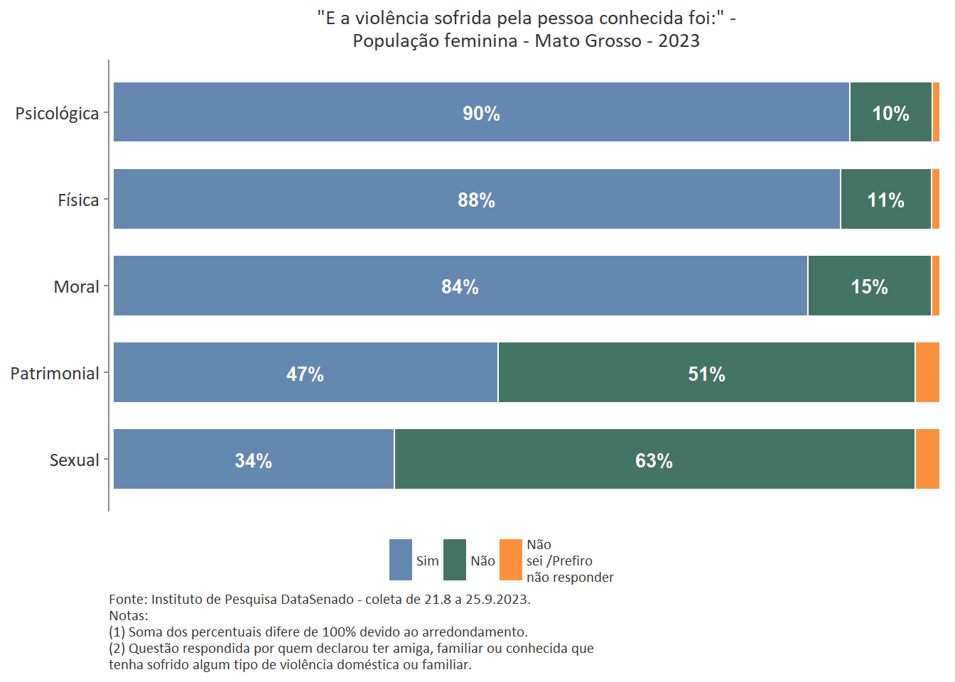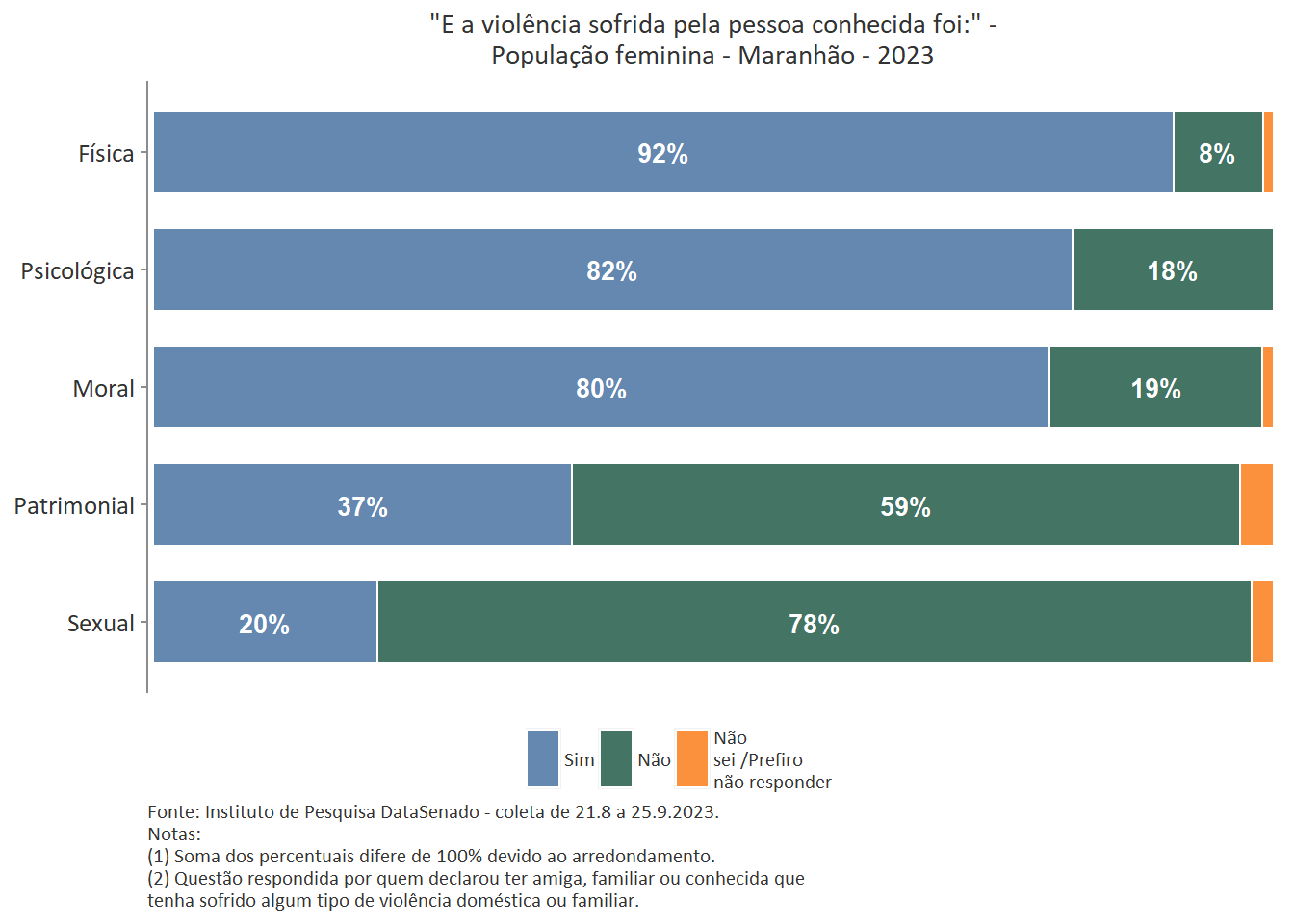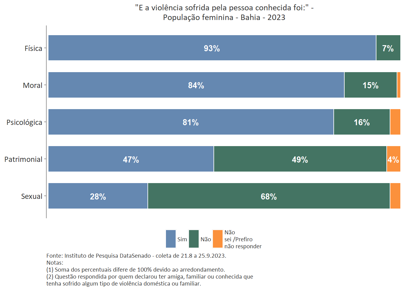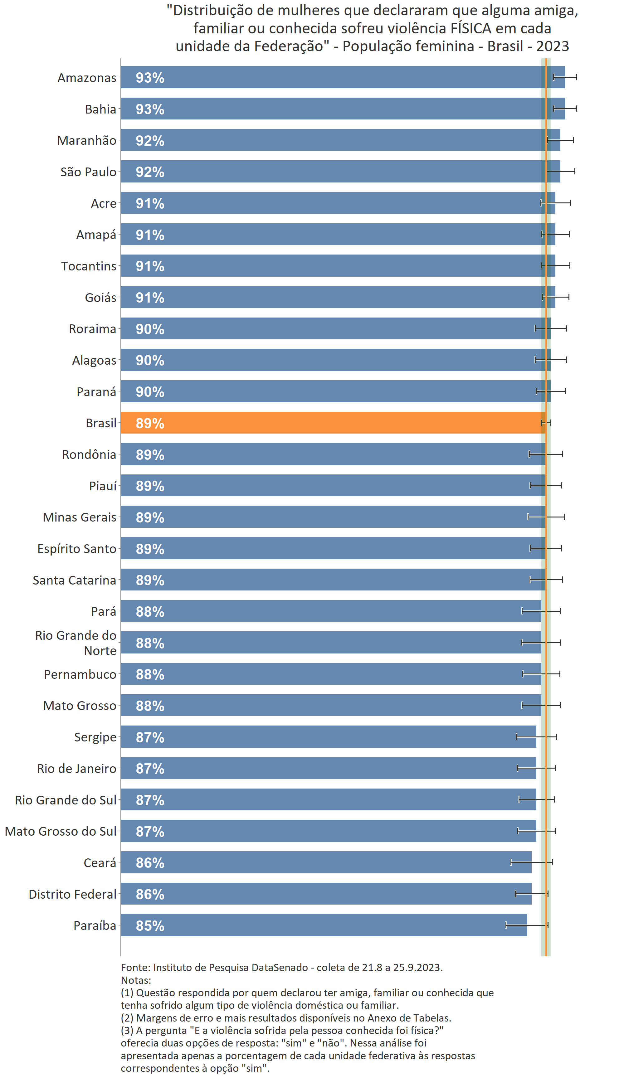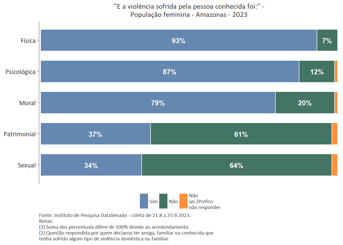 Quanto ao tipo de violência sofrida pela pessoa conhecida, a mais predominante é a violência física, reportada por 89% das brasileiras. Entre as amazonenses e as baianas esse patamar chega a 93%. Nas demais unidades federativas, o índice é estatisticamente equivalente ao nacional.