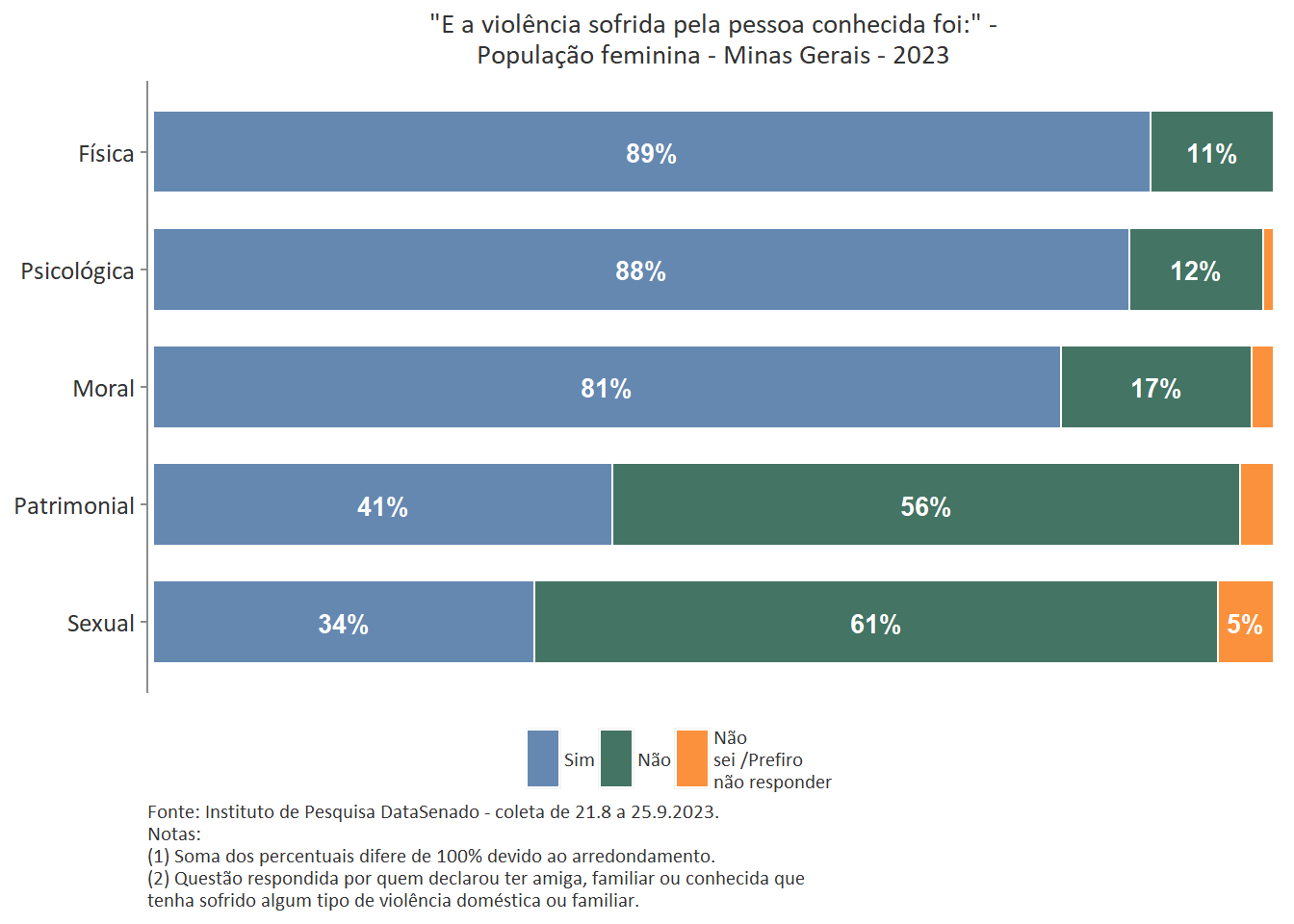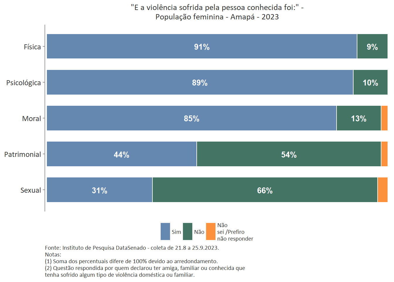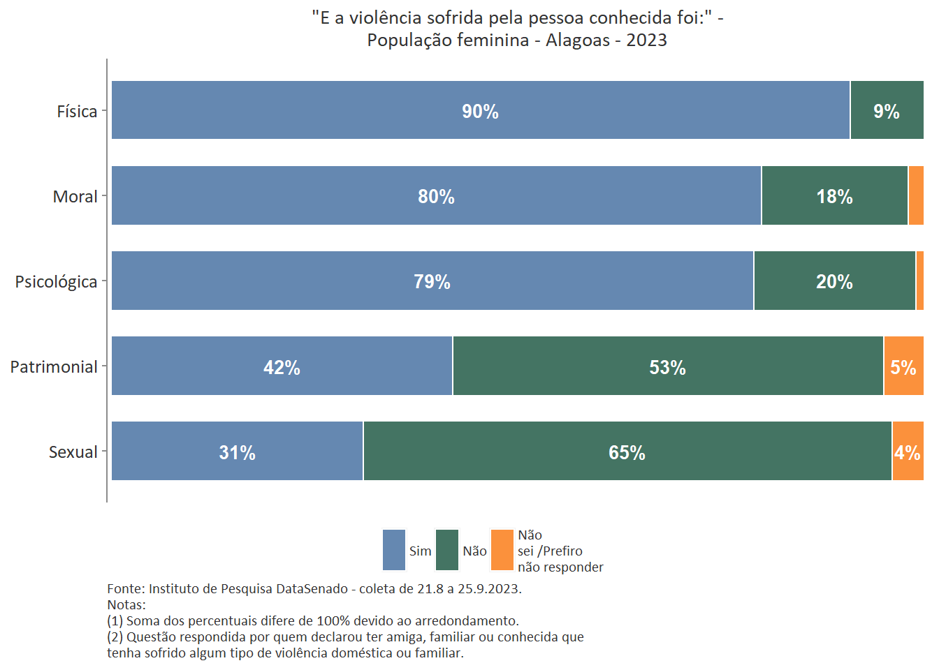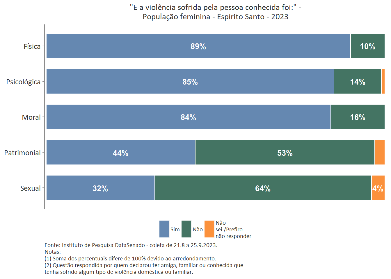 Quanto ao tipo de violência sofrida pela pessoa conhecida, a mais predominante é a violência física, reportada por 89% das brasileiras. Entre as amazonenses e as baianas esse patamar chega a 93%. Nas demais unidades federativas, o índice é estatisticamente equivalente ao nacional.
